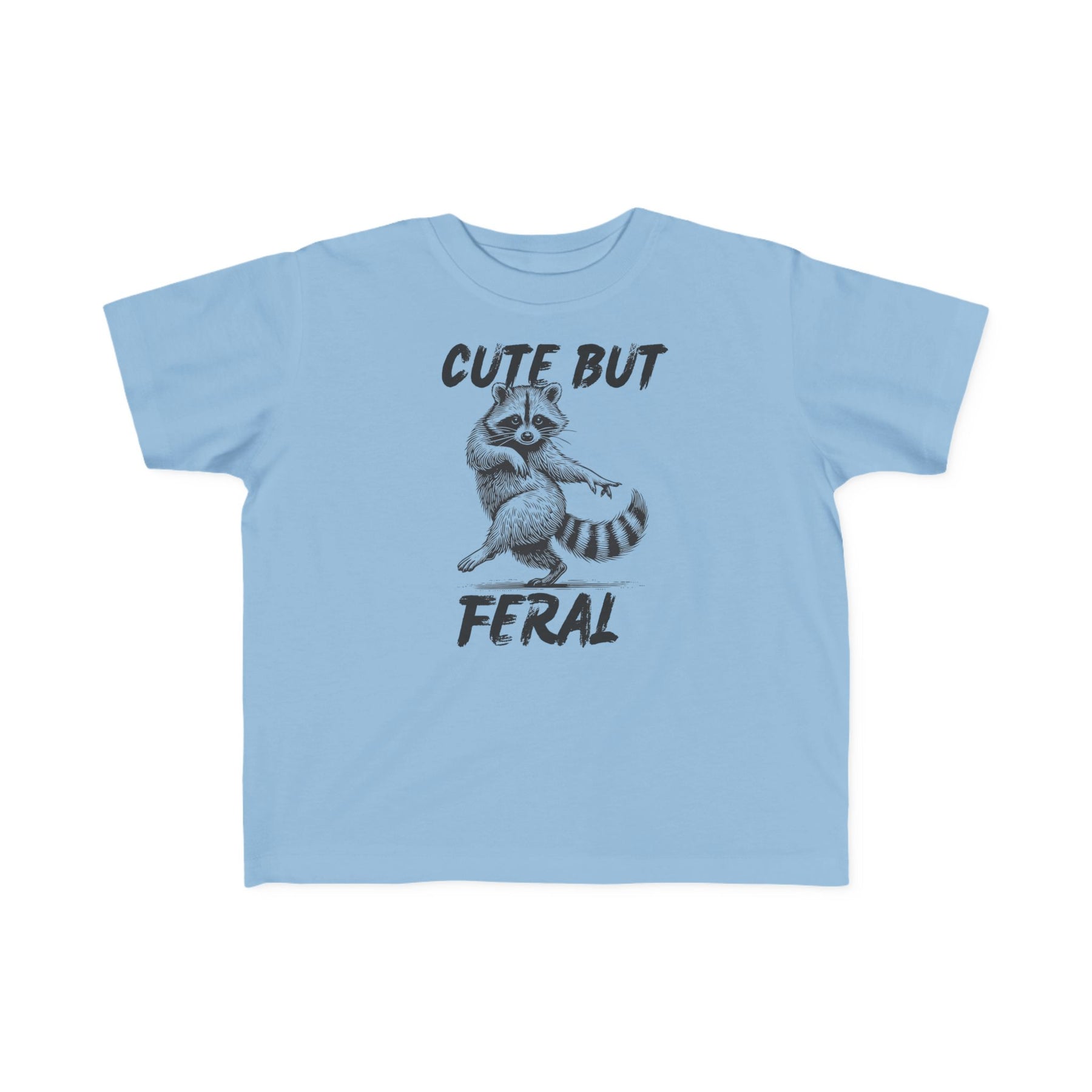 Cute but Feral Toddler Tee: Light-blue T-shirt with hand-drawn raccoon and bold “CUTE BUT FERAL” text, perfect for toddlers' sensitive skin.