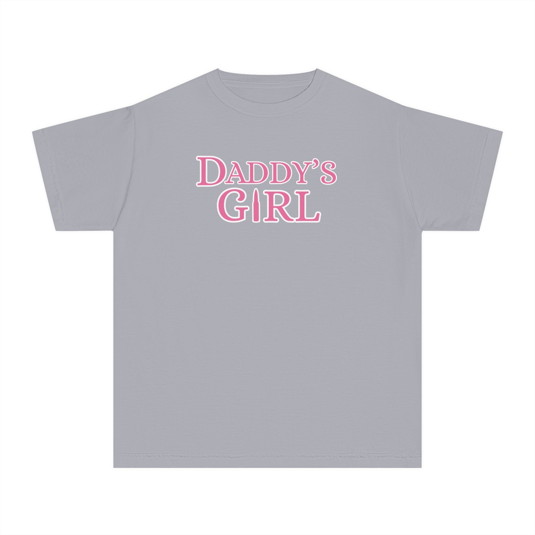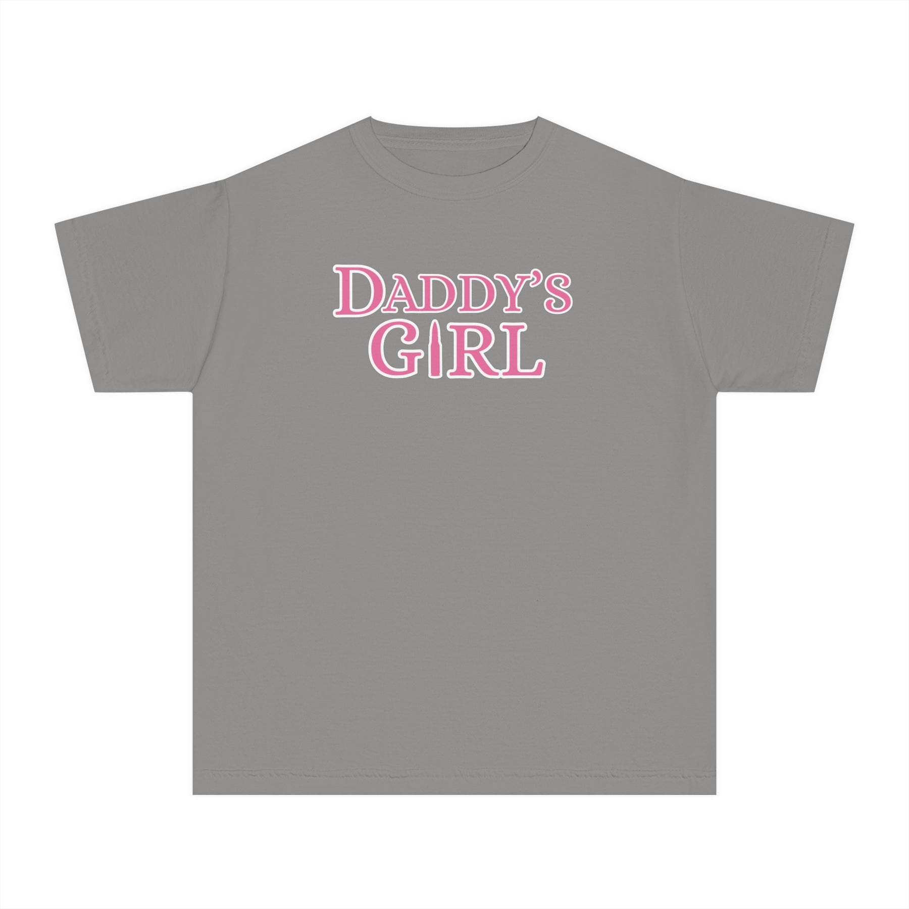 Daddy's Girl Kids Tee: A grey t-shirt featuring pink text, designed for comfort and agility, made from 100% combed ring-spun cotton with a classic fit.