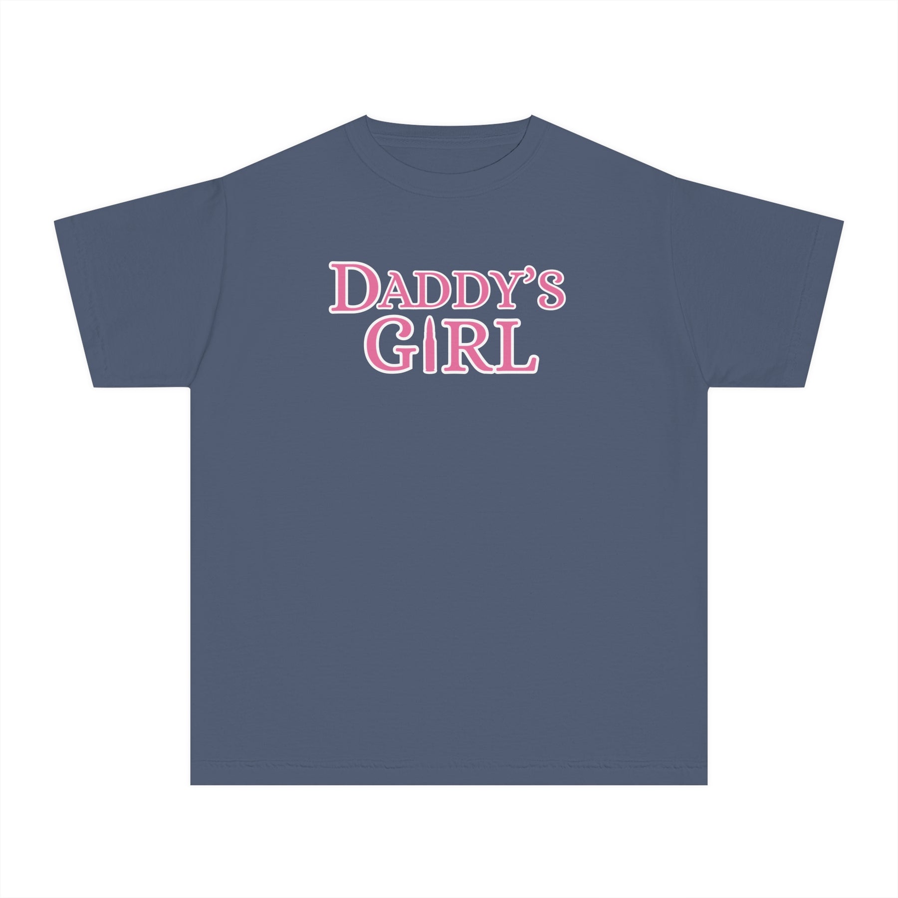 The Daddy's Girl Kids Tee is a blue t-shirt featuring pink text, designed for comfort and agility with 100% combed ring-spun cotton, ideal for active kids.