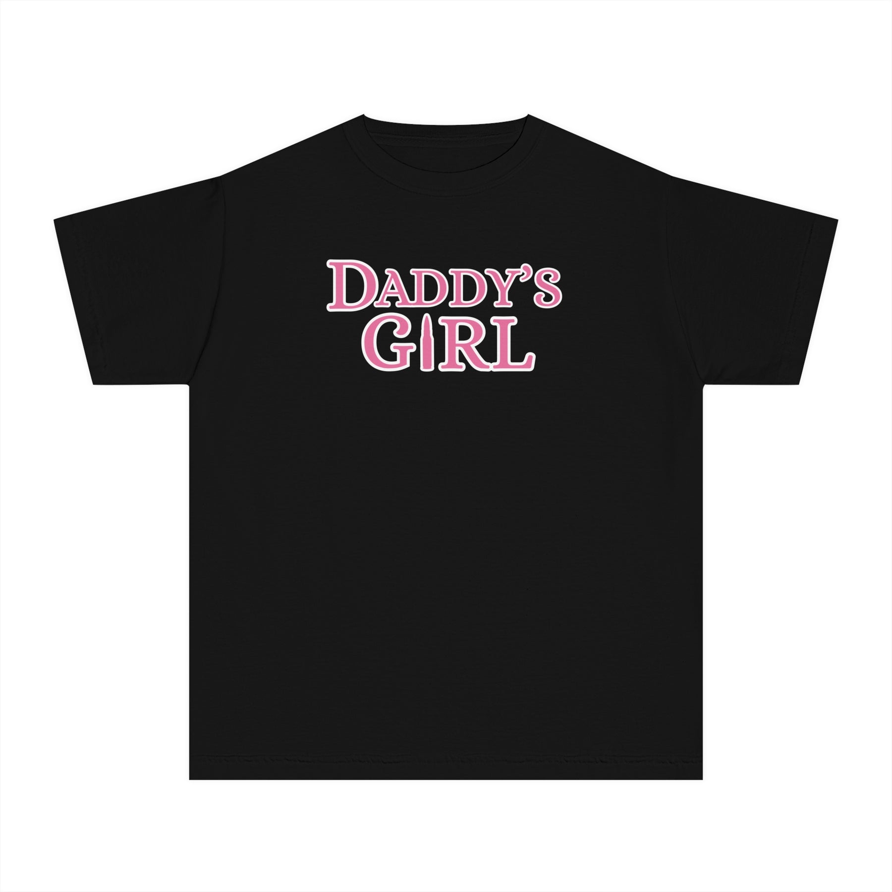 Daddy's Girl Kids Tee featuring pink text on a white t-shirt, designed for comfort and agility with 100% combed ringspun cotton and a classic fit.