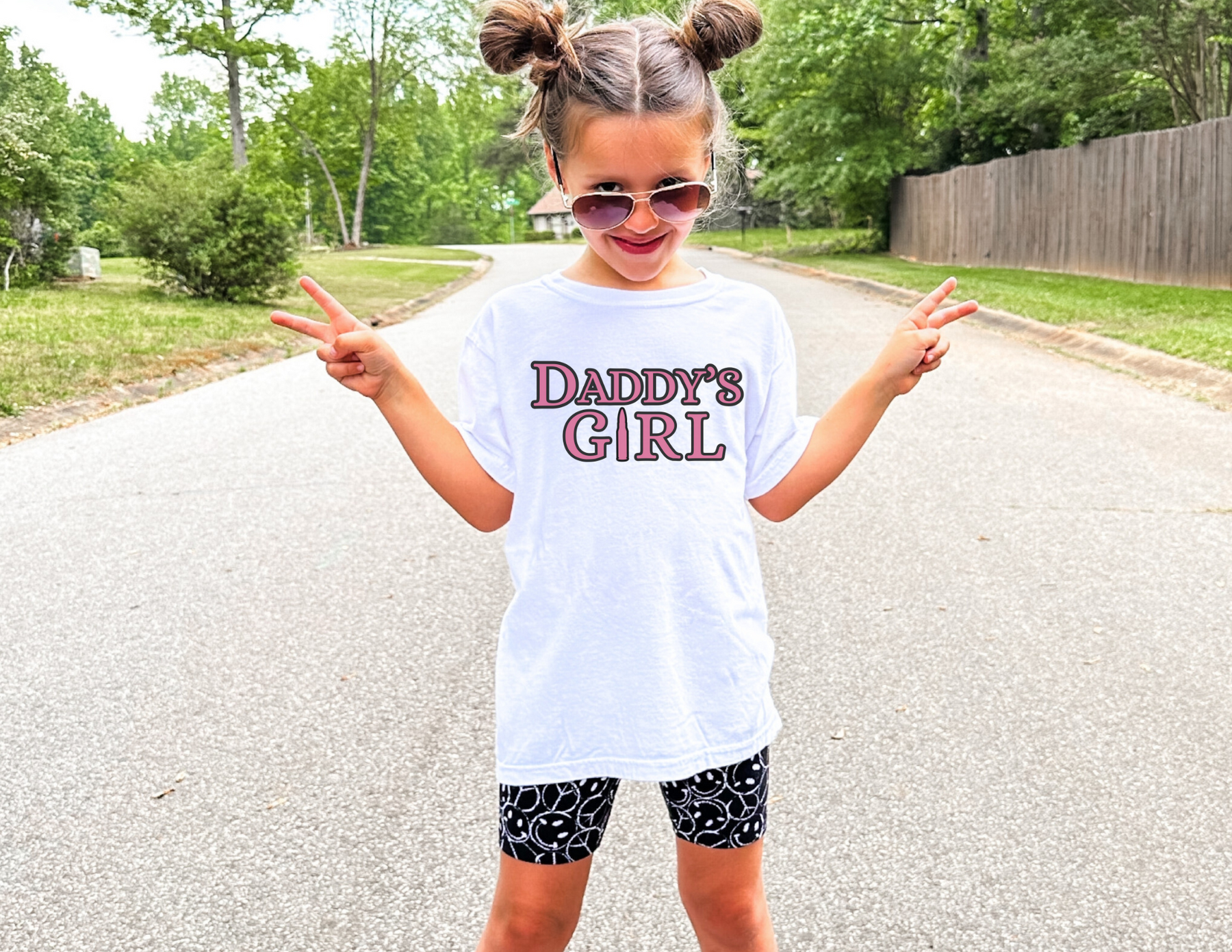Child wearing Daddy's Girl Kids Tee, white shirt, outdoors. The tee offers comfort from 100% combed ring-spun cotton, perfect for active kids.