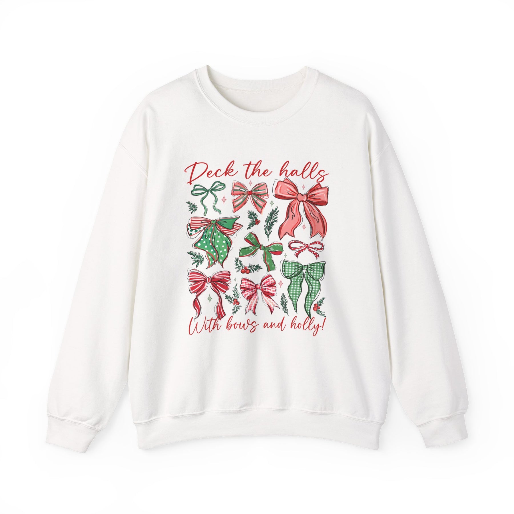 Deck the Halls Crew: A white sweatshirt featuring festive bows and holly design, perfect for cozy, stylish warmth during the holidays.