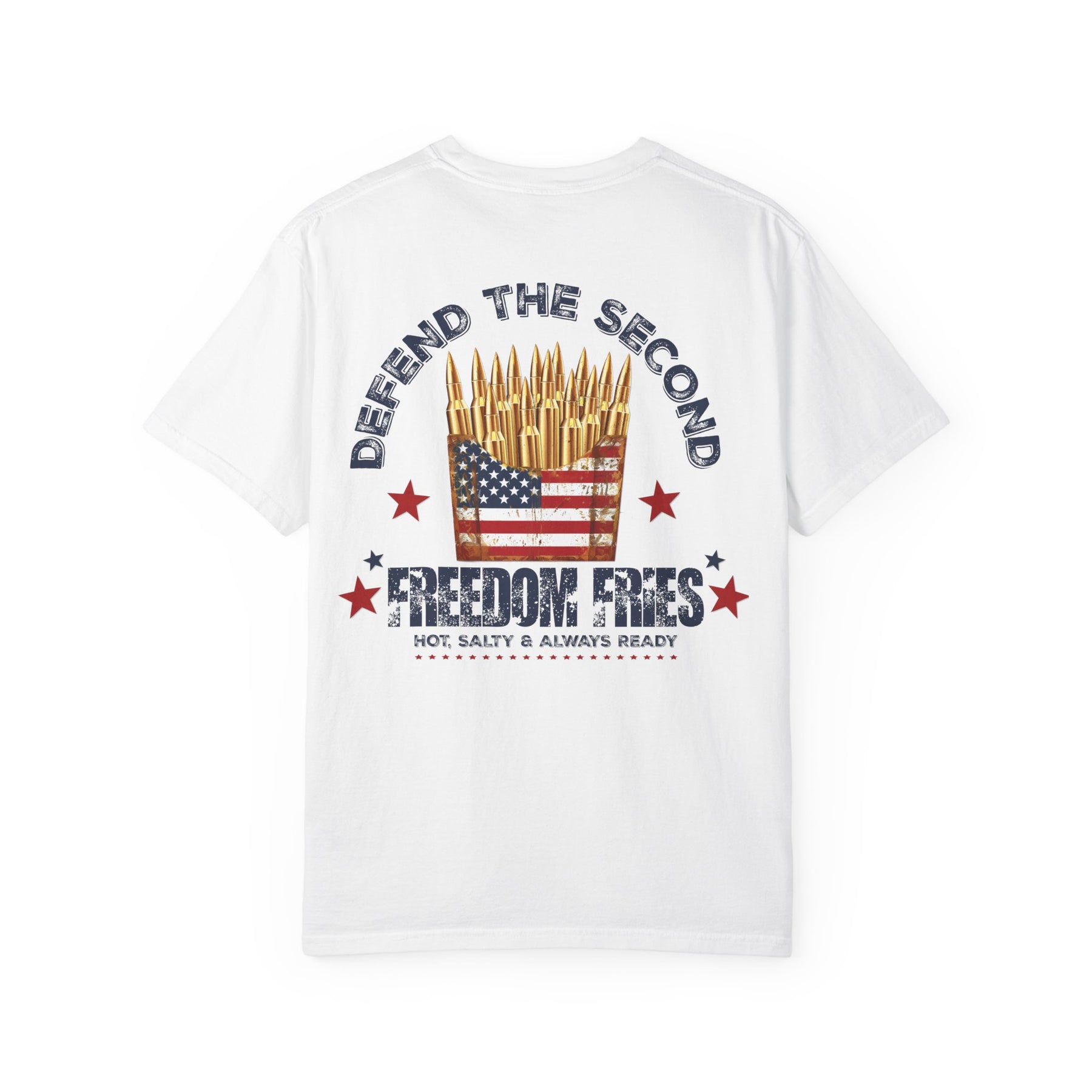 Defend the 2nd Tee, a customizable, garment-dyed t-shirt made from 100% ring-spun cotton, featuring a relaxed fit and durable stitching.