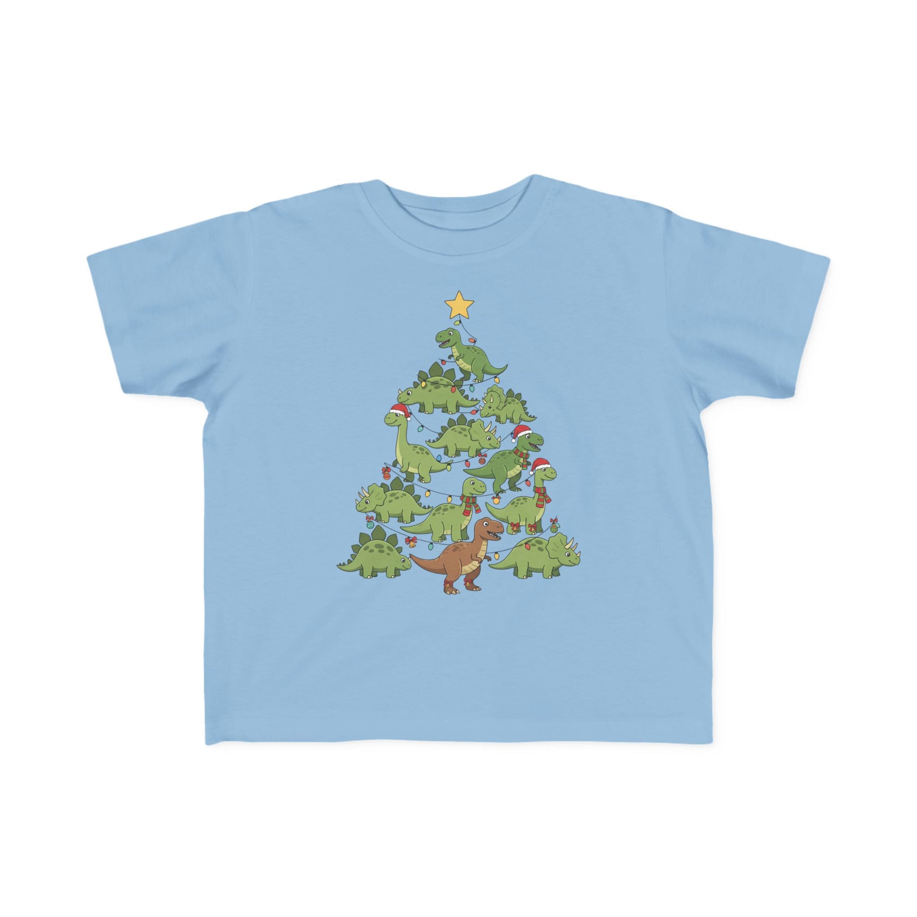 Dino Tree Toddler Tee: A whimsical toddler T-shirt featuring cartoon dinosaurs forming a Christmas tree with lights, ornaments, and a star, perfect for sensitive skin.