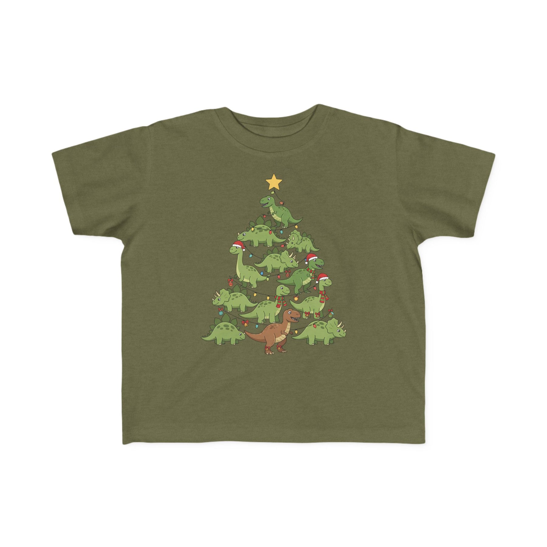 Dino Tree Toddler Tee featuring cartoon dinosaurs stacked as a Christmas tree, adorned with lights, ornaments, scarves, and a gold star on an olive-green T-shirt.