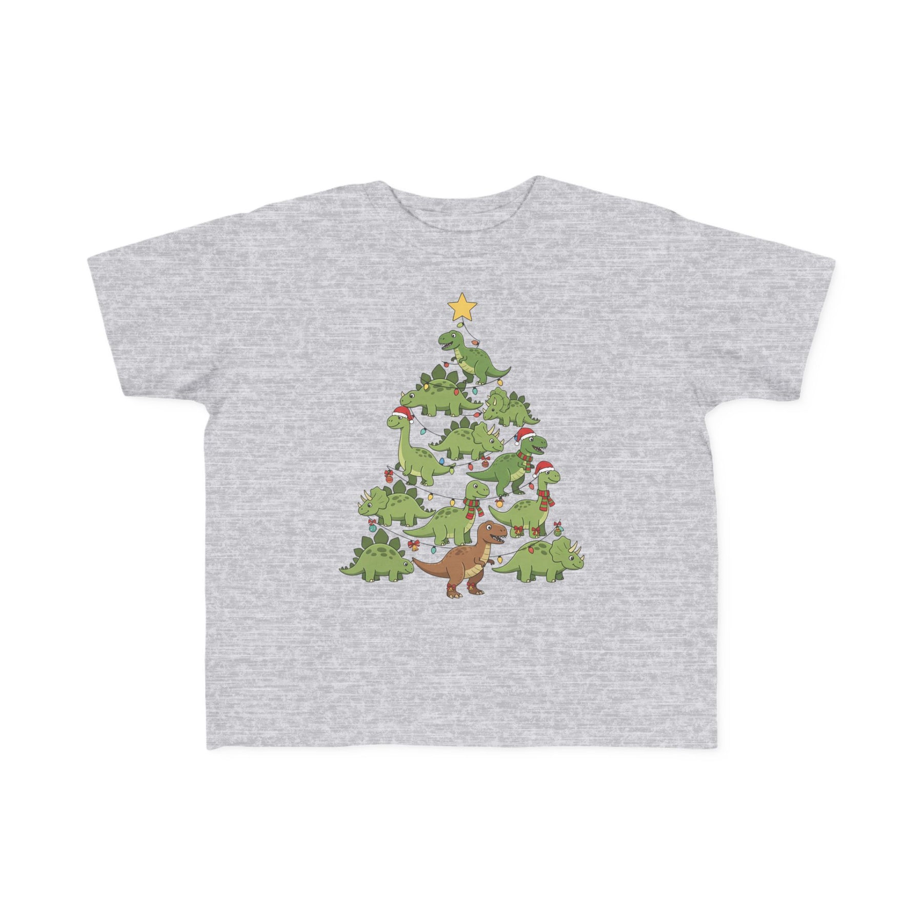 Dino Tree Toddler Tee: Light-gray T-shirt featuring cartoon dinosaurs forming a Christmas tree, adorned with lights, ornaments, Santa hats, and topped with a star.