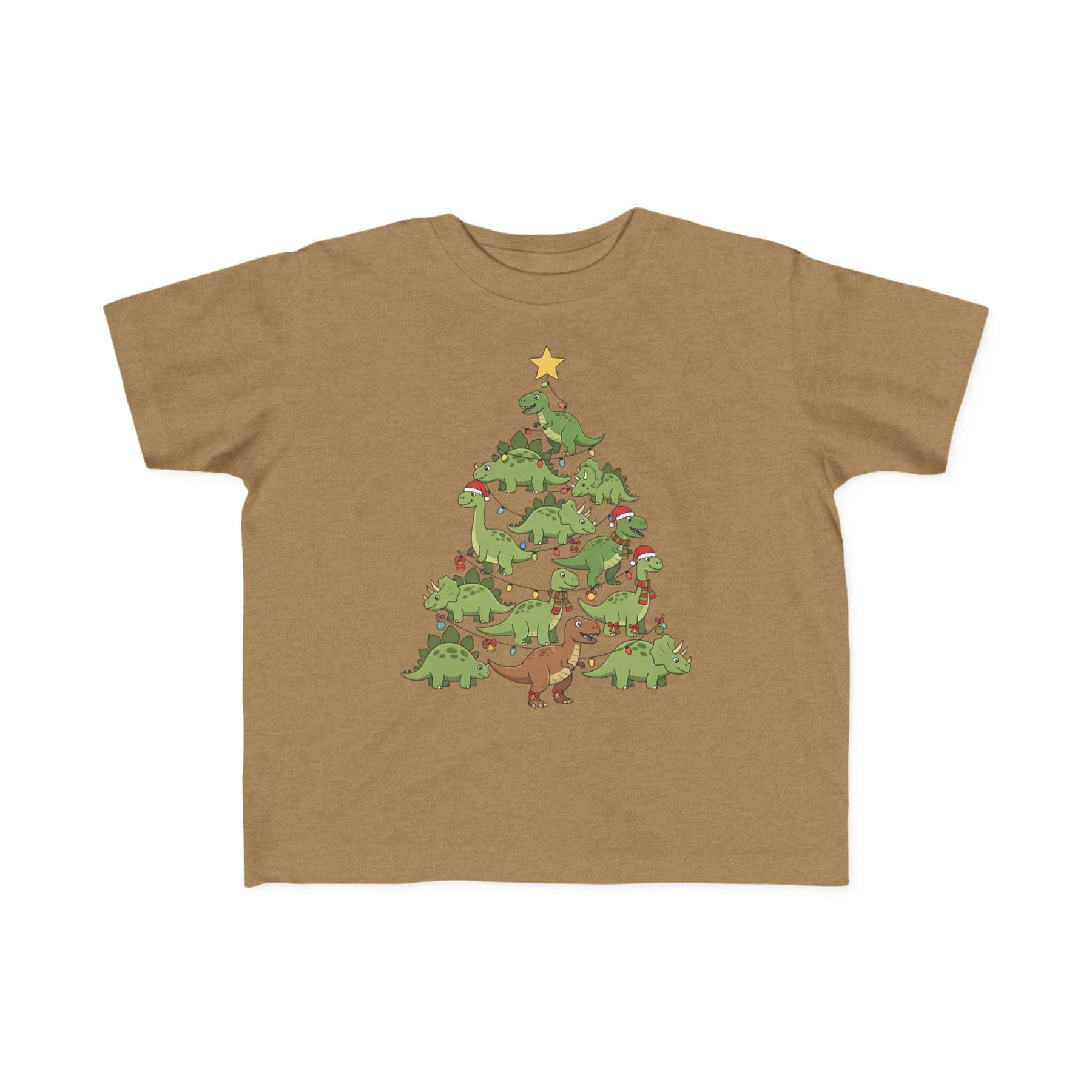 Dino Tree Toddler Tee with playful dinosaur Christmas tree design, featuring cartoon dinos adorned with lights and hats, on a soft, durable cotton fabric perfect for toddlers.