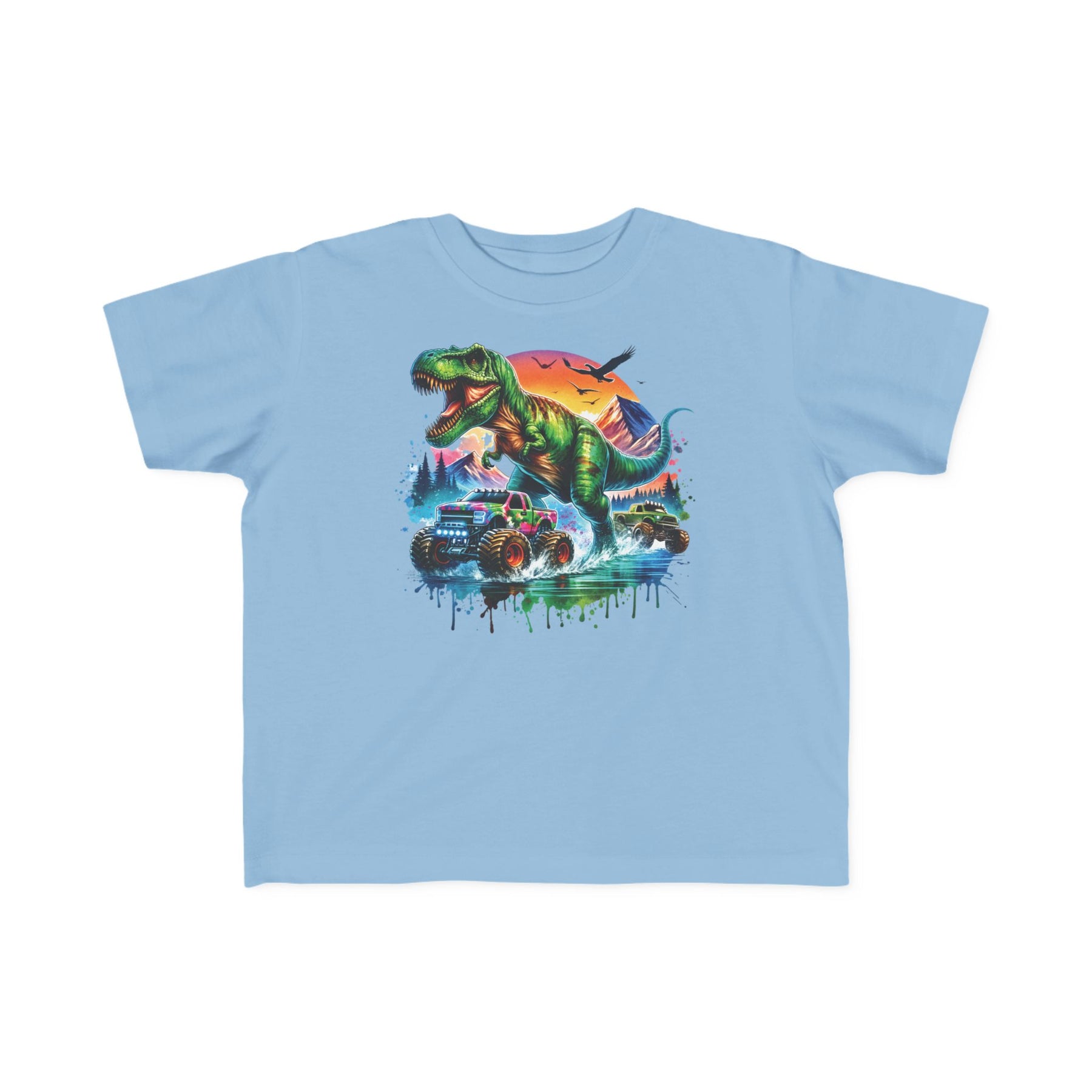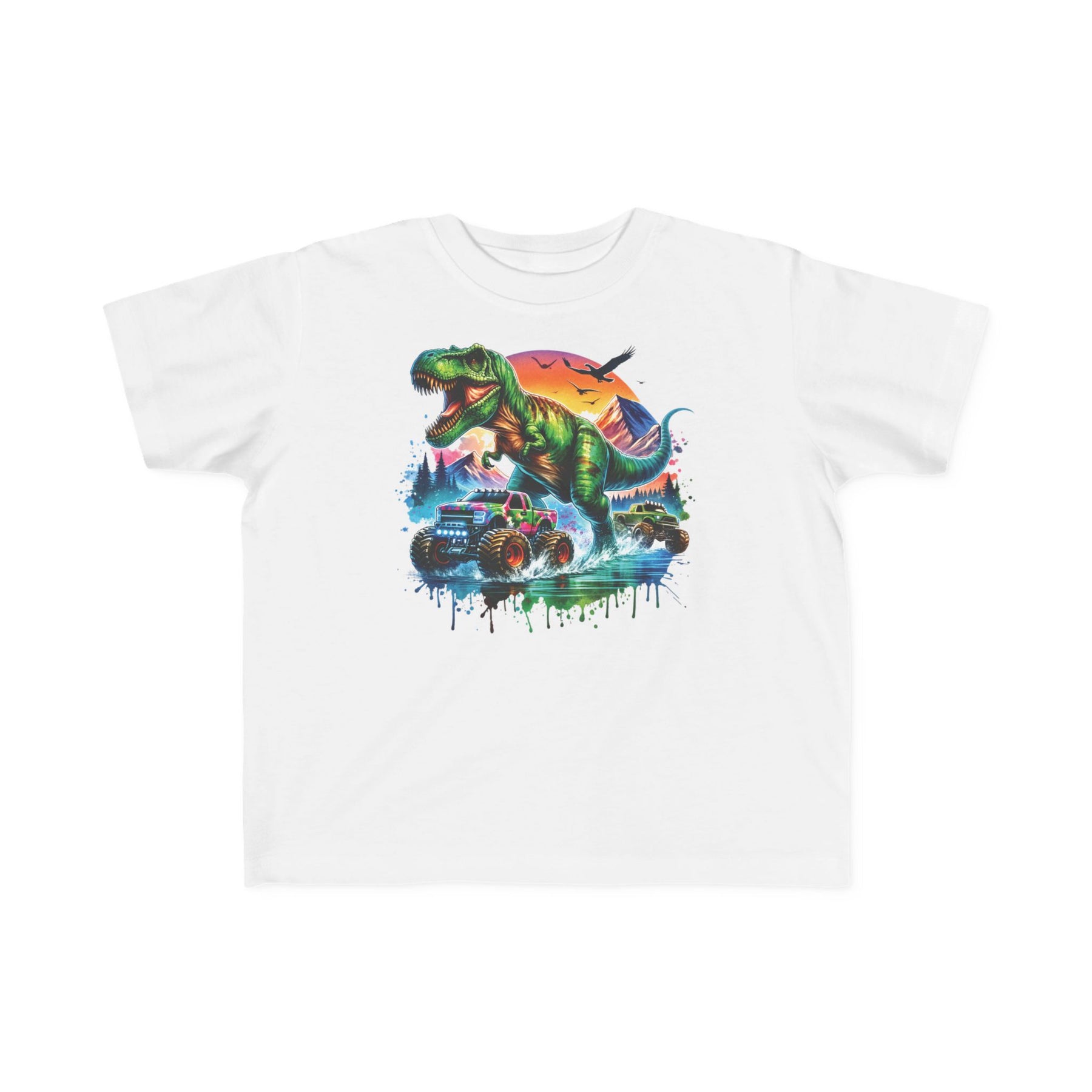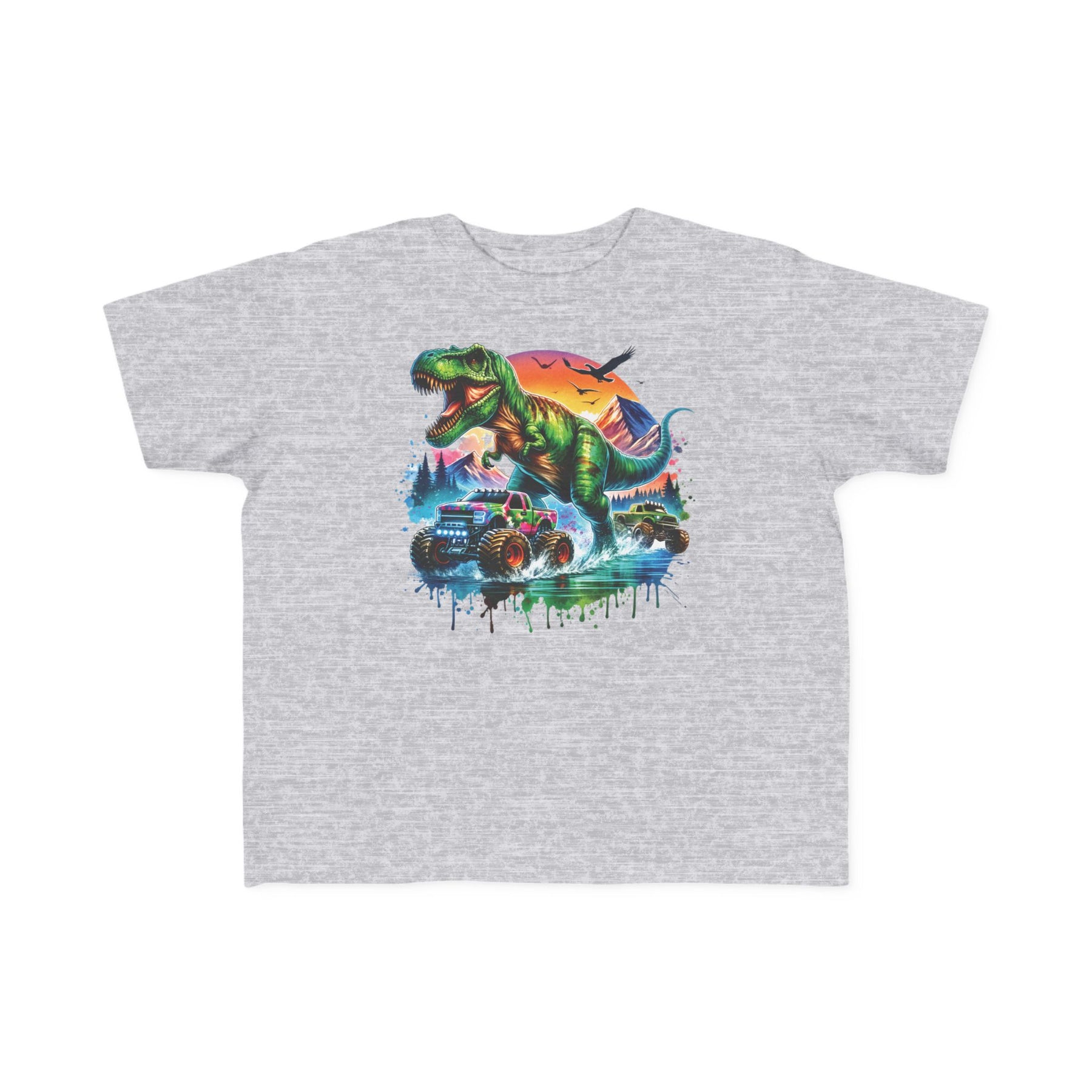 Dino Truck Toddler Tee featuring a vivid T. rex and monster trucks design, perfect for toddlers with soft cotton fabric and durable print.