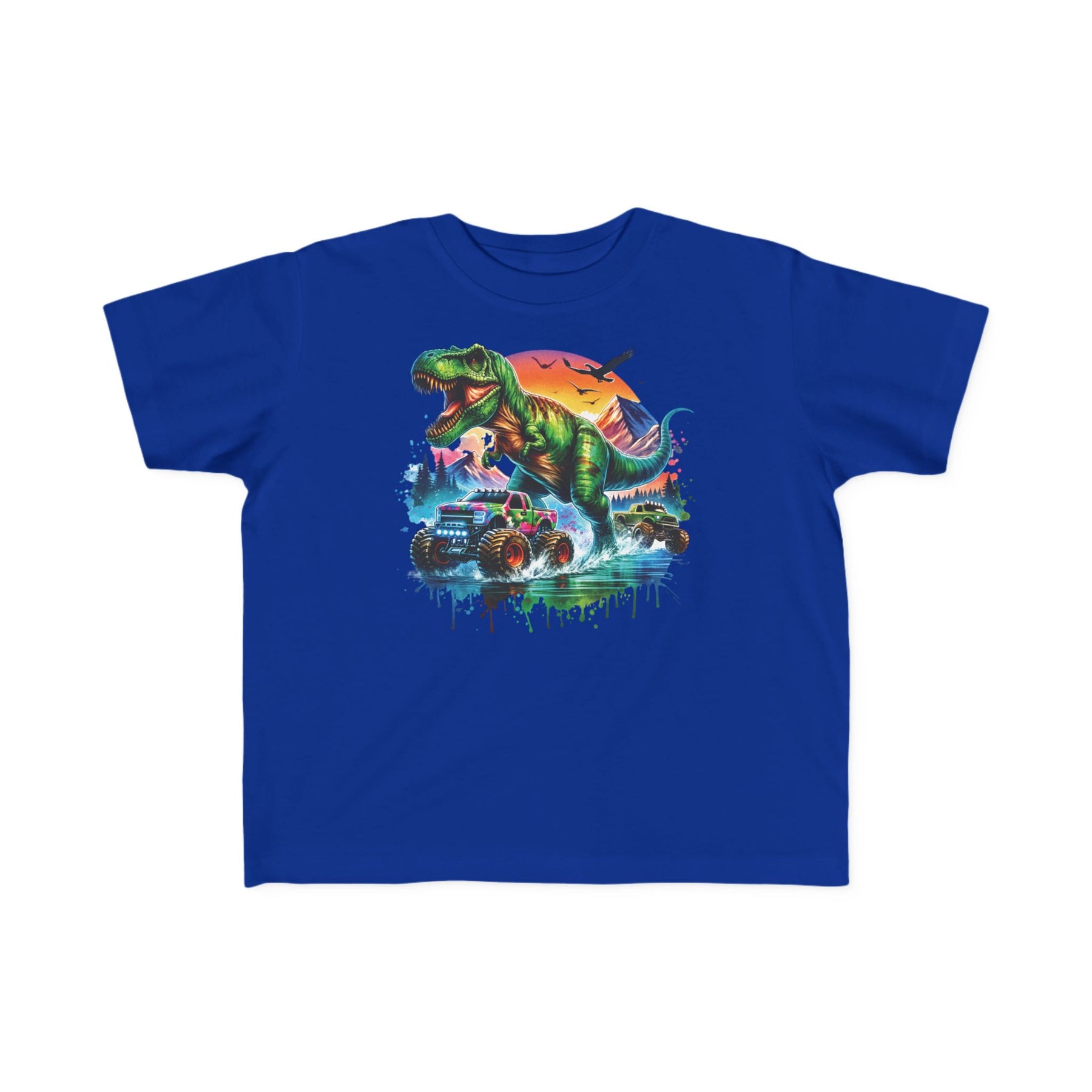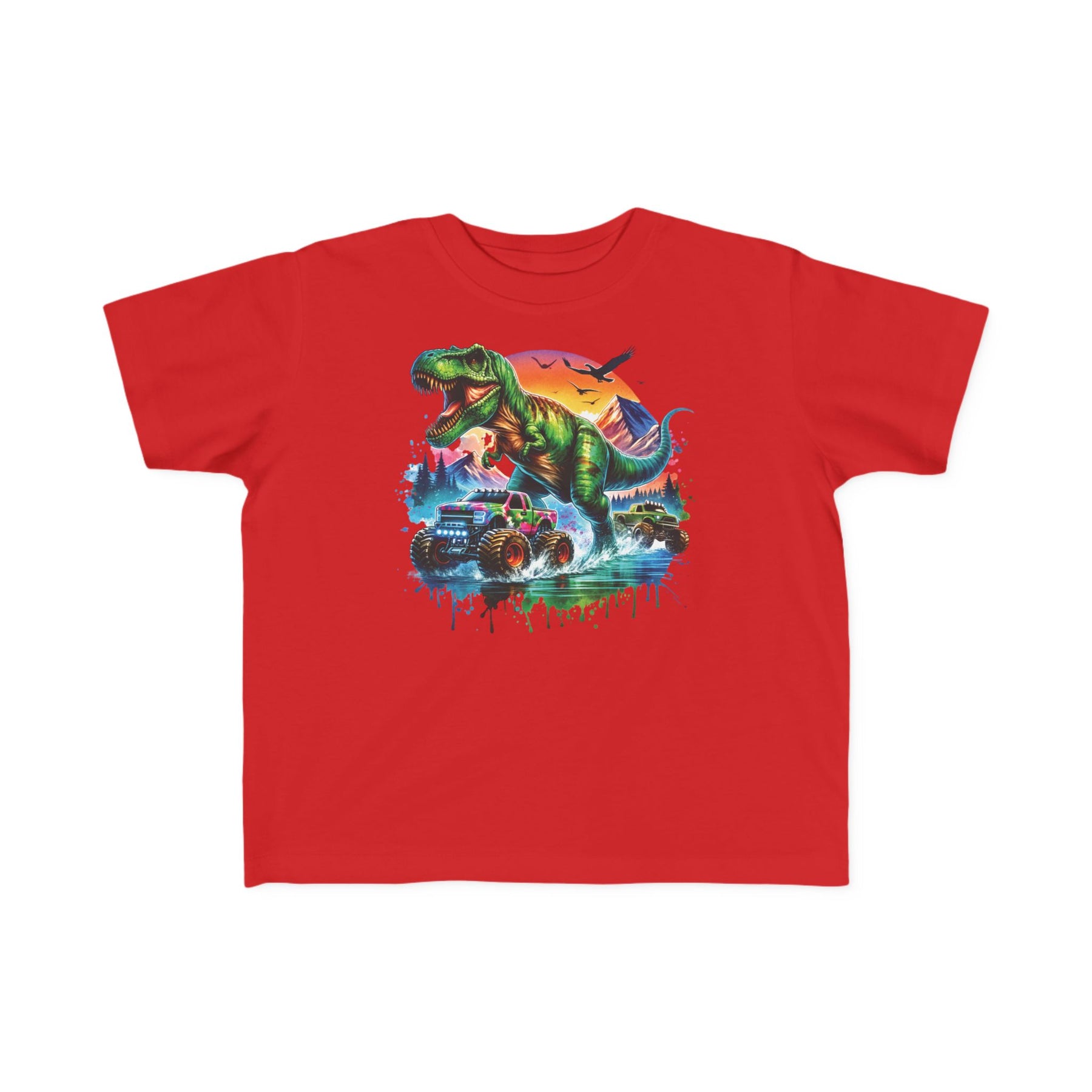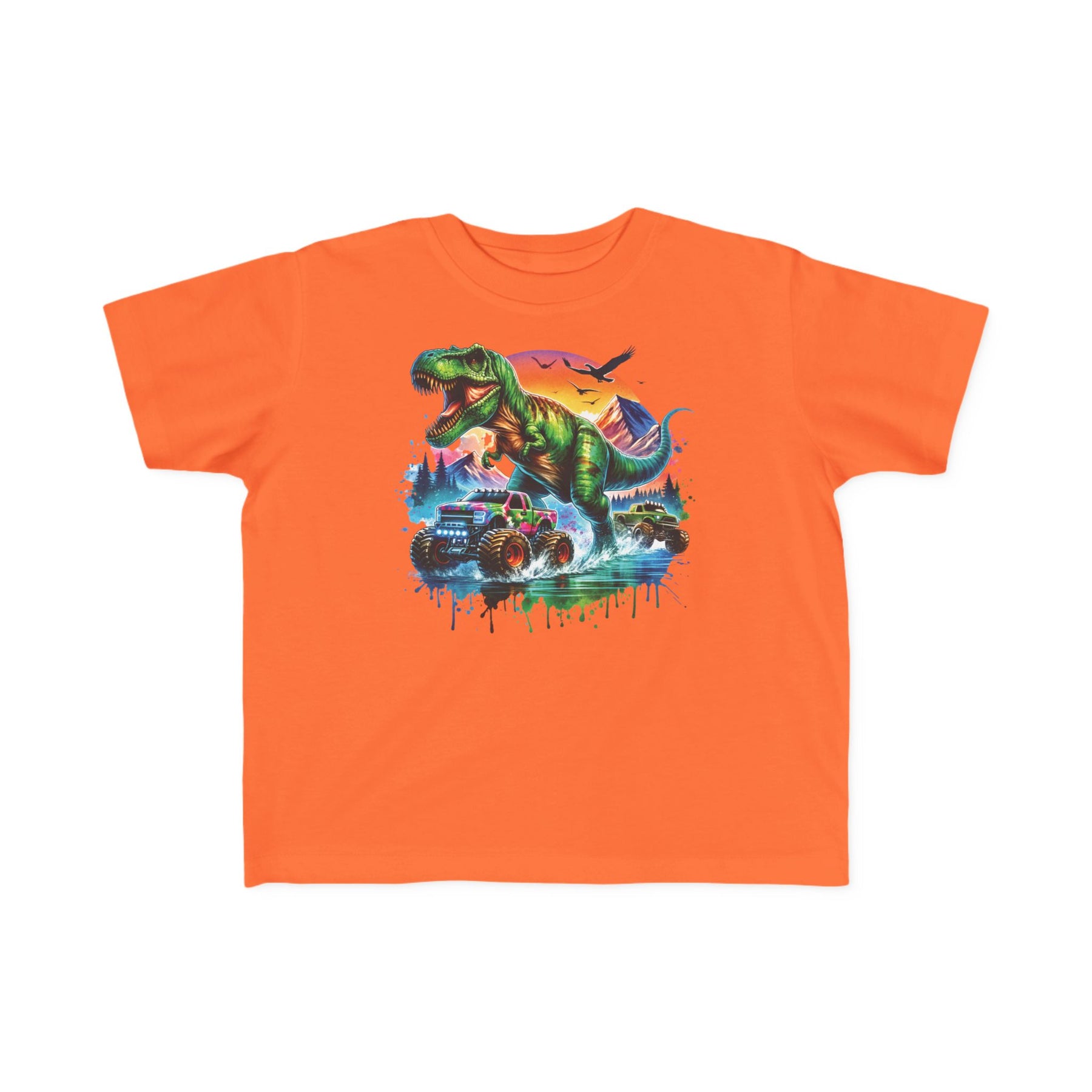 Dino Truck Toddler Tee featuring a vivid T. rex and monster trucks design, perfect for toddlers with soft cotton fabric and durable print.
