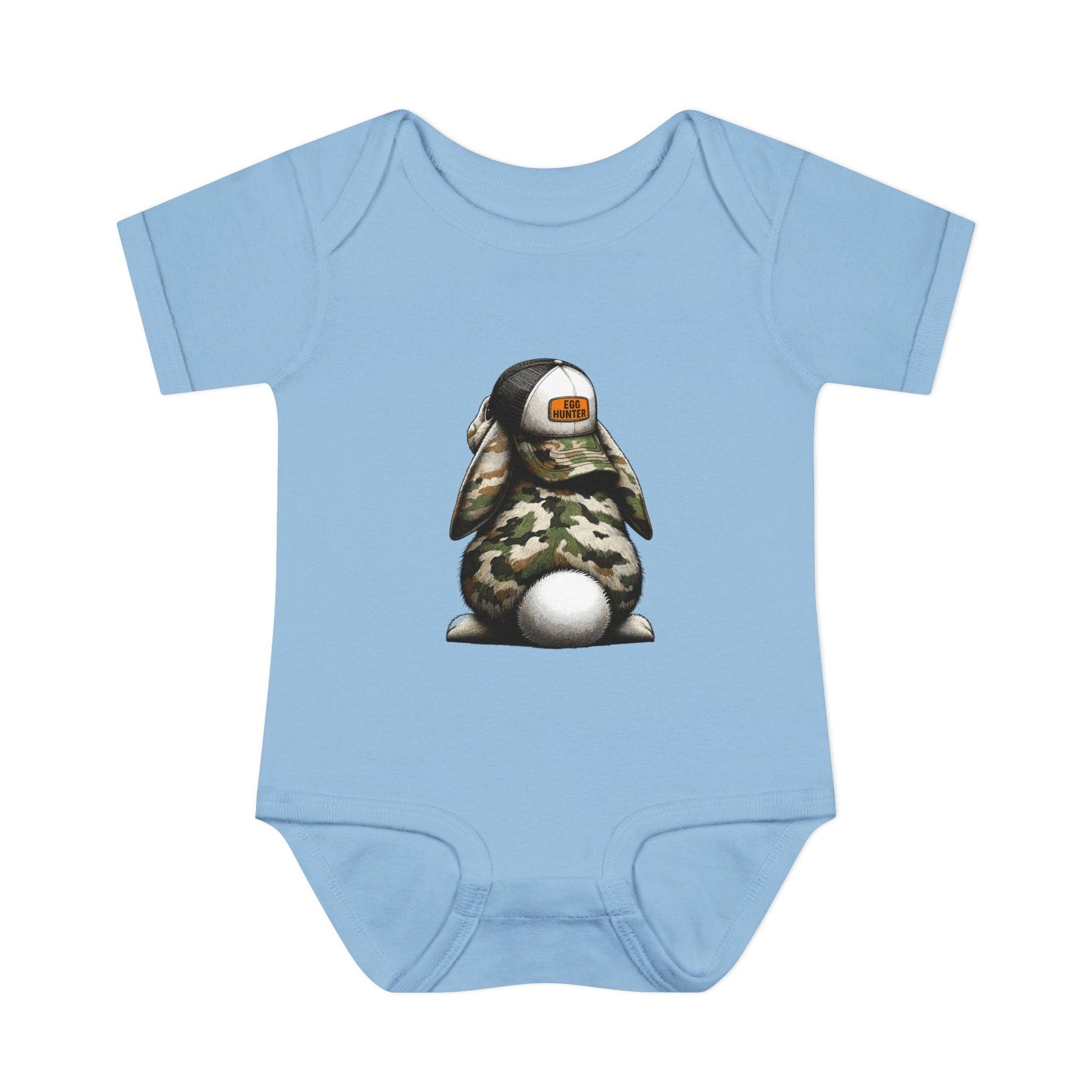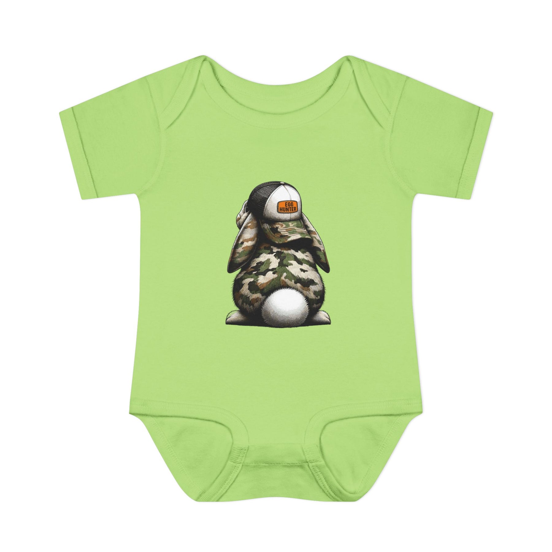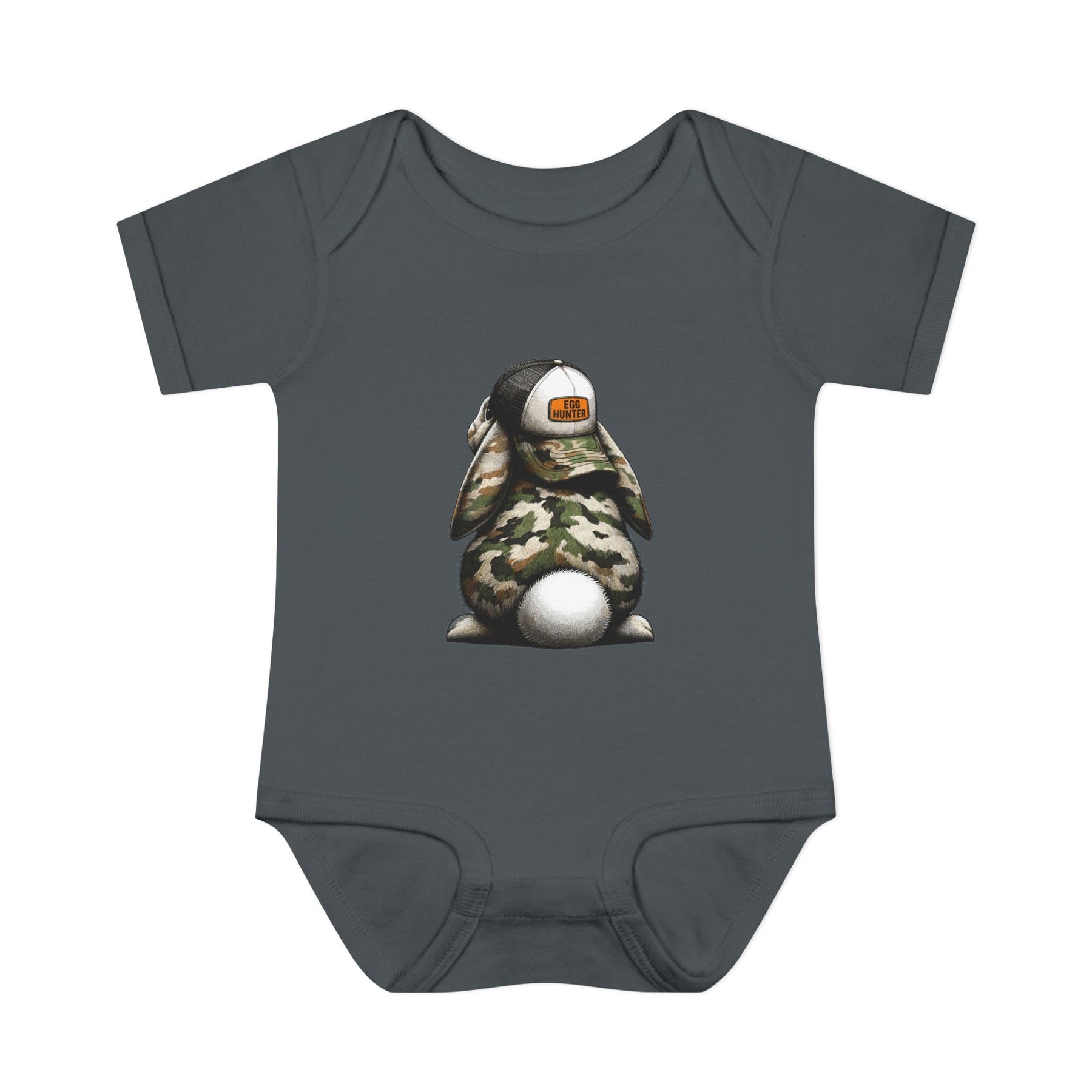 Egg Hunter Onesie featuring a cartoon bunny, designed for infants with soft, ring-spun cotton, lap shoulders for easy adjustments. Ideal for comfort and style.