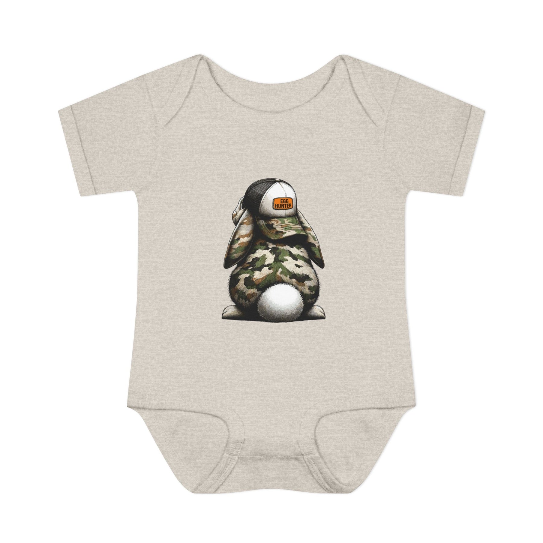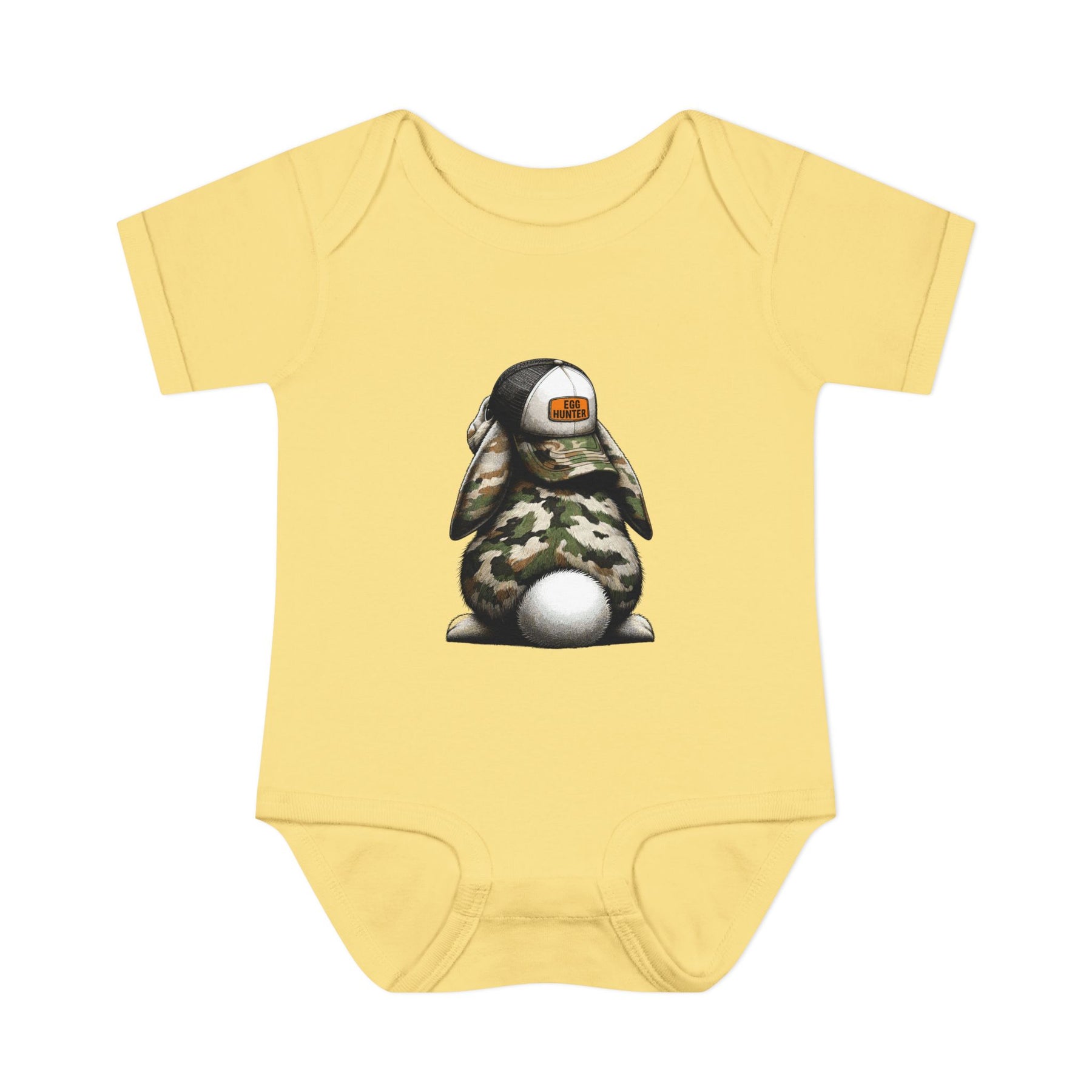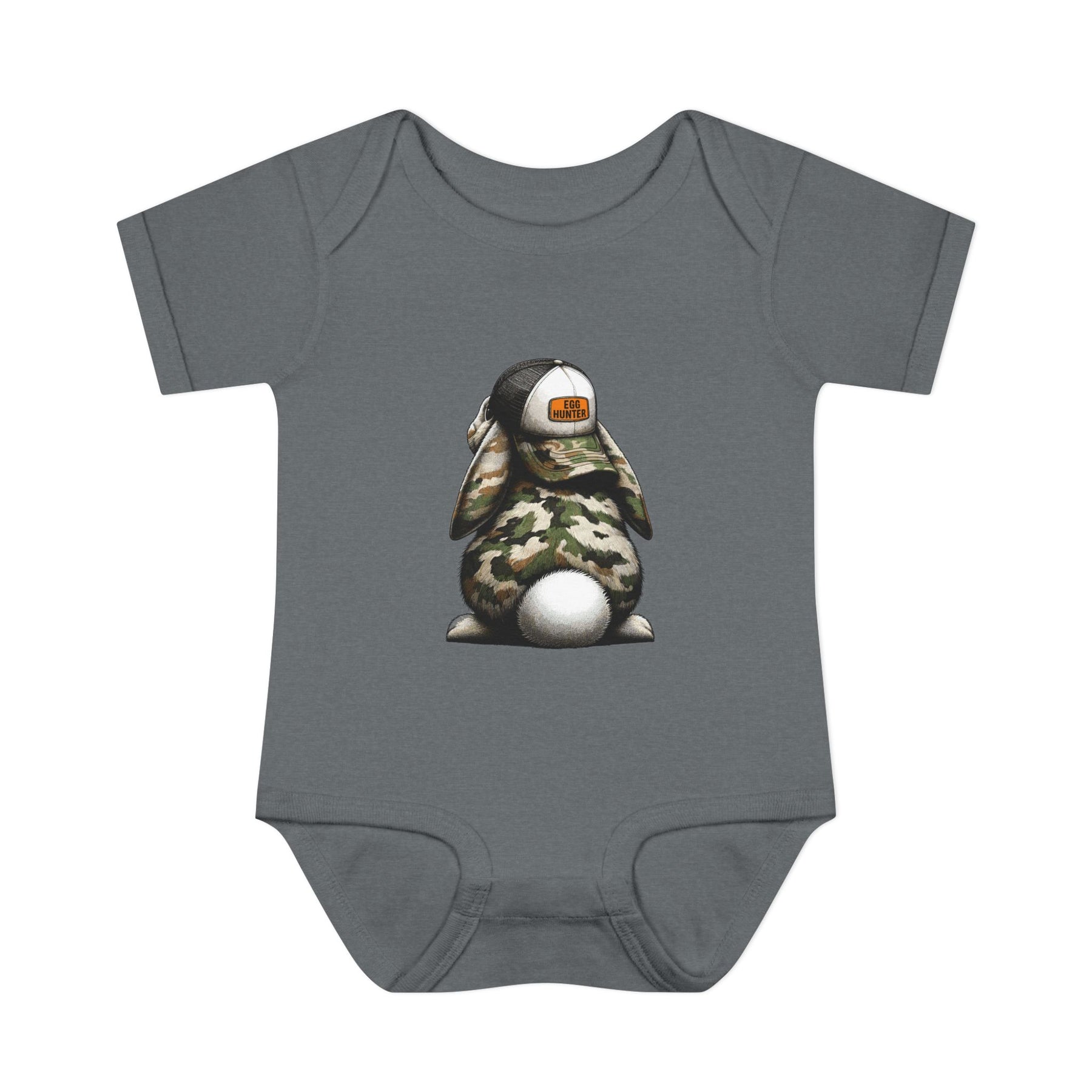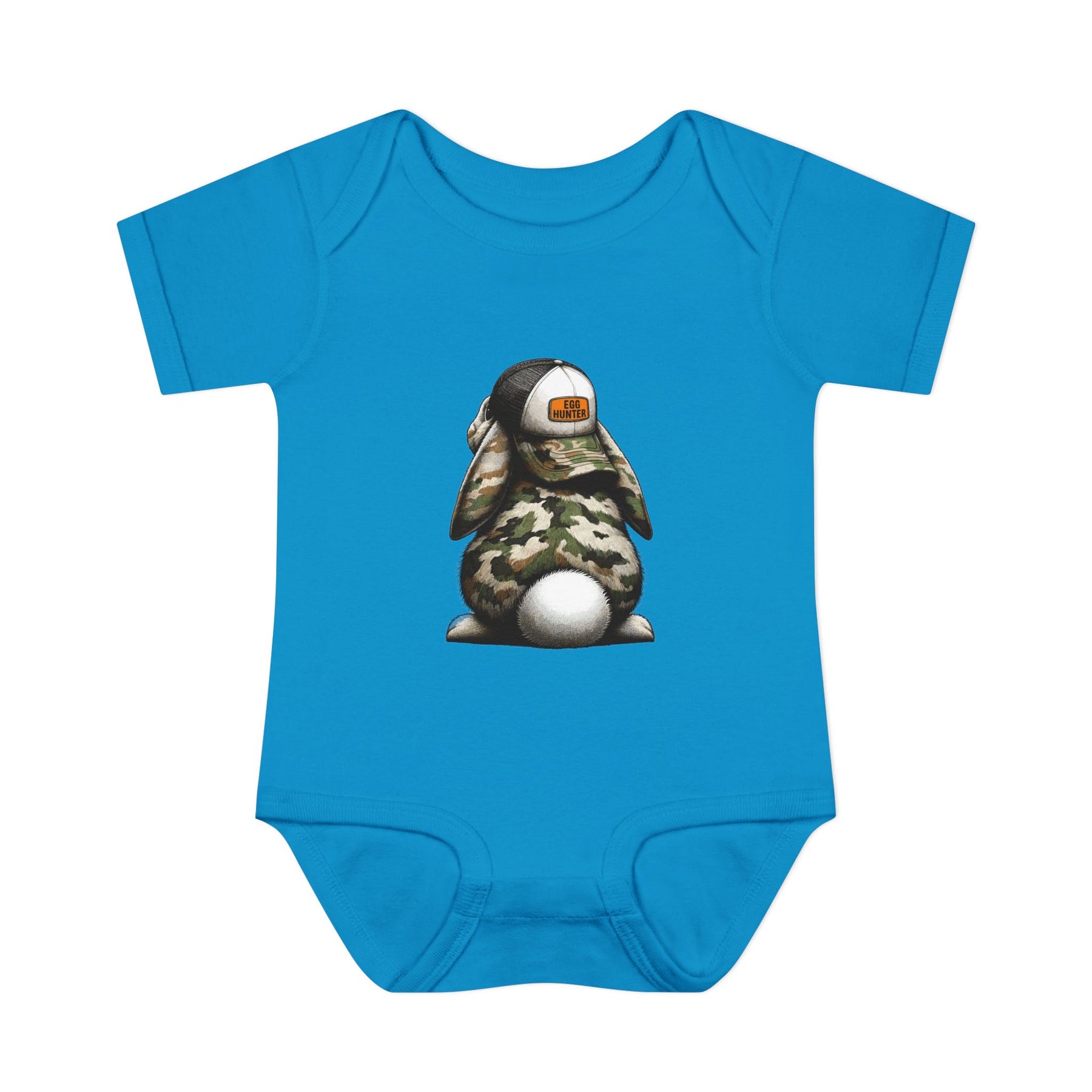 Egg Hunter Onesie featuring a cartoon bunny, designed for infants with soft, ring-spun cotton, lap shoulders for easy adjustments. Ideal for comfort and style.