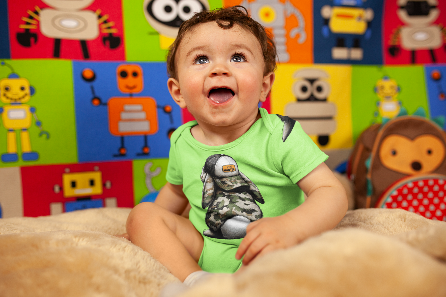 Baby wearing Egg Hunter Onesie sits on a blanket, showcasing the soft, ring-spun cotton fabric ideal for comfort and ease of movement.