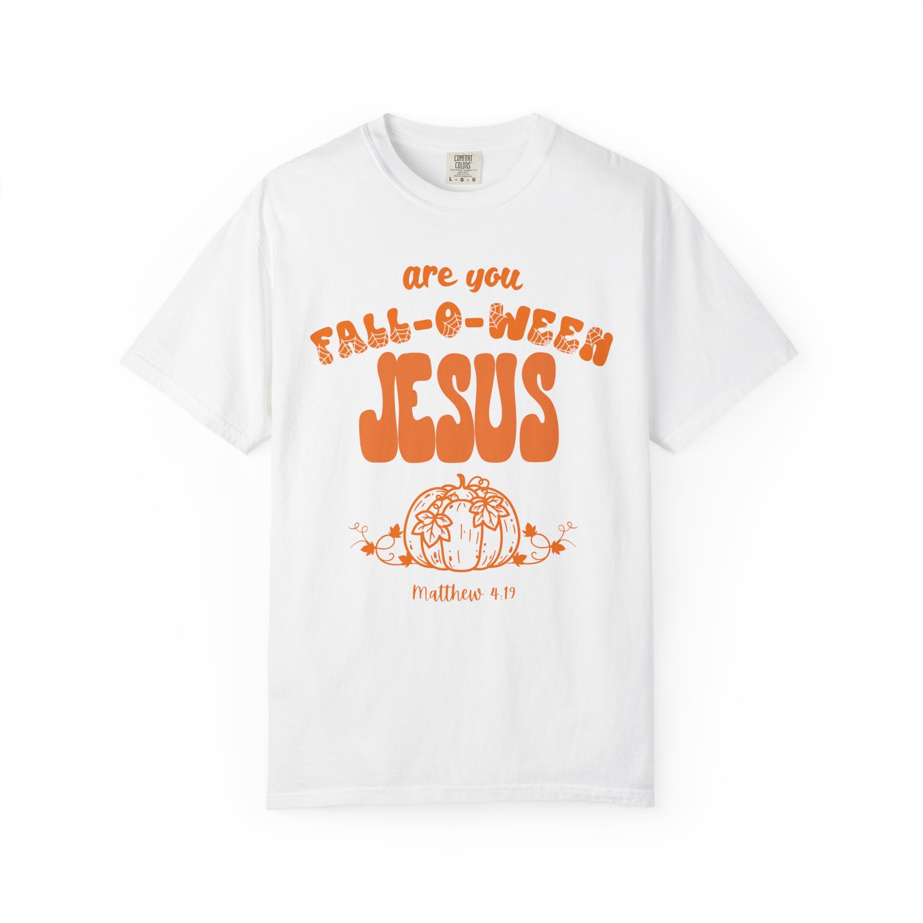 White FALL-O-WEEN Jesus tee featuring bright orange lettering, a pumpkin graphic, and Matthew 4:19, on a soft, relaxed-fit cotton fabric.