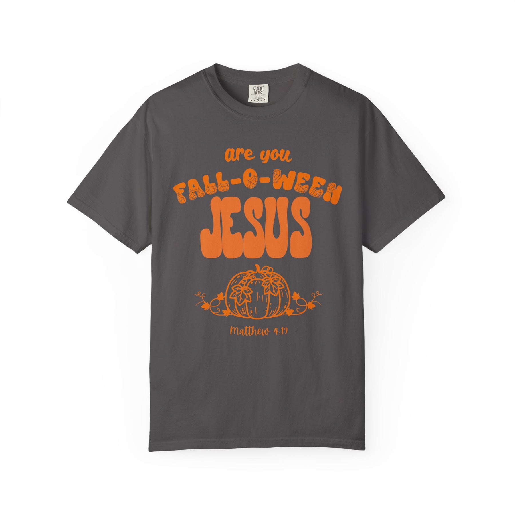 Charcoal-gray T-shirt with are you FALL-O-WEEN JESUS in retro font, featuring a pumpkin and Matthew 4:19. Relaxed fit, durable, 100% ring-spun cotton.