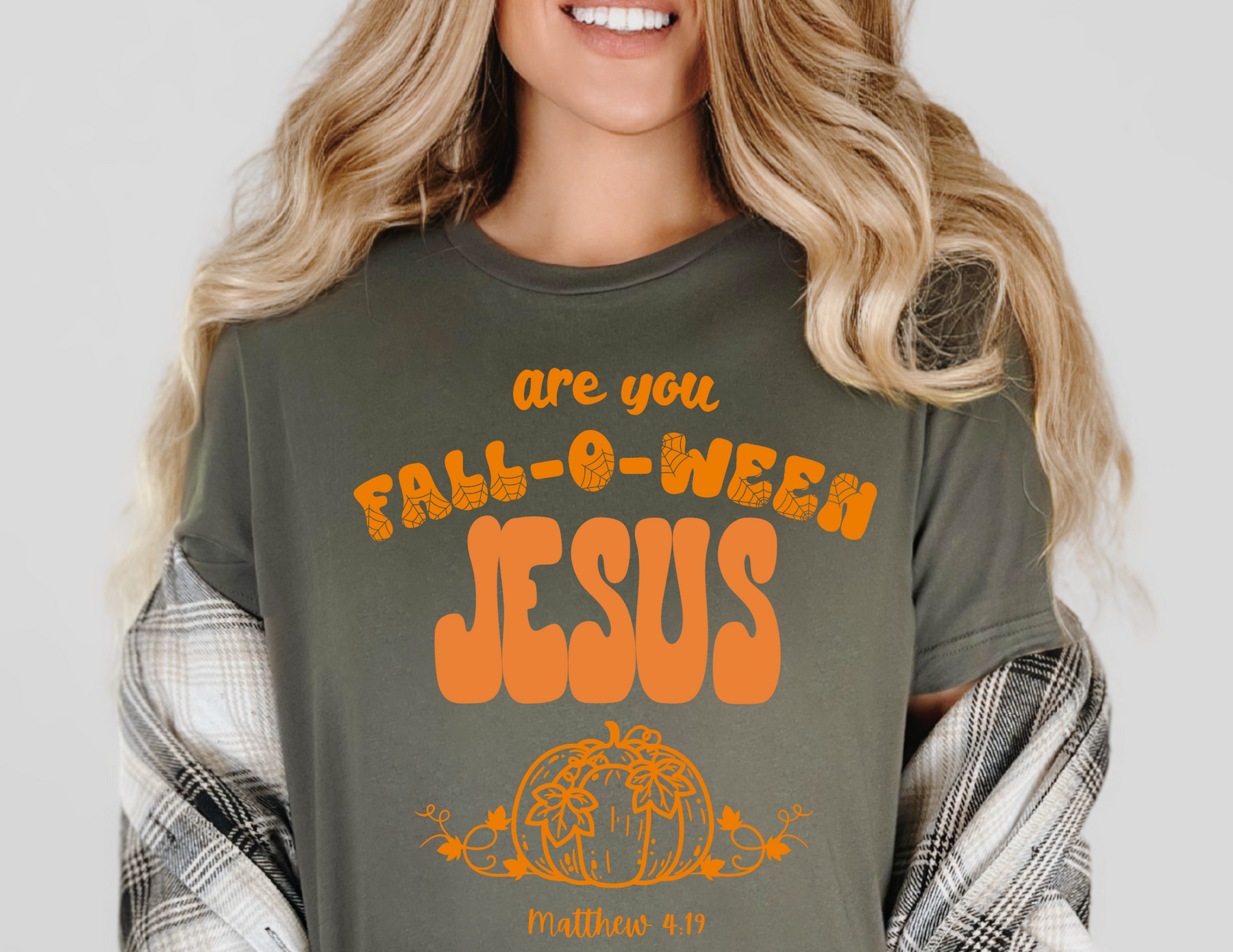 Person wearing a dark-green FALL-O-WEEN Jesus tee with orange lettering, pumpkin graphic, and verse reference. Styled with plaid shirt and wavy blonde hair.