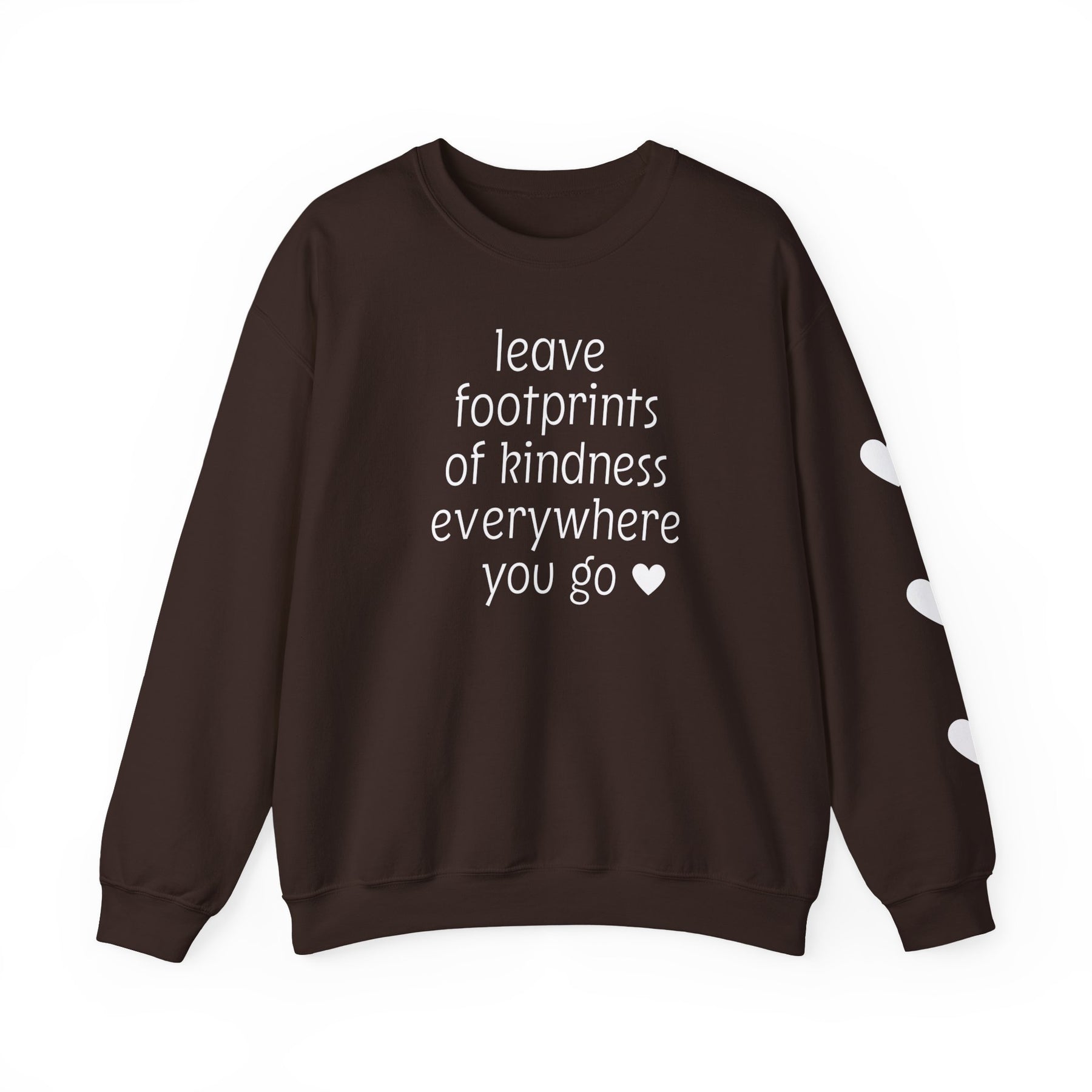 Dark-brown crewneck sweatshirt with leave footprints of kindness everywhere you go ♥ in white letters on front and three white hearts down one sleeve.