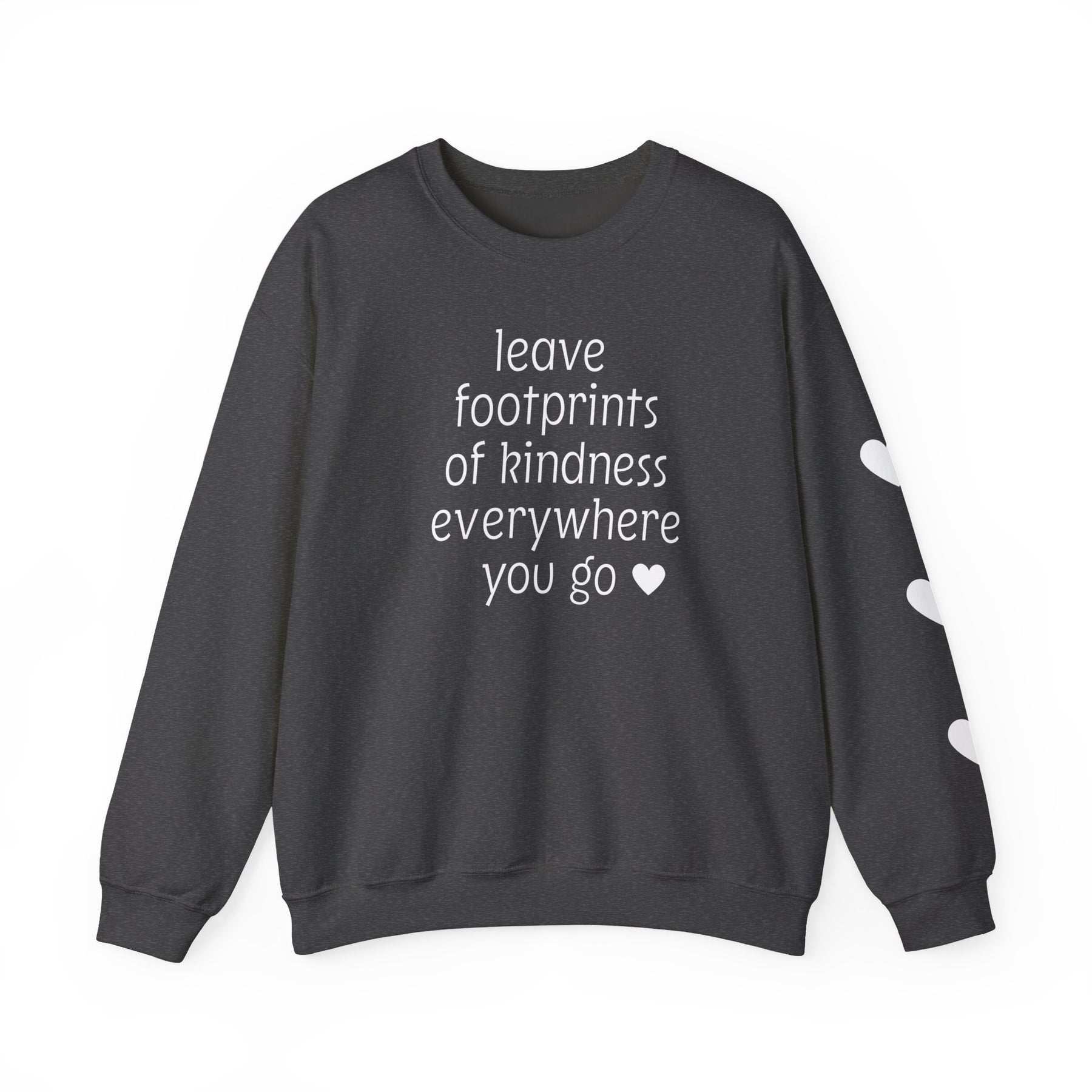 Dark charcoal-gray crewneck sweatshirt with leave footprints of kindness everywhere you go ♥ in white on front, white hearts on right sleeve.