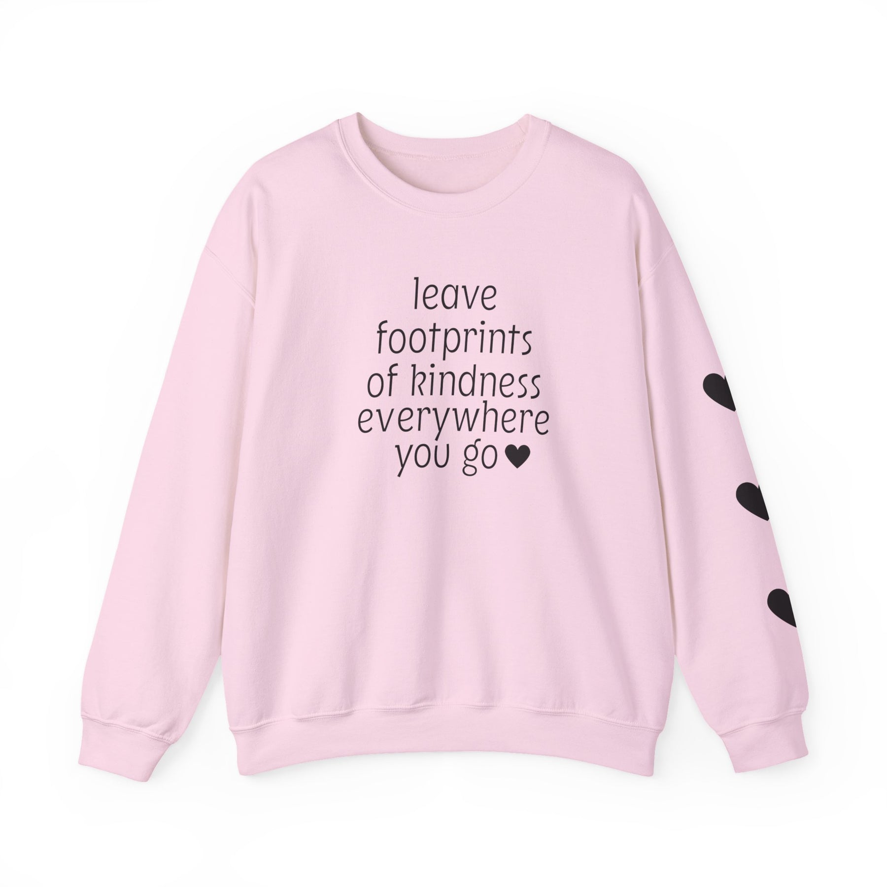 Light pink crewneck sweatshirt with leave footprints of kindness everywhere you go ♥ on front, three black hearts on right sleeve.