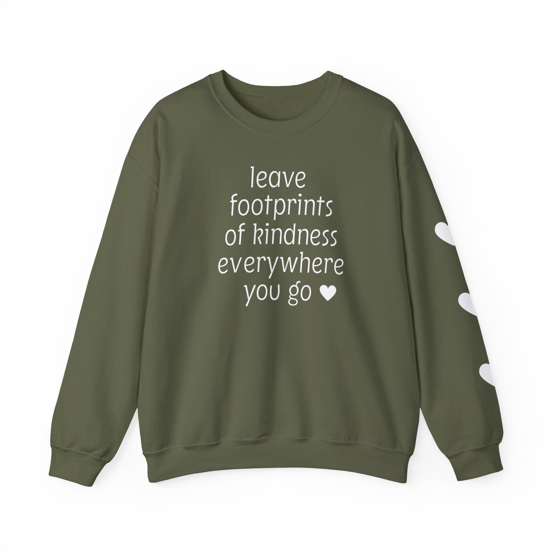 Footprints of Kindness Crew: Olive-green sweatshirt with white text and heart icons, offering cozy comfort with a ribbed crewneck and durable stitching.