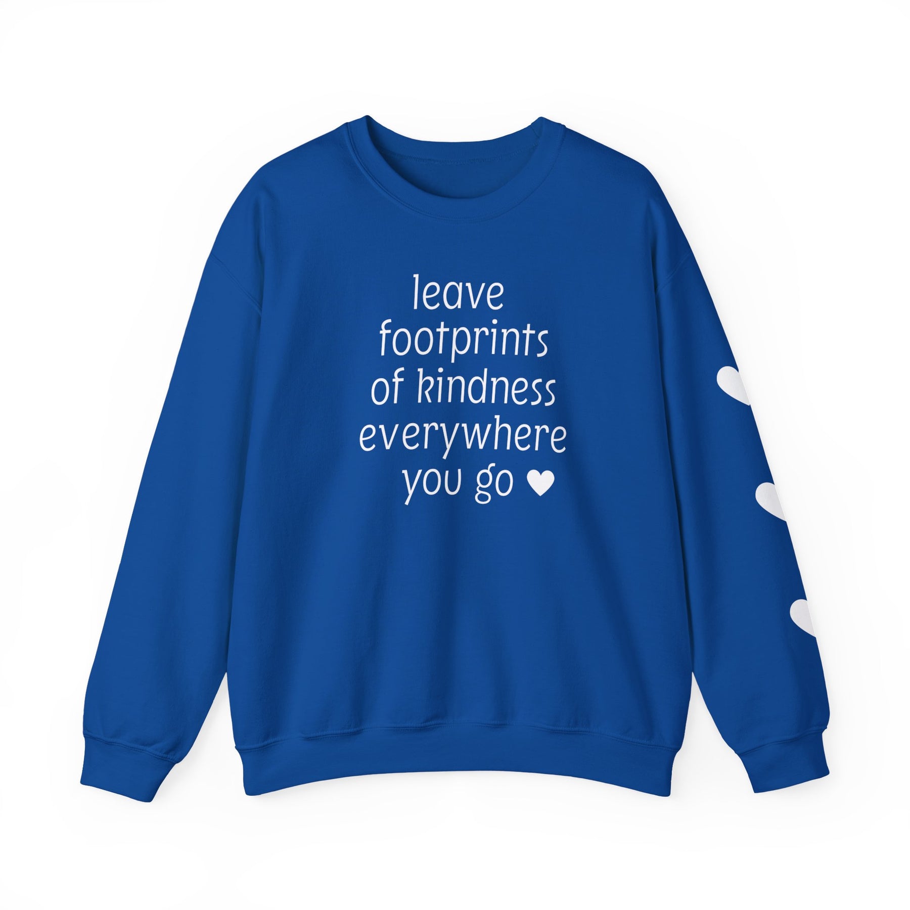 Royal-blue crewneck sweatshirt with leave footprints of kindness everywhere you go ♥ in white on front and three white hearts on right sleeve.