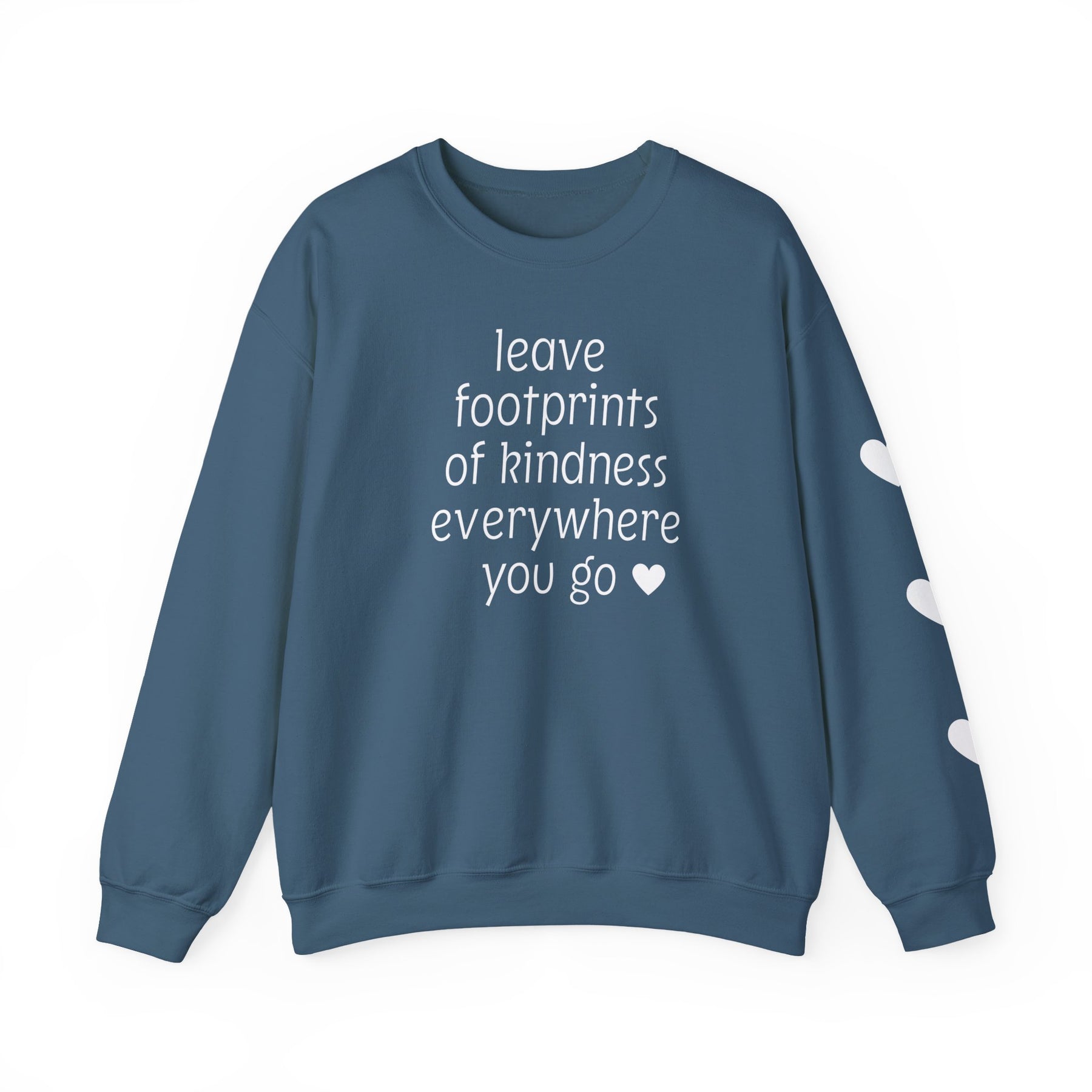 Teal-blue crewneck sweatshirt with leave footprints of kindness everywhere you go ♥️ in white. Right sleeve features white heart shapes.