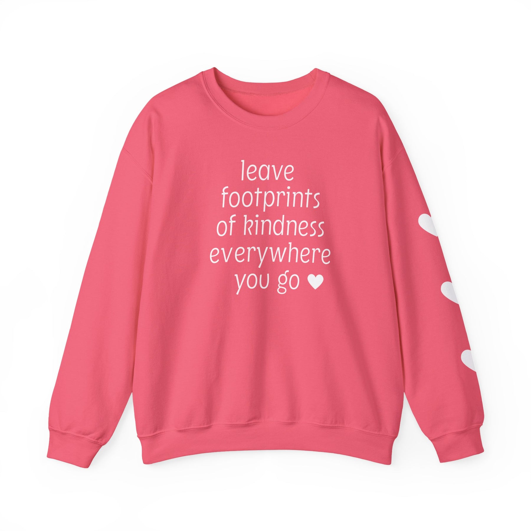 Coral-pink crewneck sweatshirt with leave footprints of kindness everywhere you go ♥ in white on front; three white hearts on right sleeve.