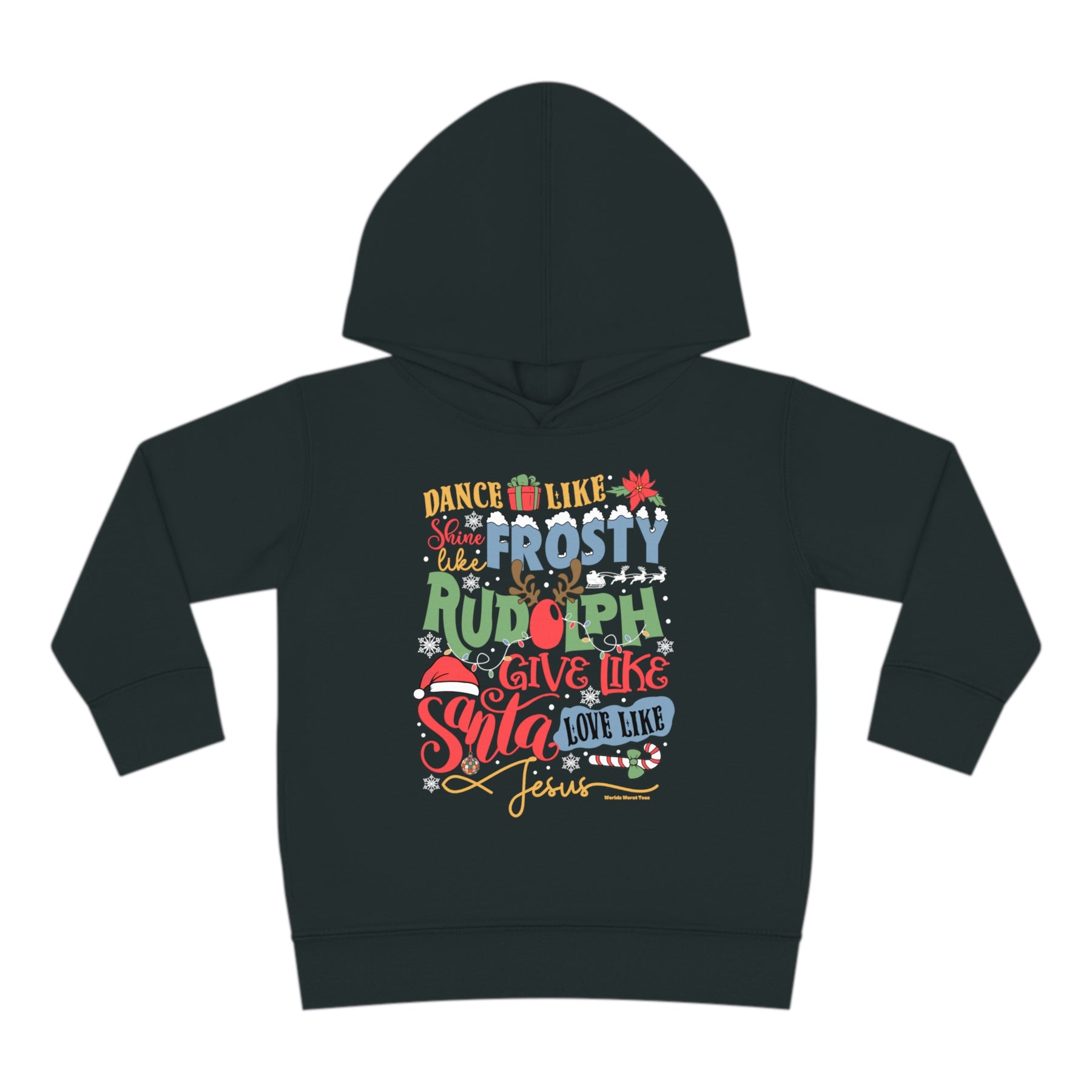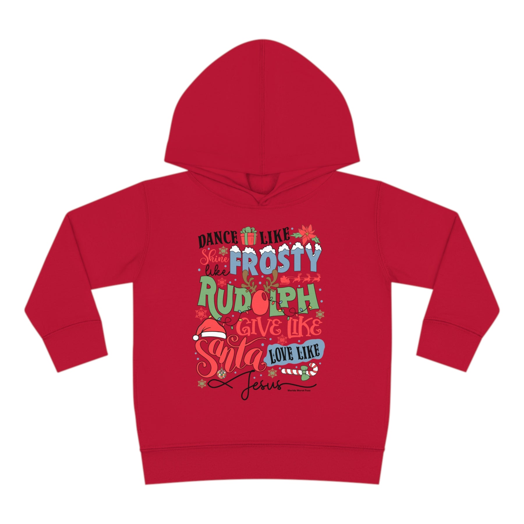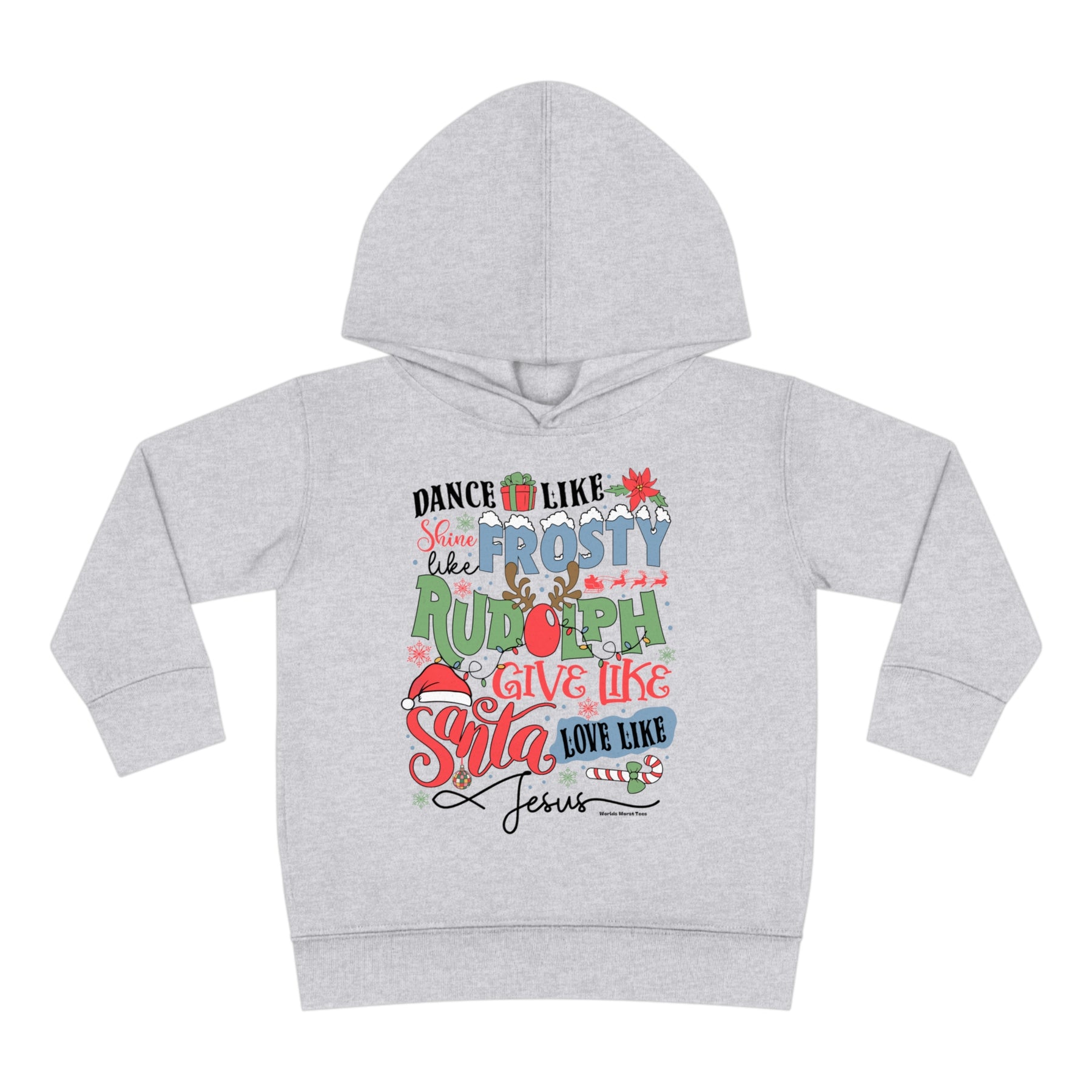 Toddler hoodie with jersey-lined hood, cover-stitched details, and side-seam pockets for cozy comfort. Made of 60% cotton, 40% polyester blend. Ideal for Frosty Ruldoph Santa Jesus fans.