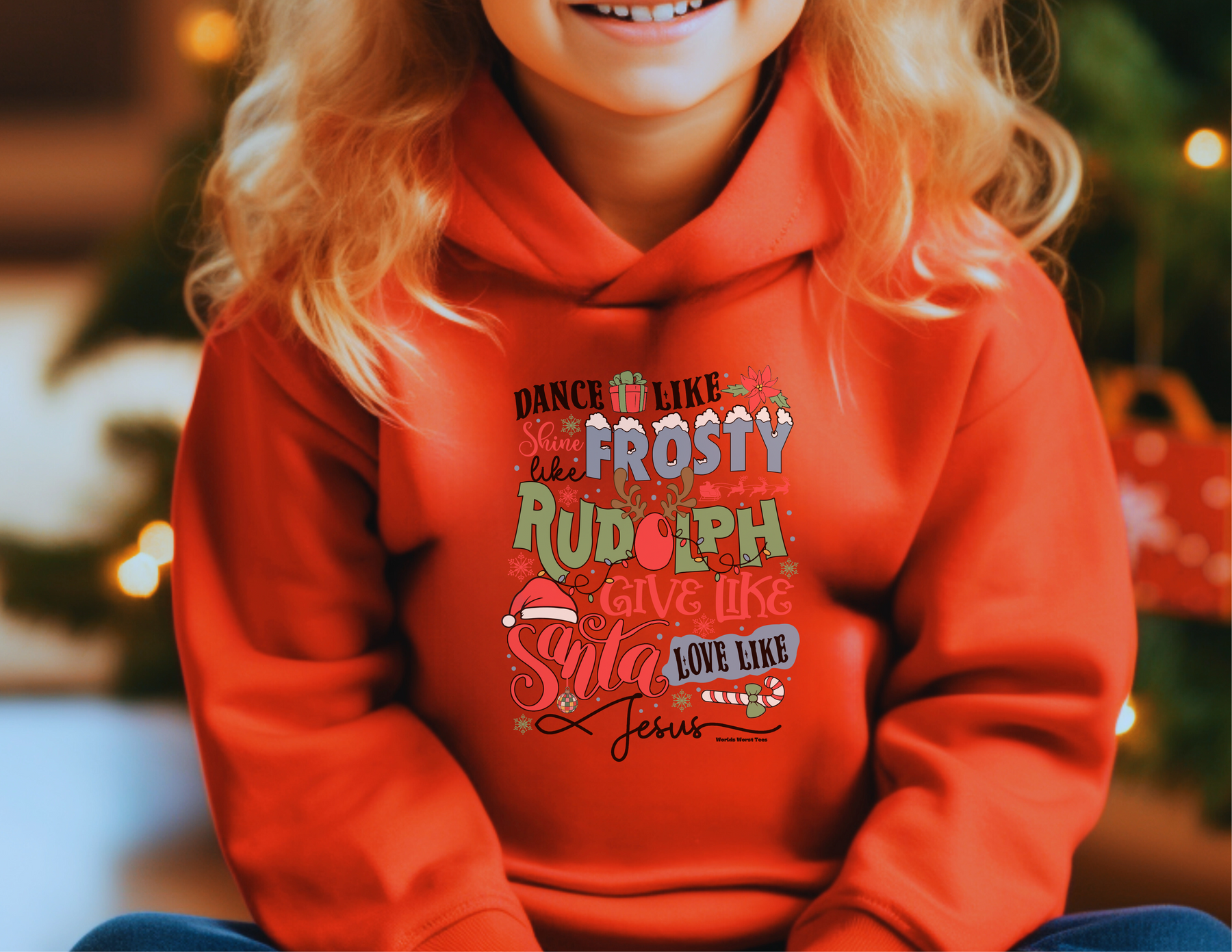 Toddler hoodie featuring Frosty Rudolph Santa Jesus design, jersey-lined hood, cover-stitched details, and side-seam pockets for comfort and durability. Made of 60% cotton, 40% polyester blend. From Worlds Worst Tees.