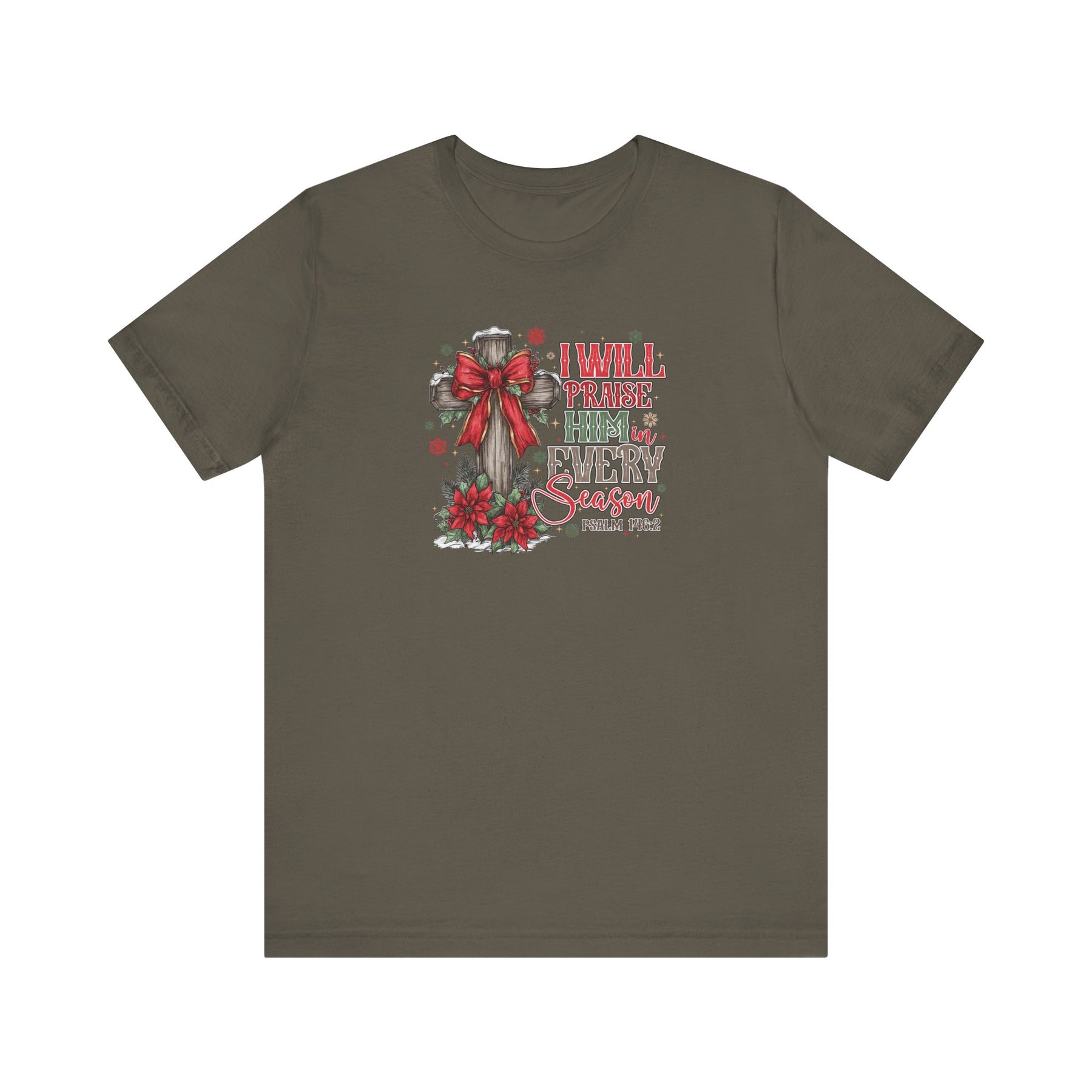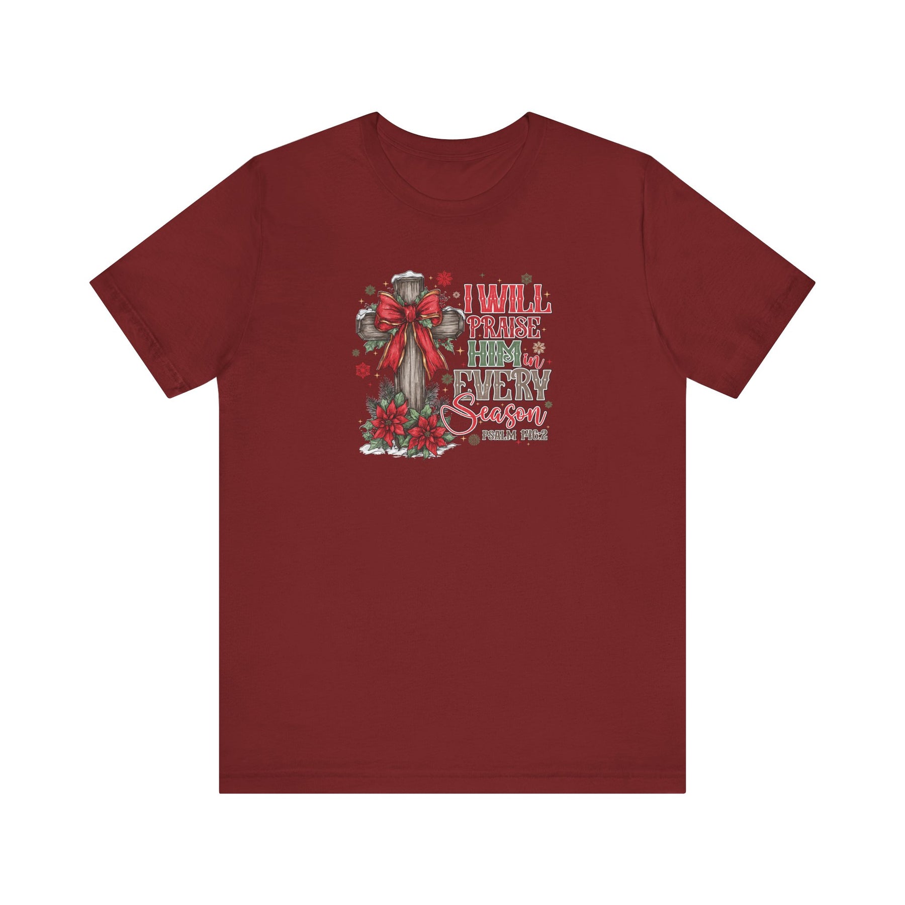 Praise Him in Every Season Tee displaying a festive wooden cross with a red bow, poinsettias, and scripture, ideal for holiday celebrations.