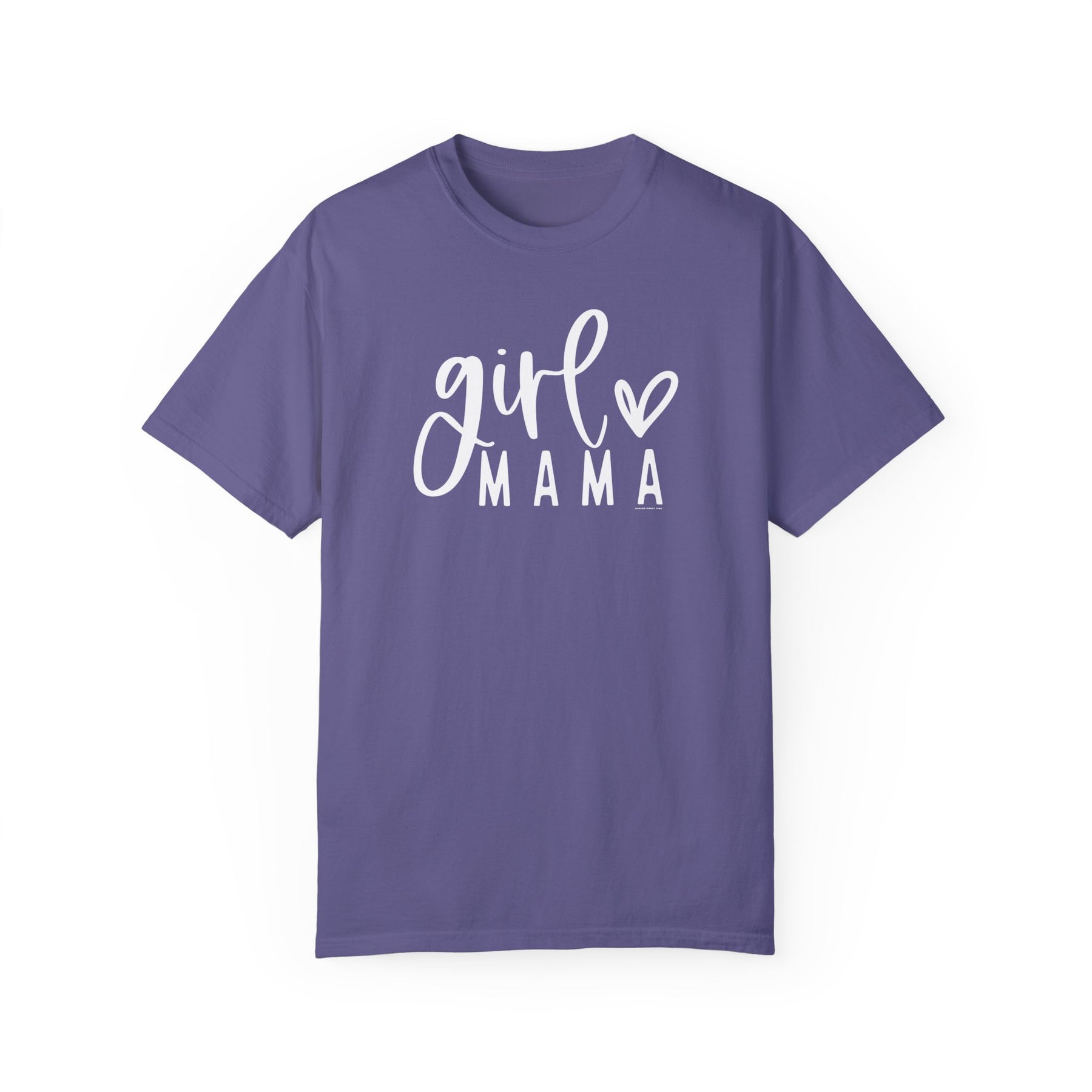 A relaxed fit Girl Mama Tee in purple with white text. 100% ring-spun cotton, garment-dyed for extra coziness. Double-needle stitching for durability, no side-seams for shape retention.