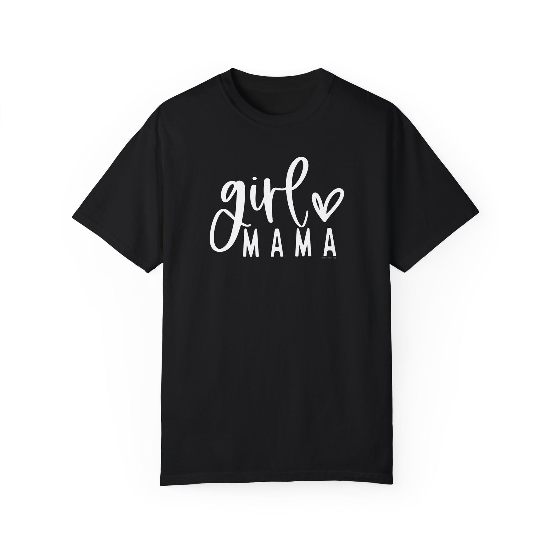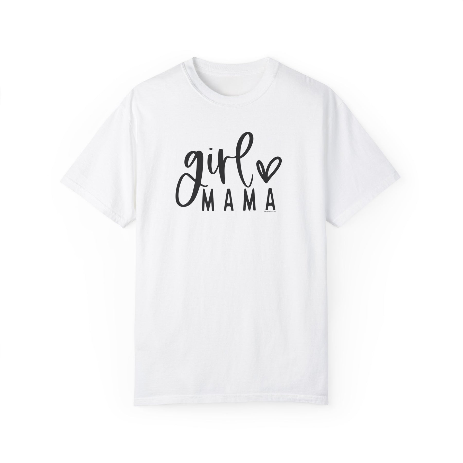 Girl Mama Tee: A grey t-shirt with white text, made of 100% ring-spun cotton. Garment-dyed for extra coziness, featuring a relaxed fit and durable double-needle stitching. Ideal for daily wear.