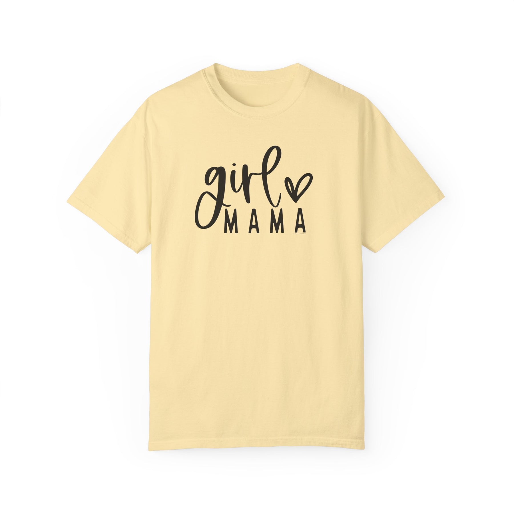 A Girl Mama Tee: 100% ring-spun cotton, garment-dyed for coziness. Relaxed fit, double-needle stitching for durability. No side-seams, tubular shape. Medium weight, versatile wardrobe staple.