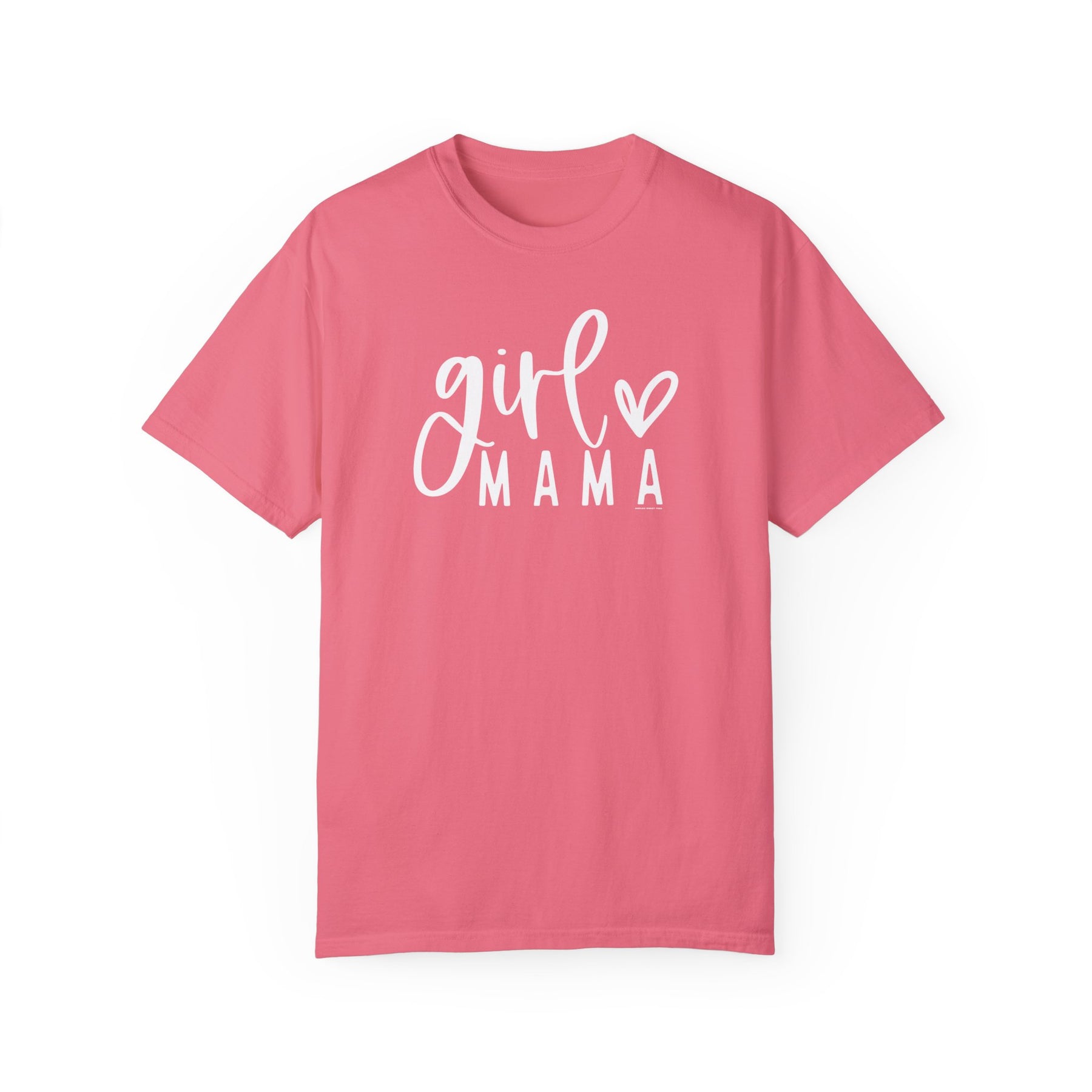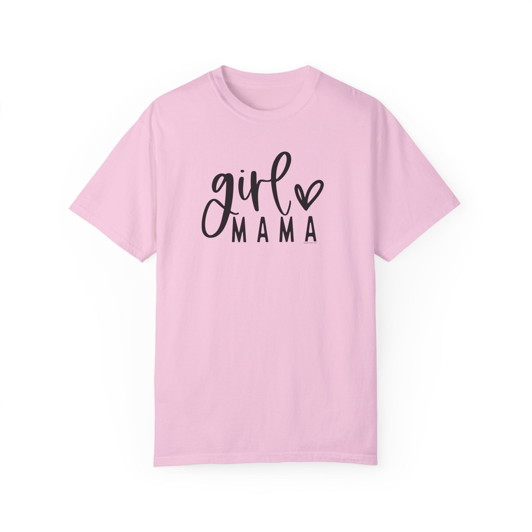 Relaxed fit Girl Mama Tee in pink with white text. 100% ring-spun cotton, garment-dyed for coziness. Double-needle stitching for durability, no side-seams for shape retention. Ideal for daily wear.