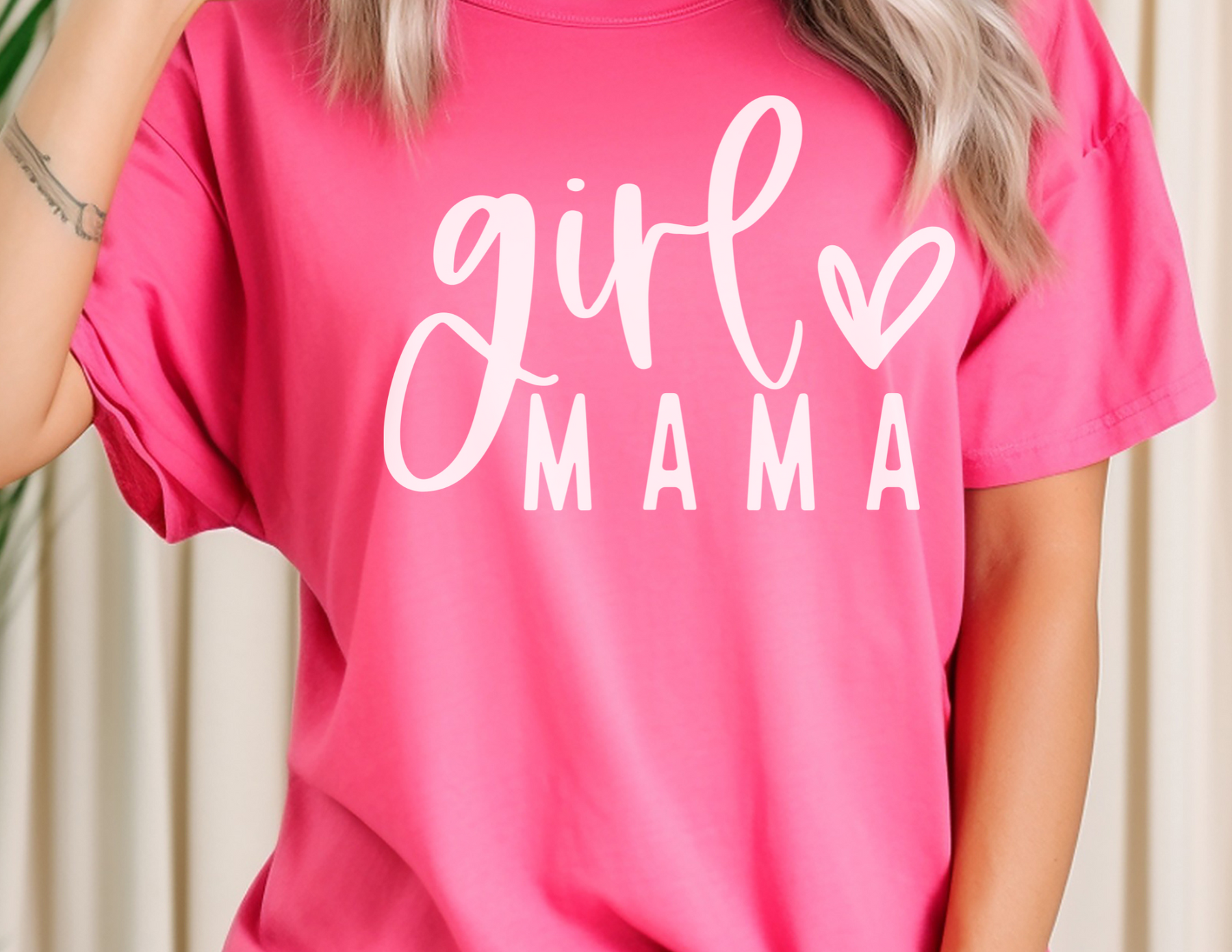 A relaxed fit Girl Mama Tee in pink, featuring a white heart and letter design. Made from 100% ring-spun cotton for comfort and durability. Ideal for daily wear with a soft-washed, cozy feel.