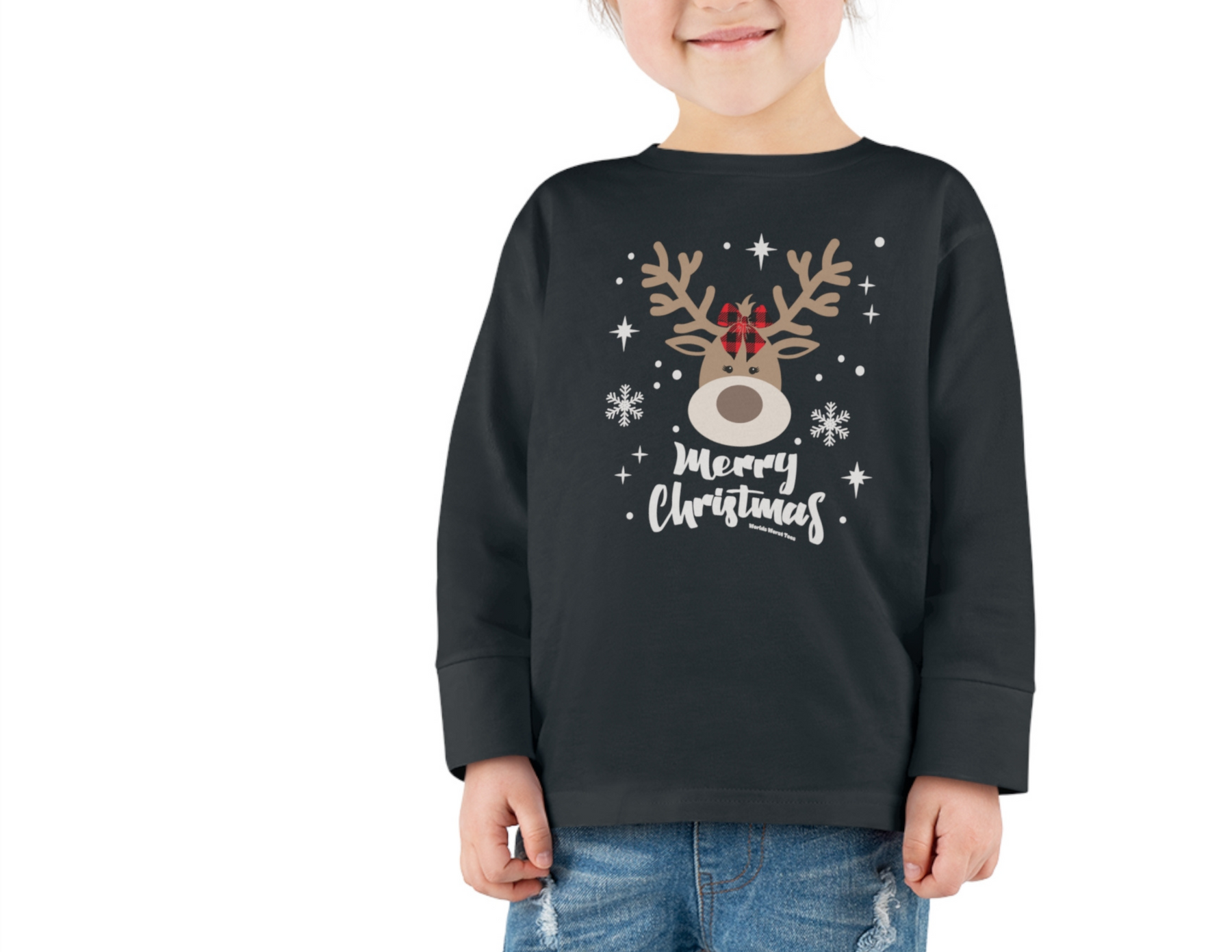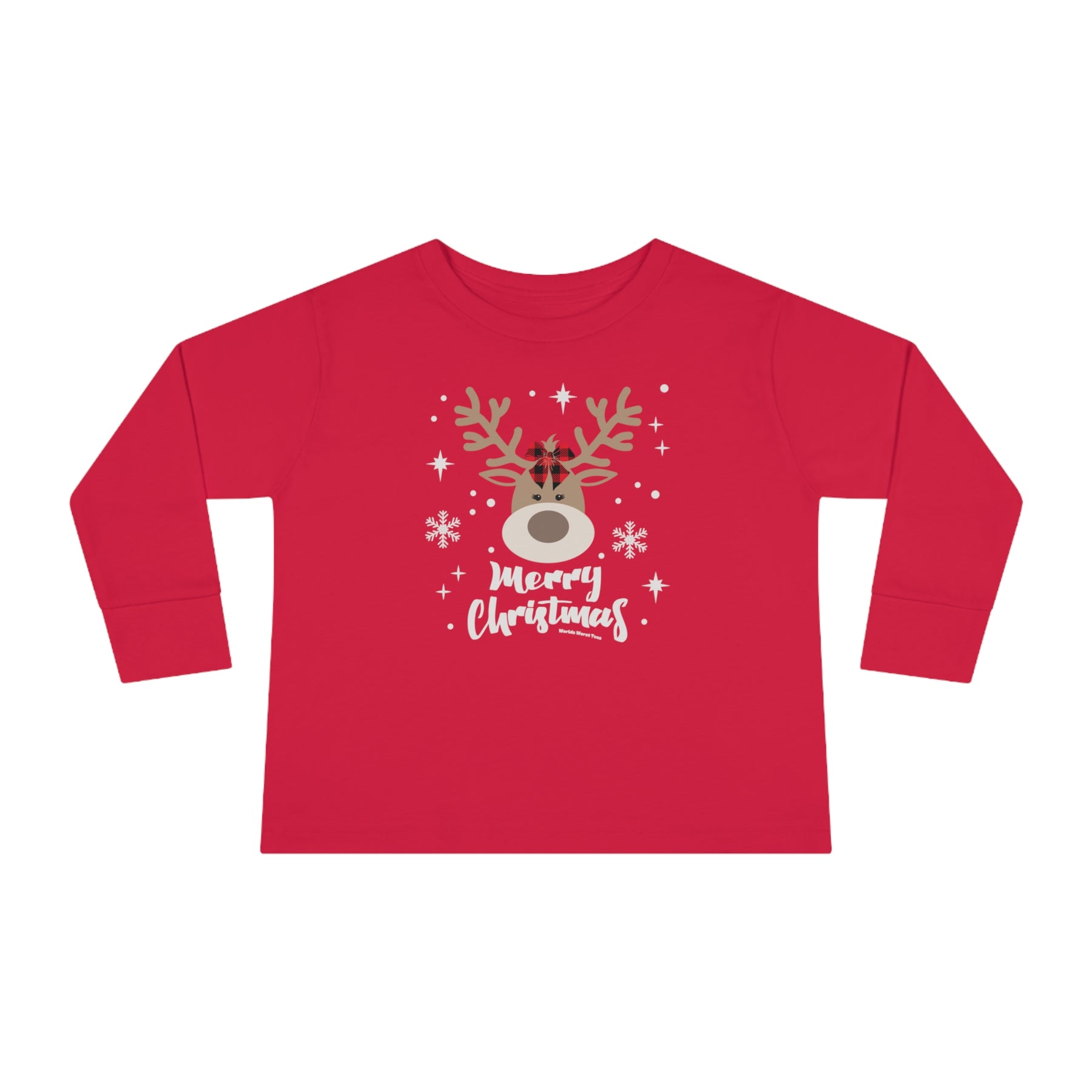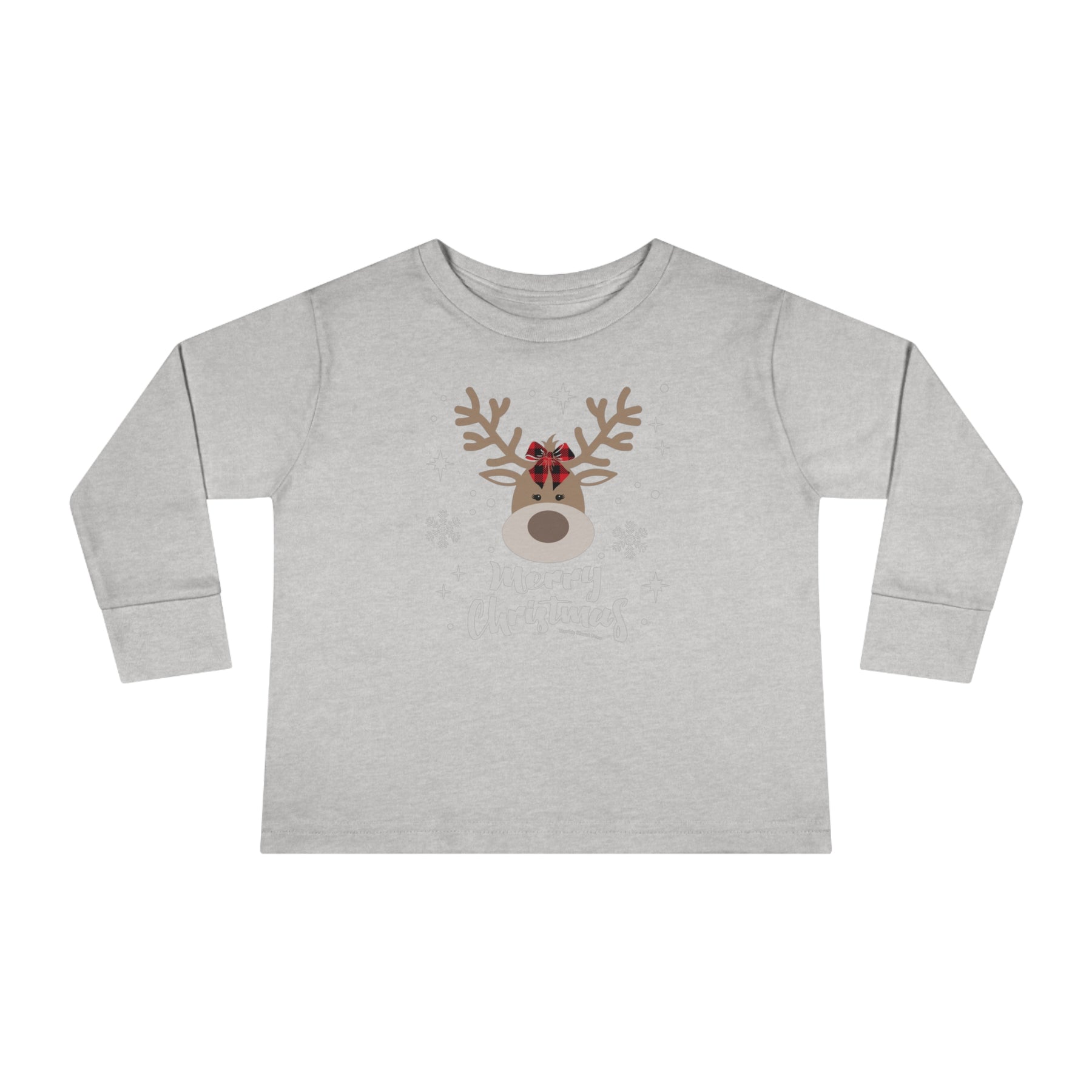 A toddler long-sleeve tee featuring a cute Christmas deer design, made of durable 100% combed ringspun cotton. Unisex fit with ribbed collar and EasyTear™ label for comfort and quality.