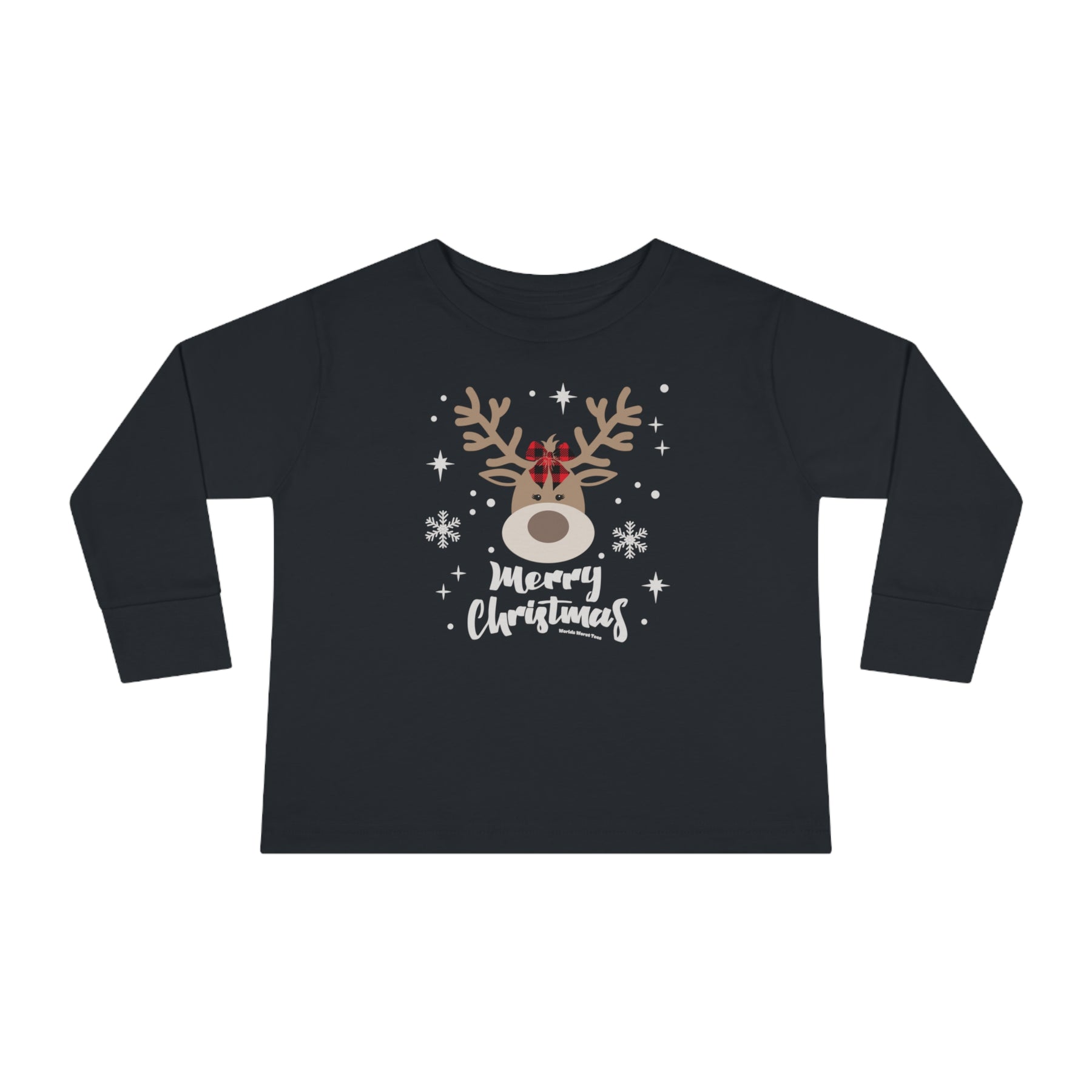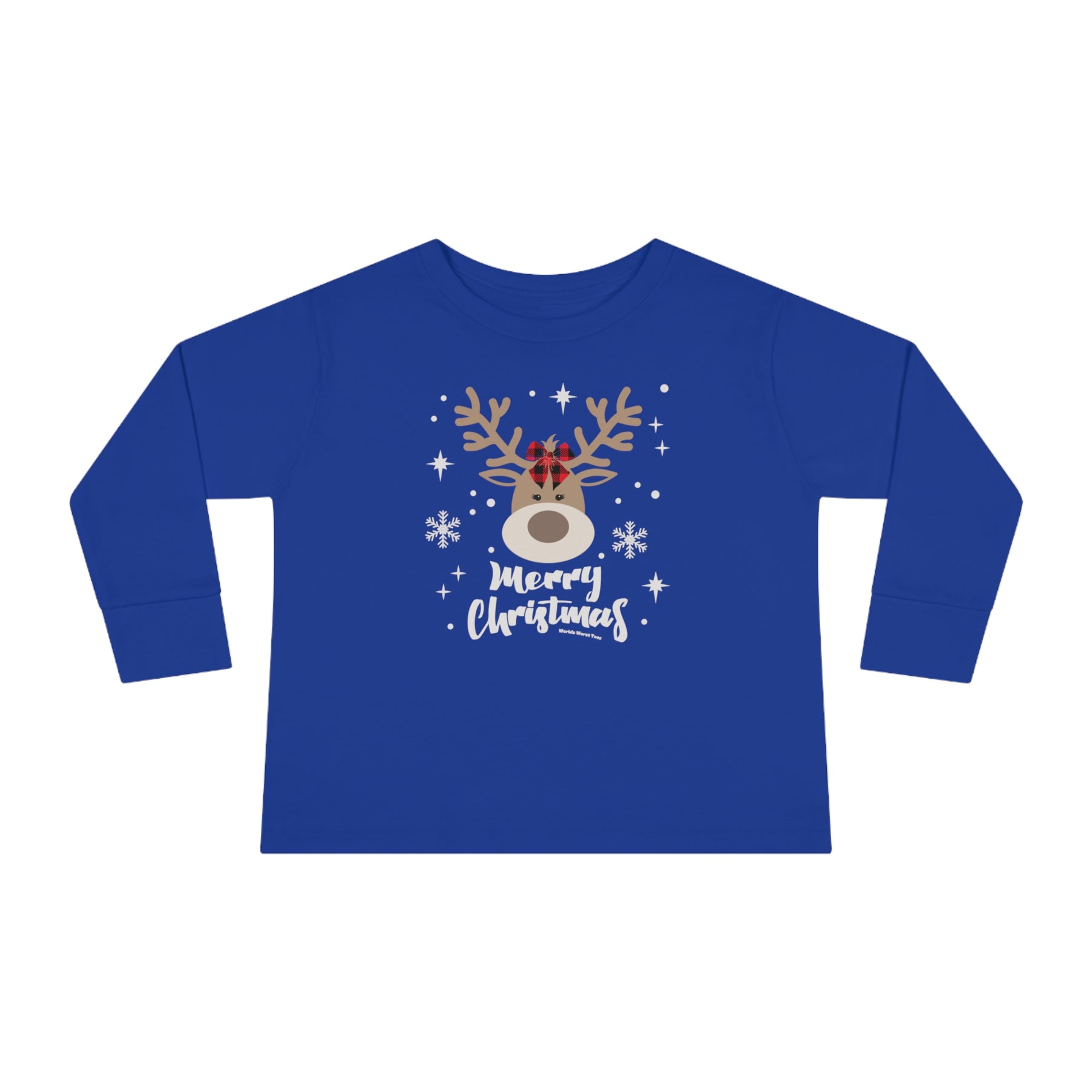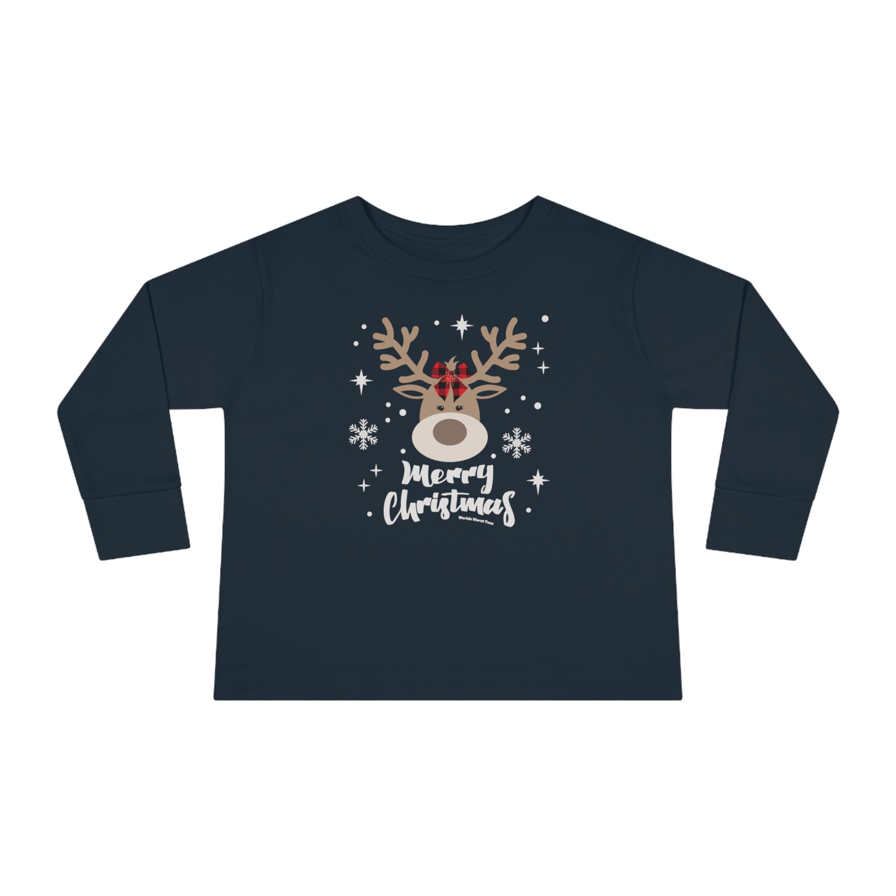 A toddler long-sleeve tee featuring a cute Christmas deer design, made of durable 100% combed ringspun cotton. Unisex fit with ribbed collar and EasyTear™ label for comfort and quality.