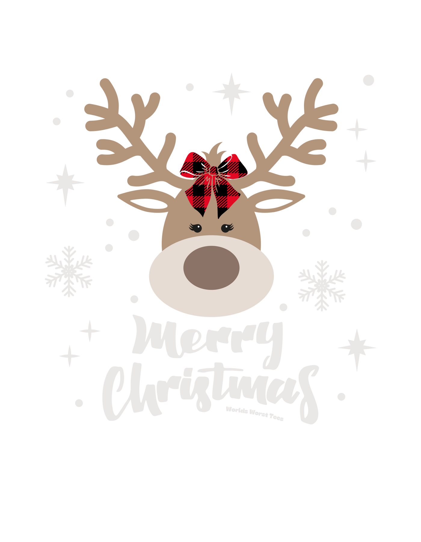 A custom toddler long-sleeve tee featuring a Girly Christmas Deer design with a reindeer wearing a bow. Made of 100% combed ringspun cotton, with a ribbed collar and EasyTear™ label for comfort and durability.
