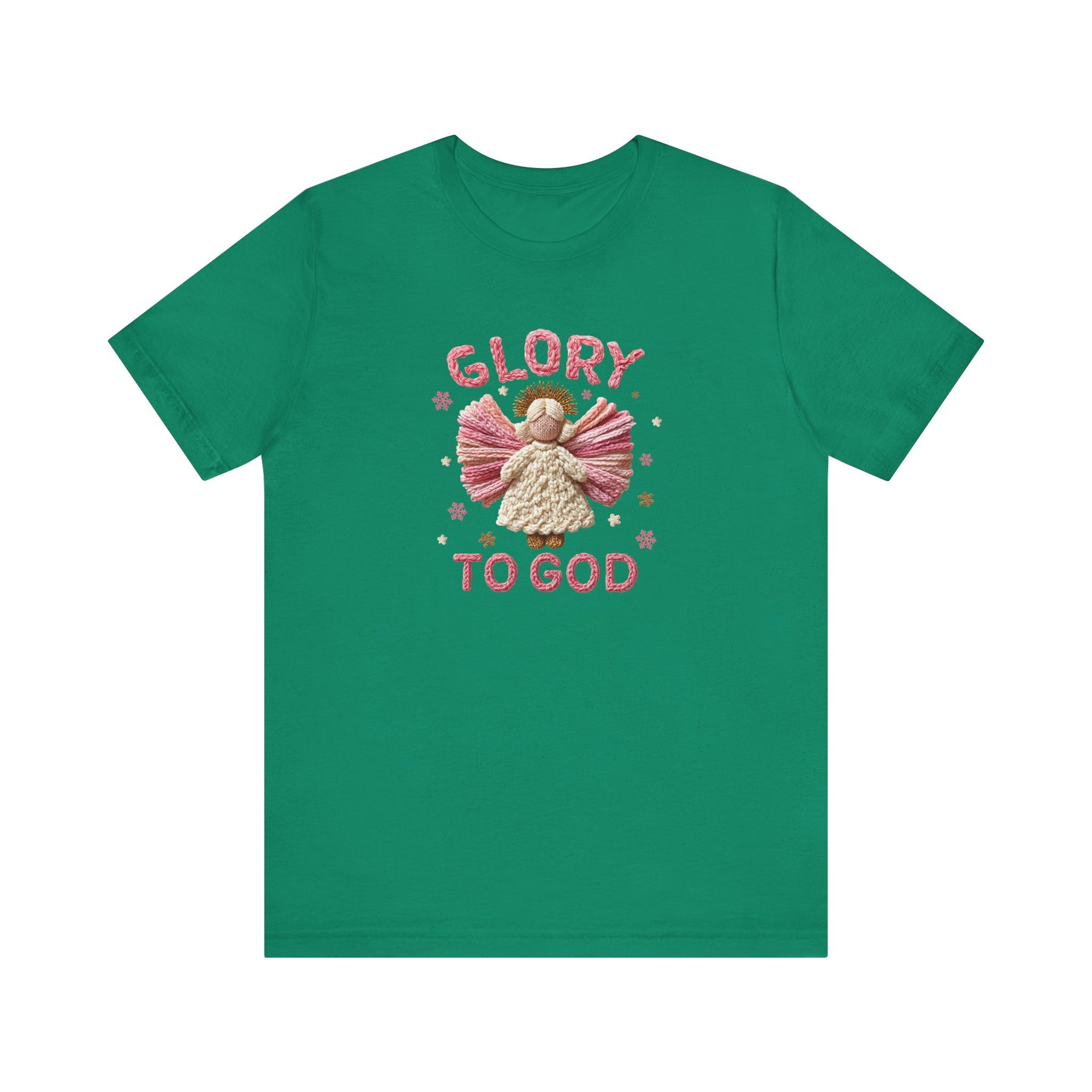 Green Glory to God Tee featuring a yarn-like angel graphic with pink wings, cream gown, and golden halo, surrounded by star shapes, emphasizing holiday spirit.