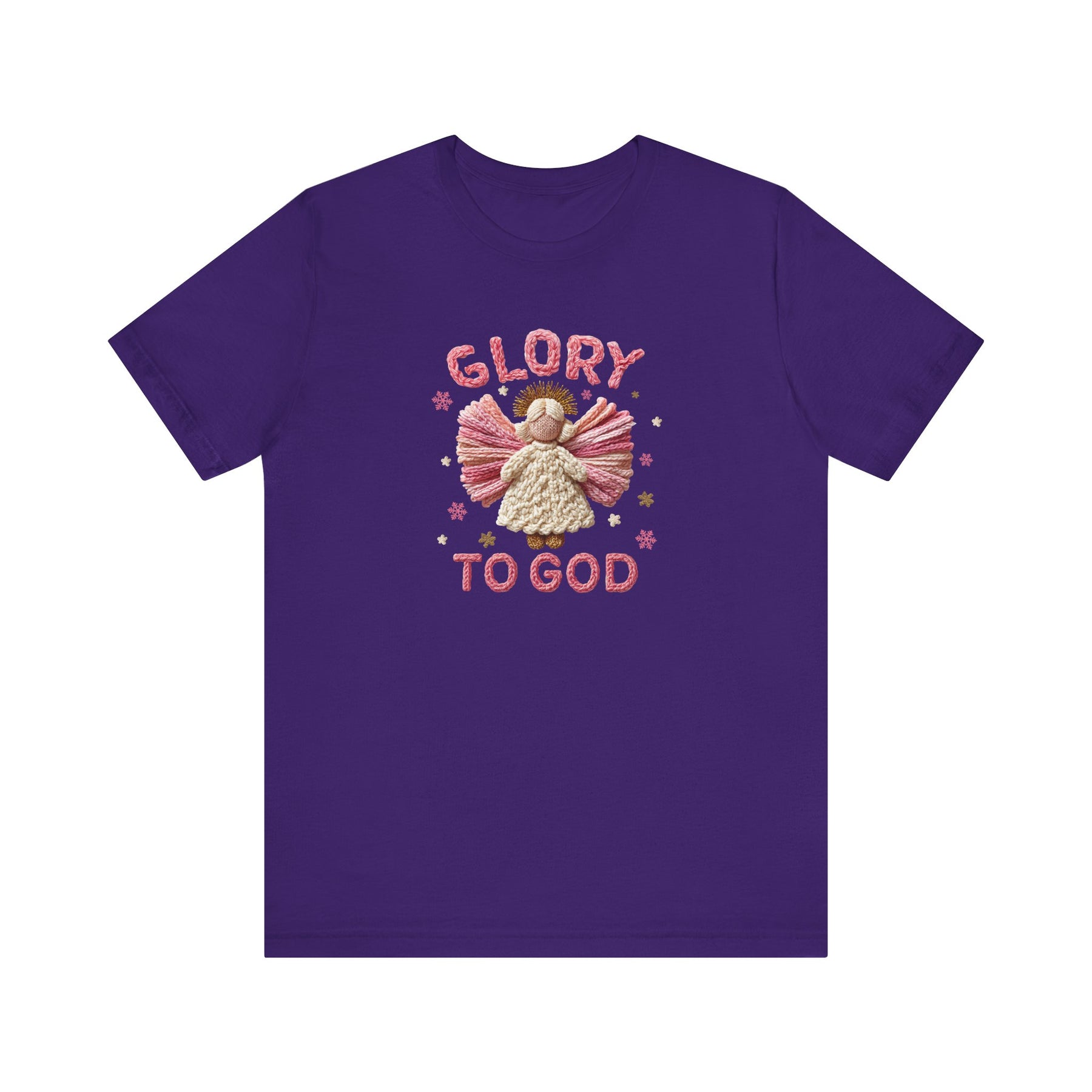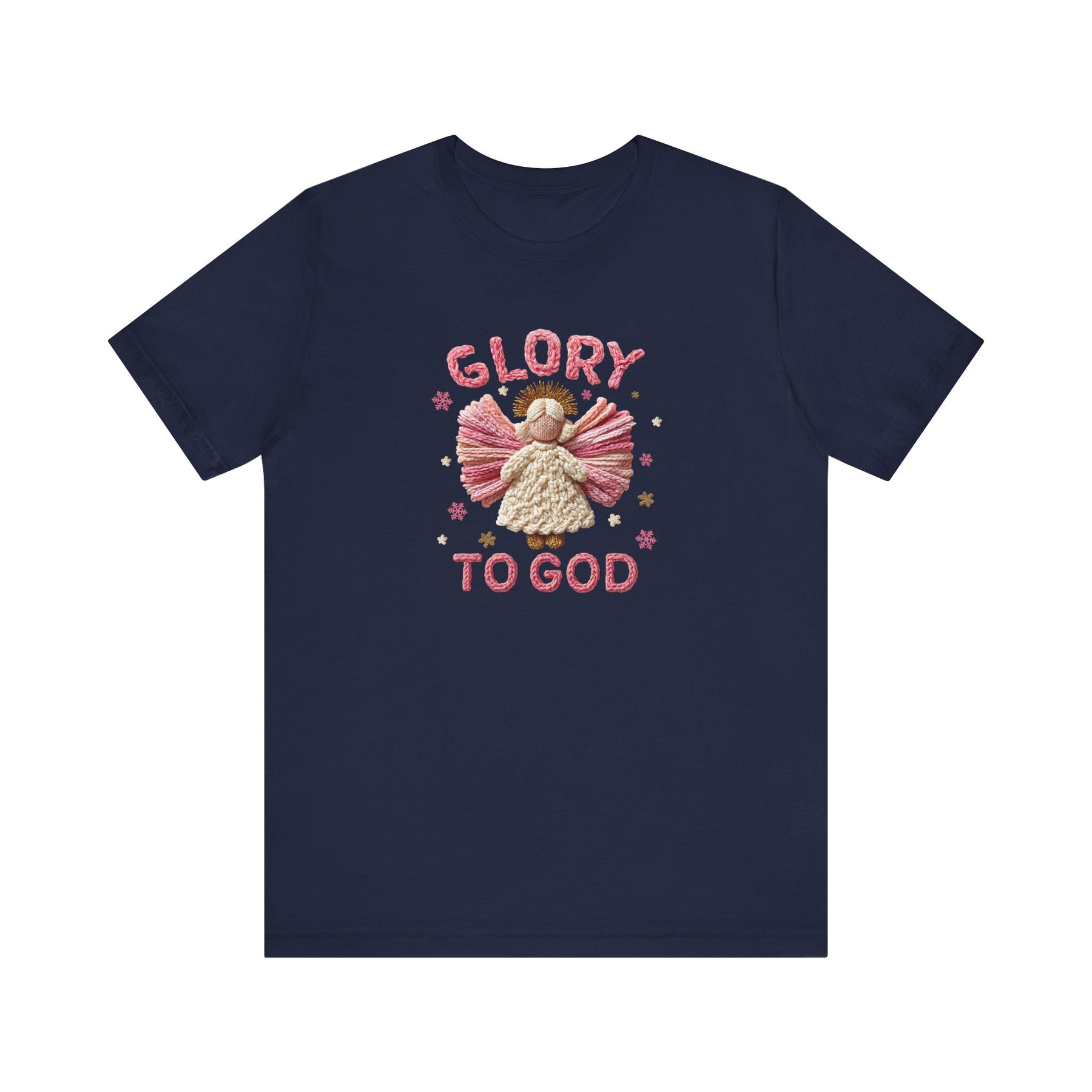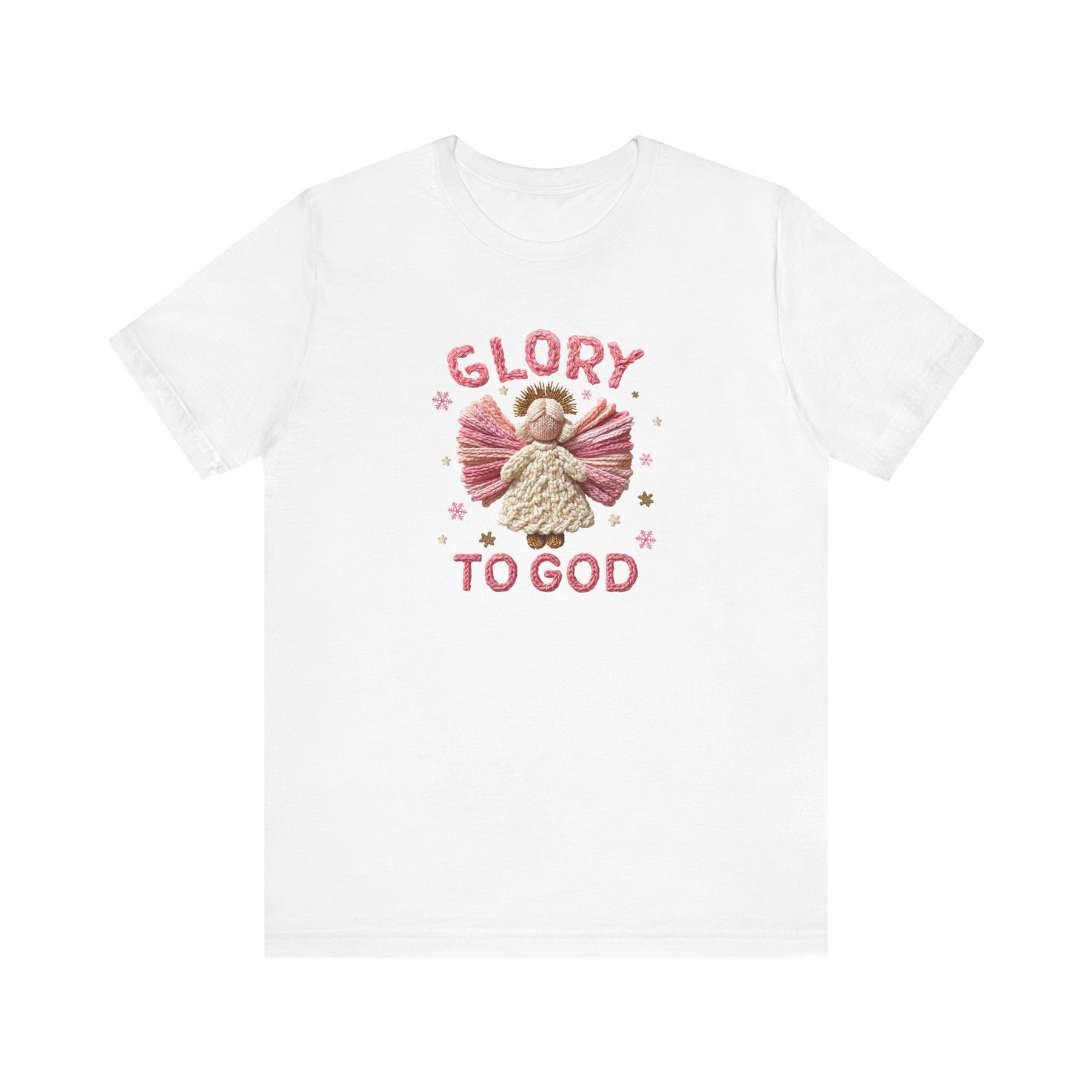 Glory to God Tee features an angel motif with GLORY TO GOD text, pink and gold festive accents; classic fit, soft cotton, unisex design.