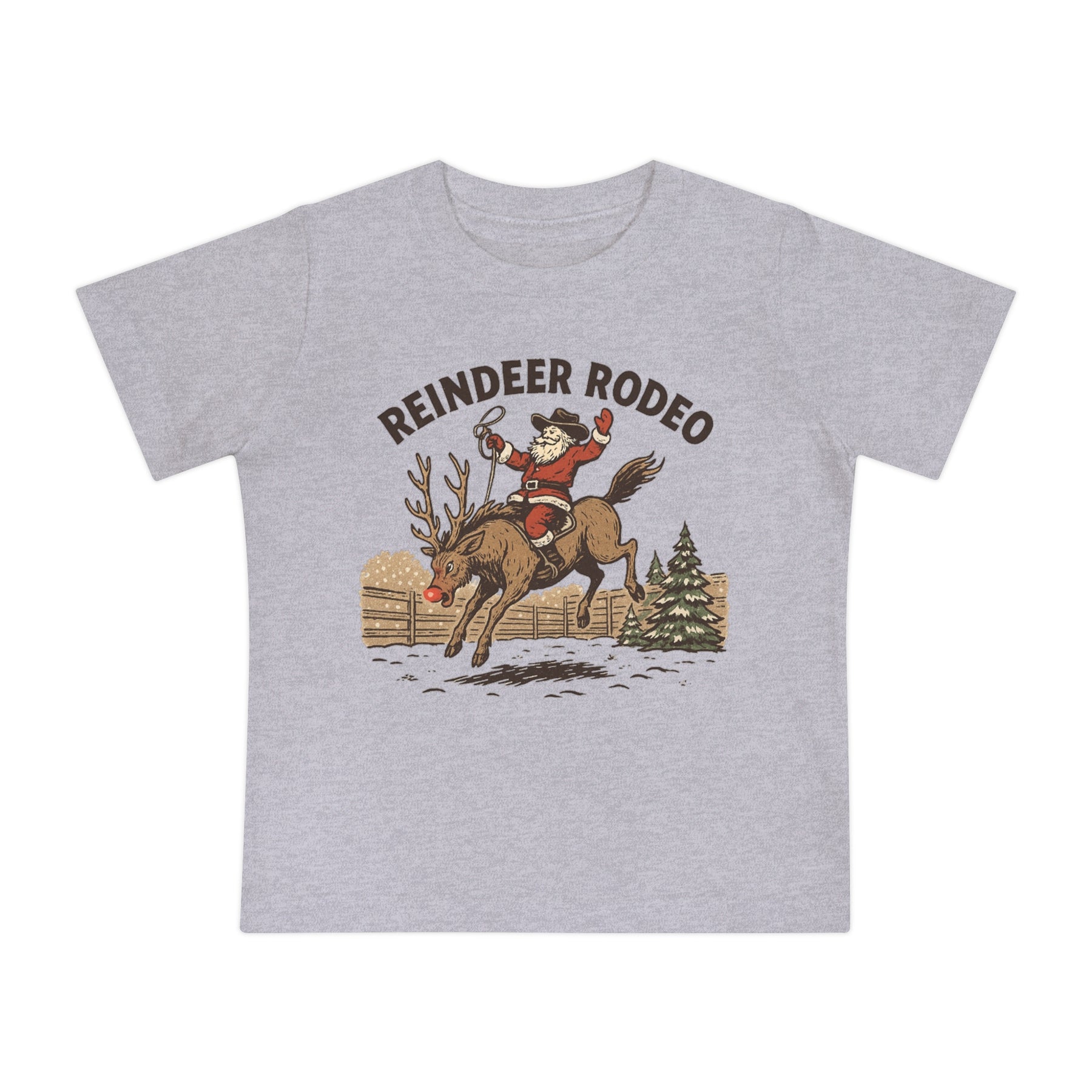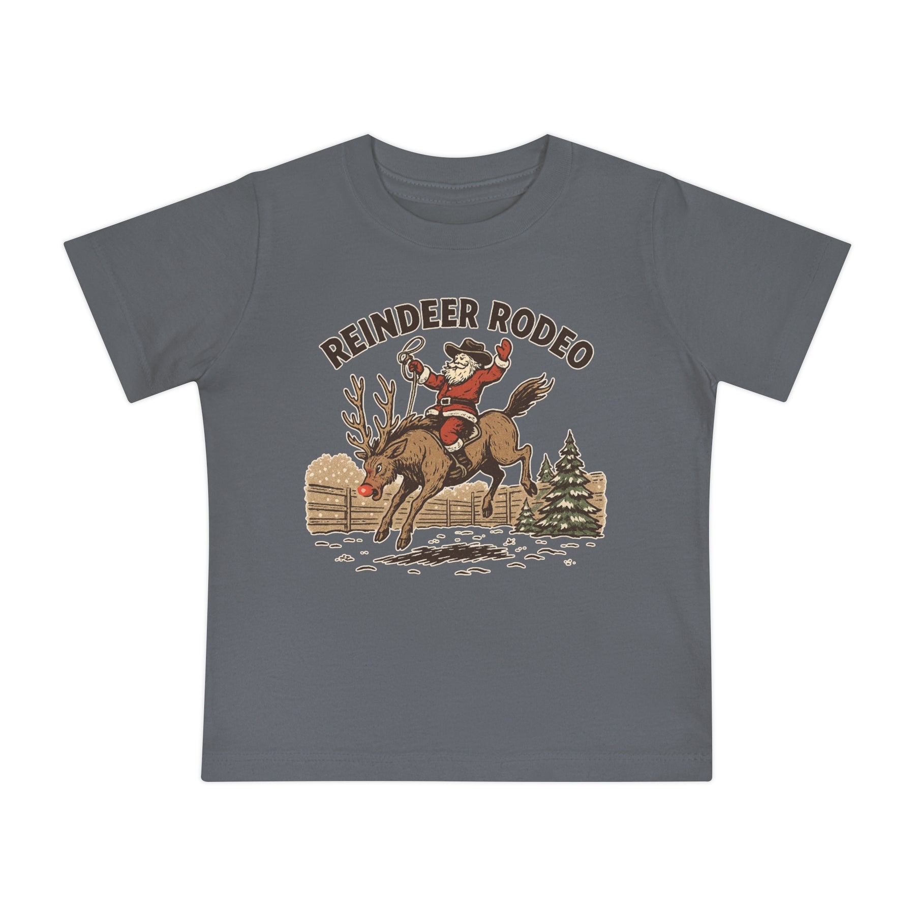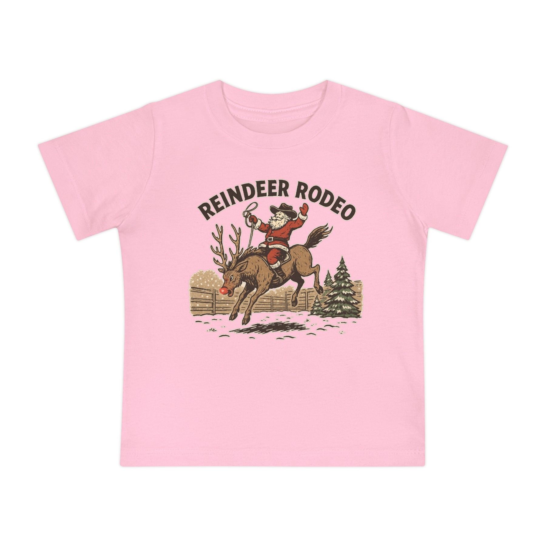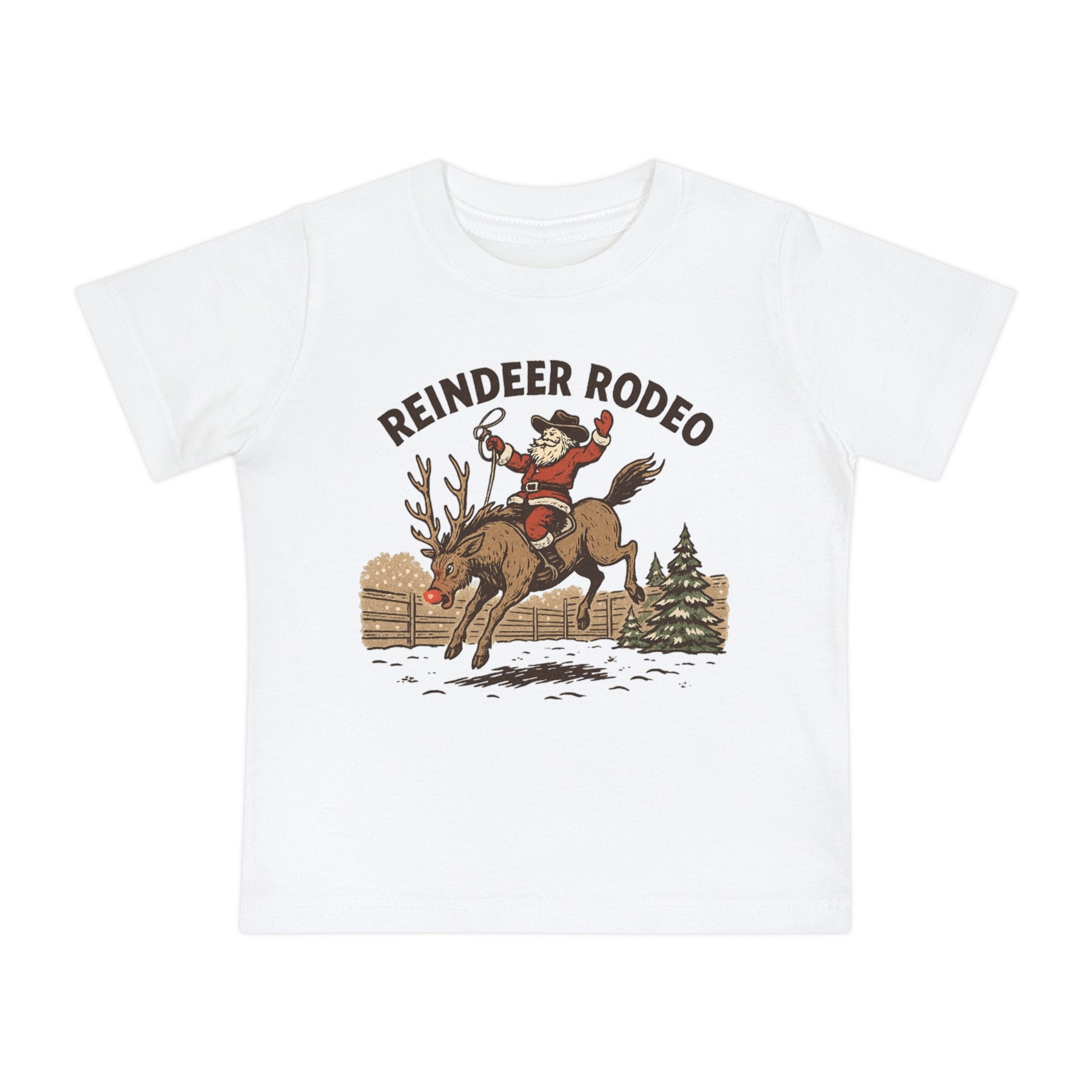 Reindeer Rodeo Baby Tee features Santa as a rodeo rider on a reindeer, with REINDEER RODEO text, ideal for stylish first steps in soft, durable cotton.