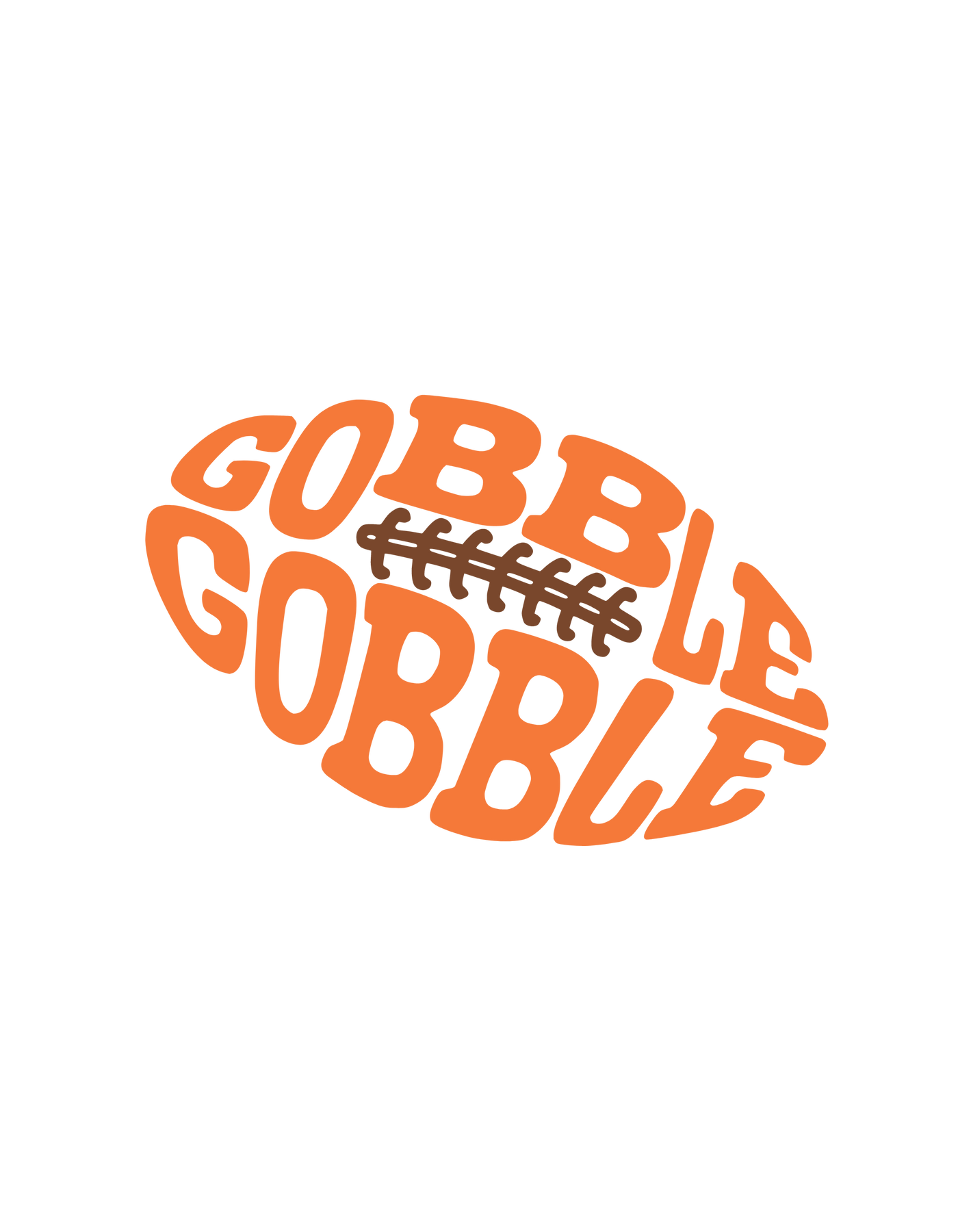 Graphic of 'GOBBLE GOBBLE' in orange, with football lace motif, on a cozy toddler sweatshirt by Faith Family Designs.