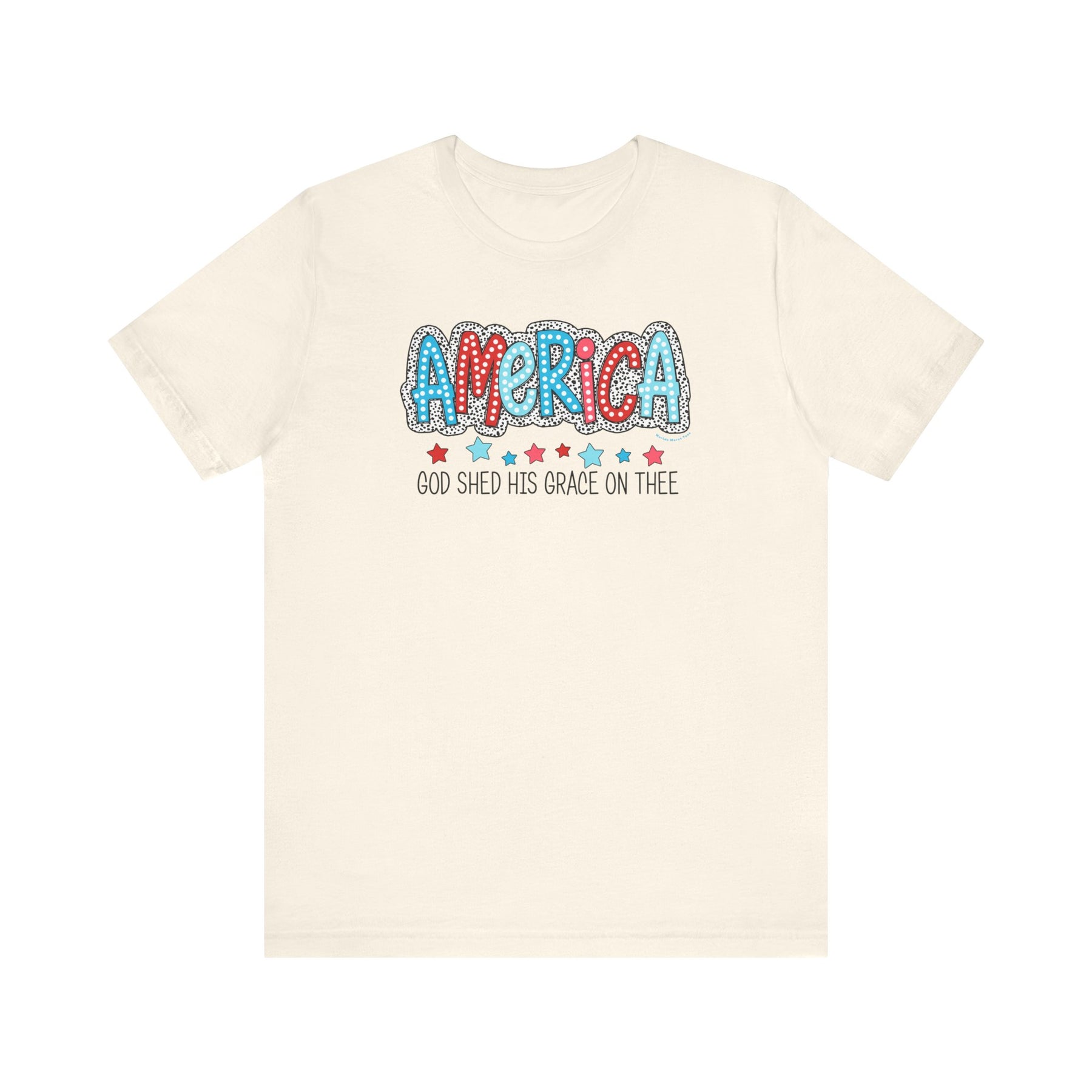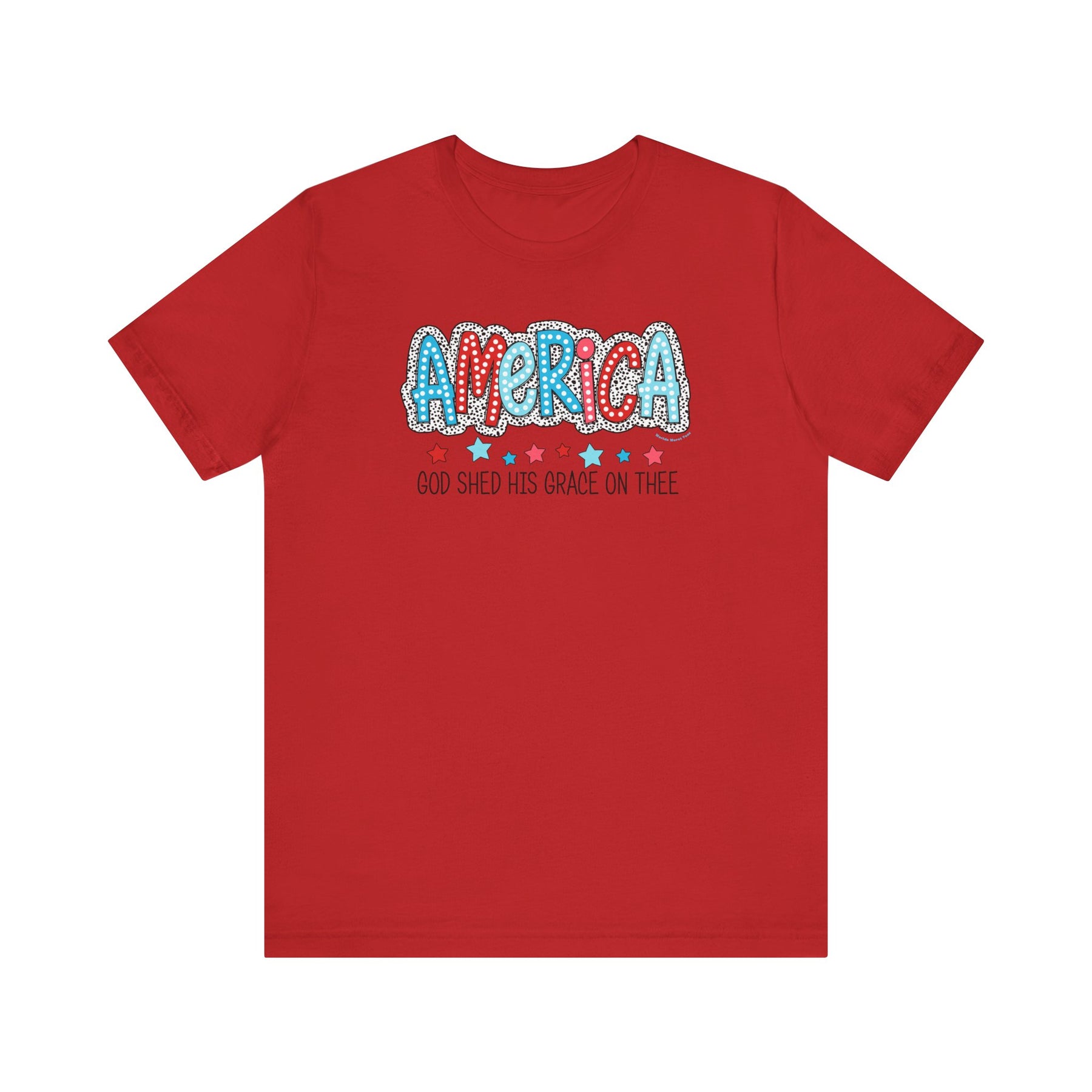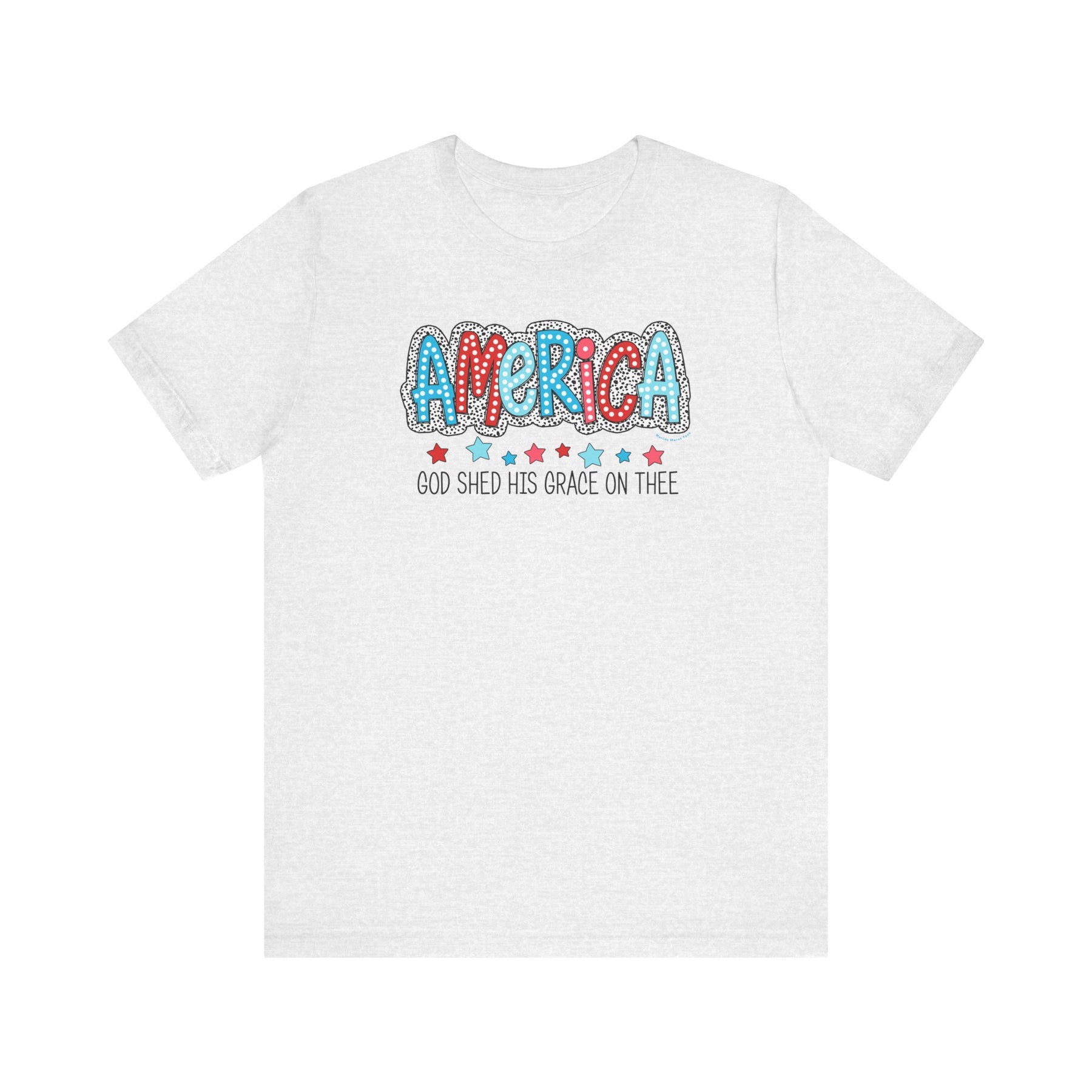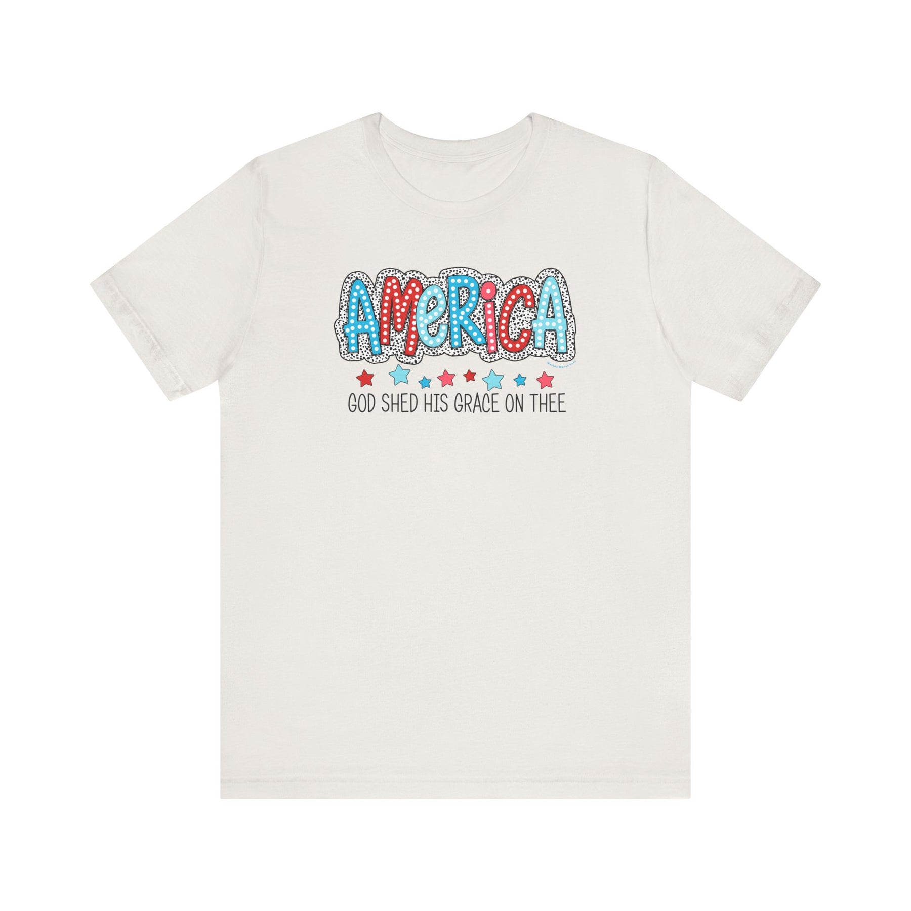 A classic white tee with red and blue text, featuring God Shed His Grace on Thee design. Unisex jersey shirt made of 100% cotton, retail fit, tear away label, and ribbed knit collars for comfort.