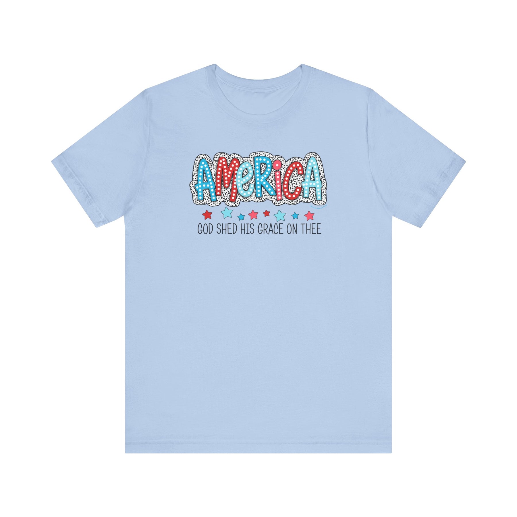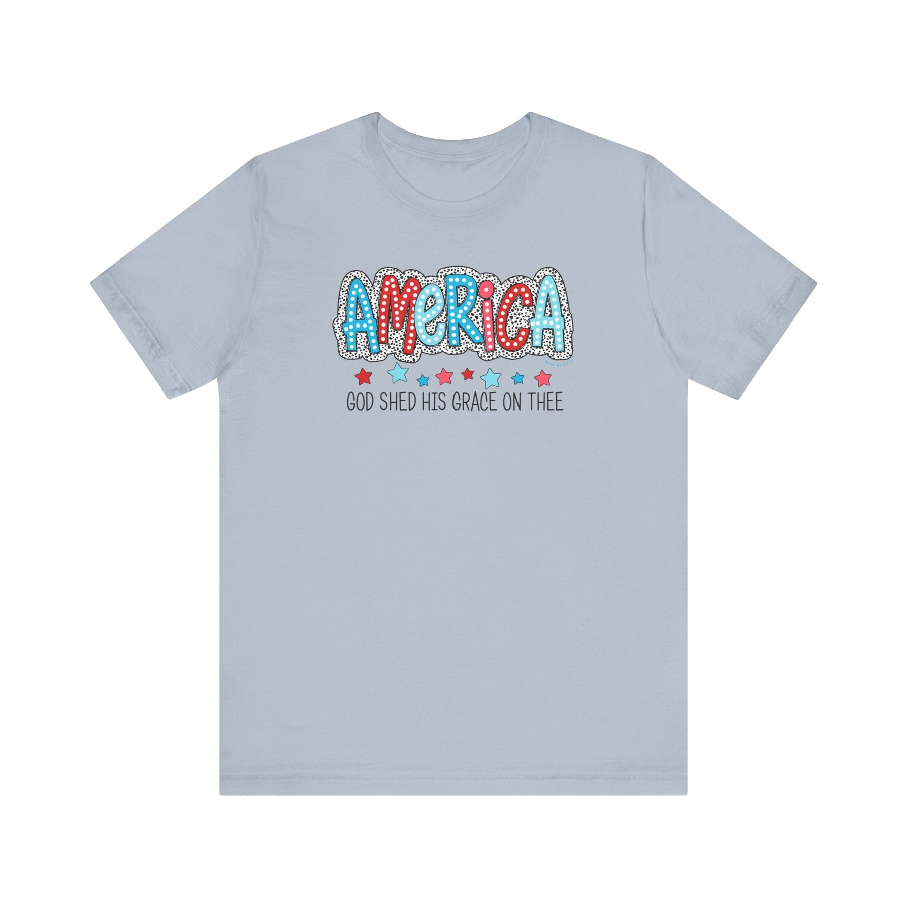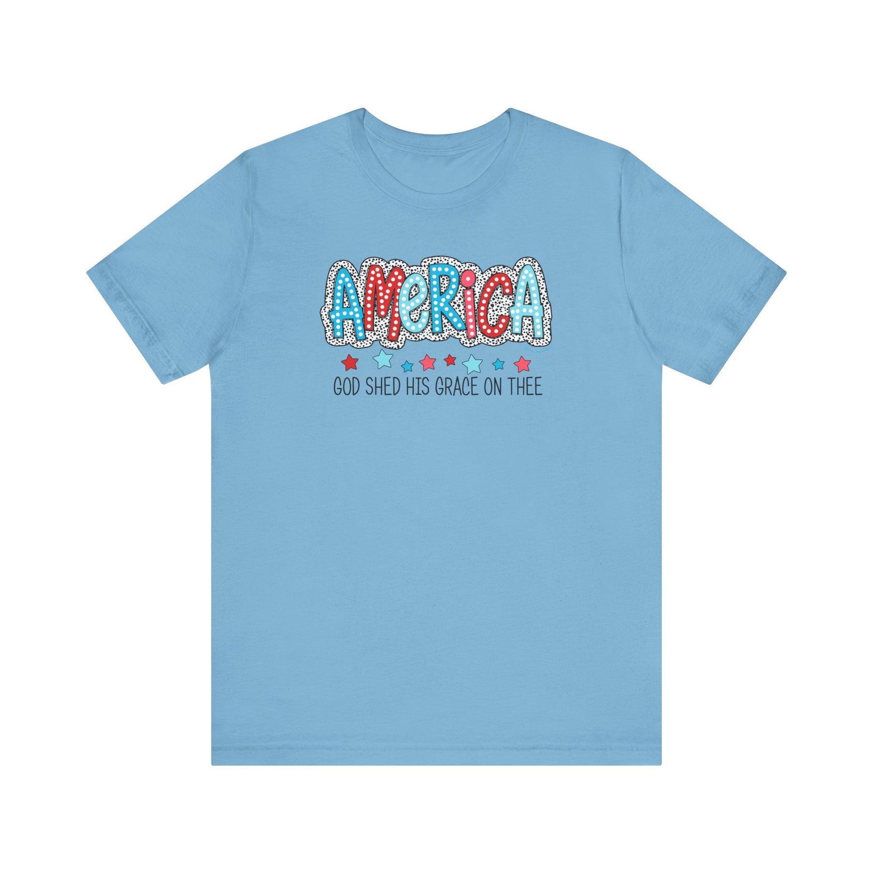 A classic white tee with red and blue text, featuring God Shed His Grace on Thee design. Unisex jersey shirt made of 100% cotton, retail fit, tear away label, and ribbed knit collars for comfort.
