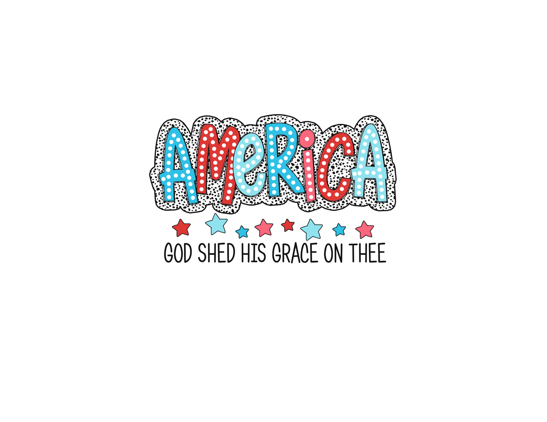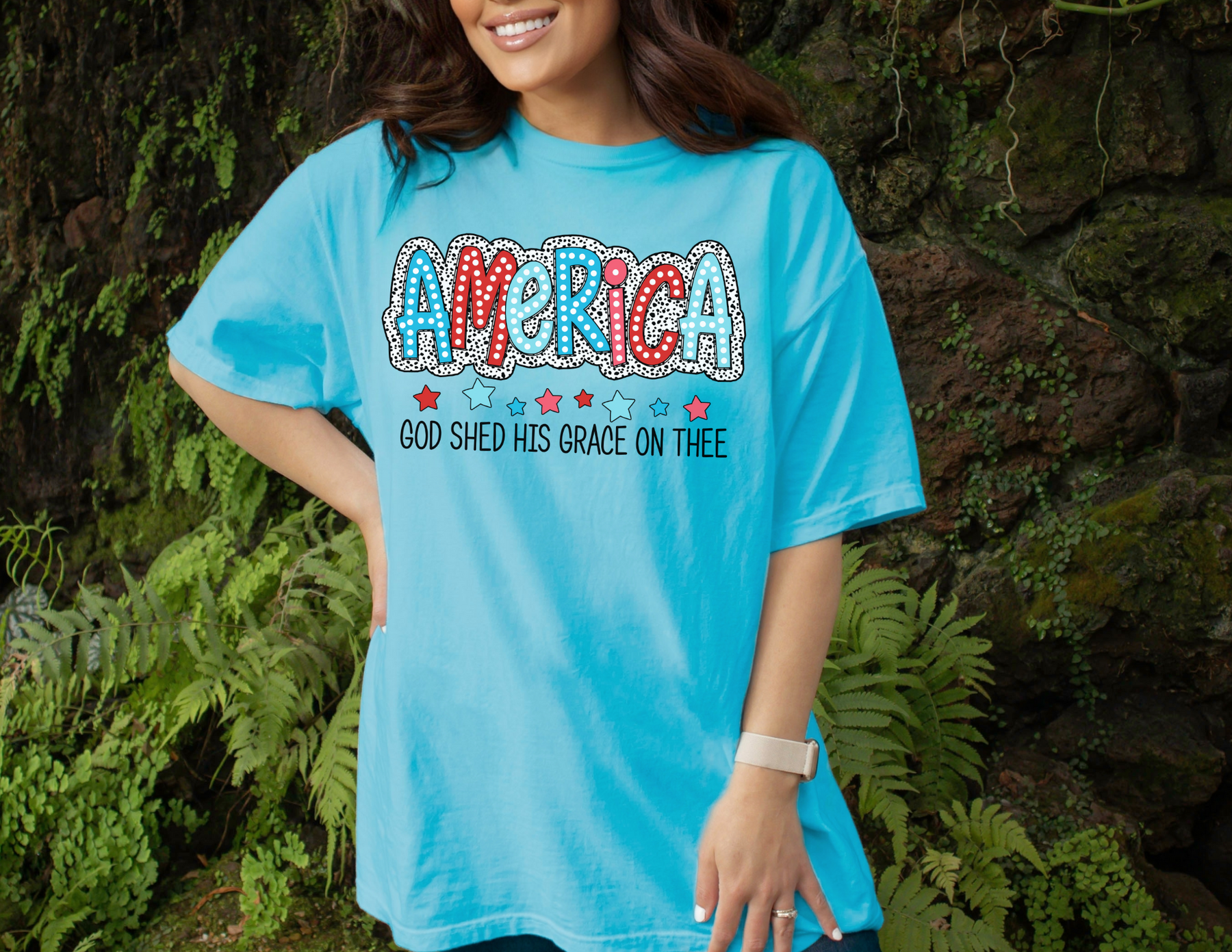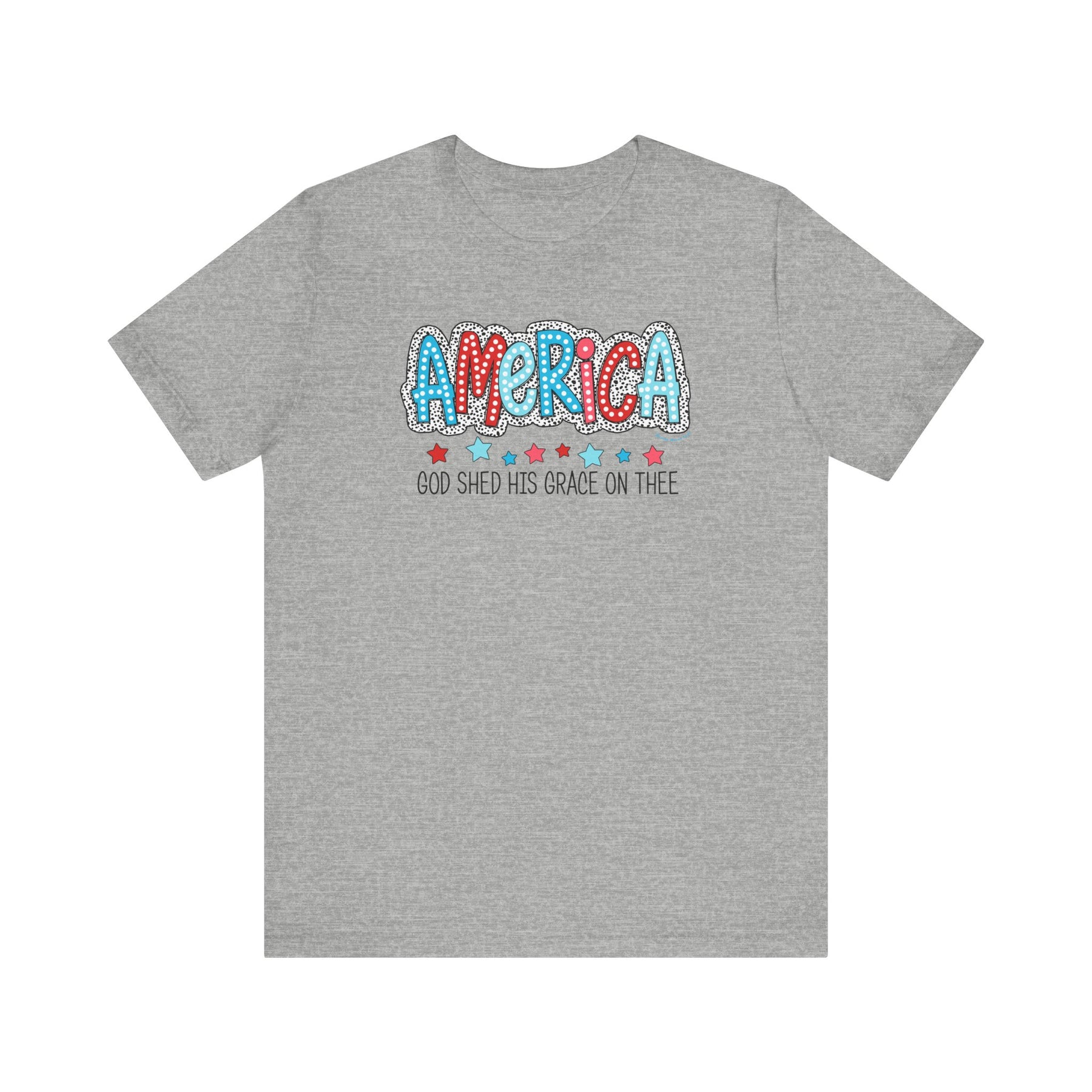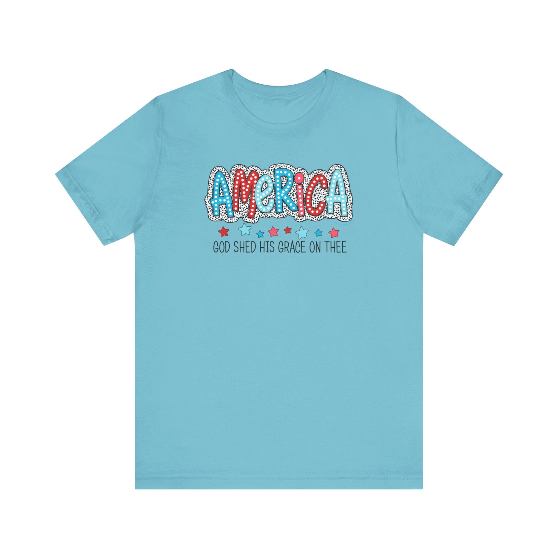 A classic white tee with red and blue text, featuring God Shed His Grace on Thee design. Unisex jersey shirt made of 100% cotton, retail fit, tear away label, and ribbed knit collars for comfort.