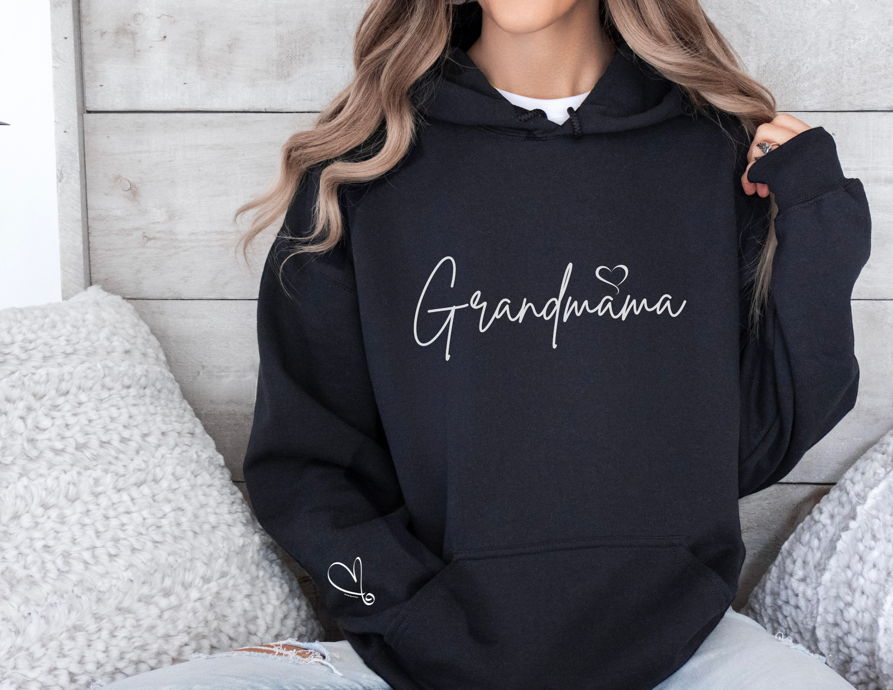 Grandmama Hoodie is a unisex heavy blend hooded sweatshirt which is relaxation itself. The material is a thick blend of cotton and polyester. This makes for a plush, soft feel alongside warmth. It's also a great surface for printing. There are no side seams. A spacious kangaroo pocket hangs in front. The hood's drawstring is the same color as the base sweater.