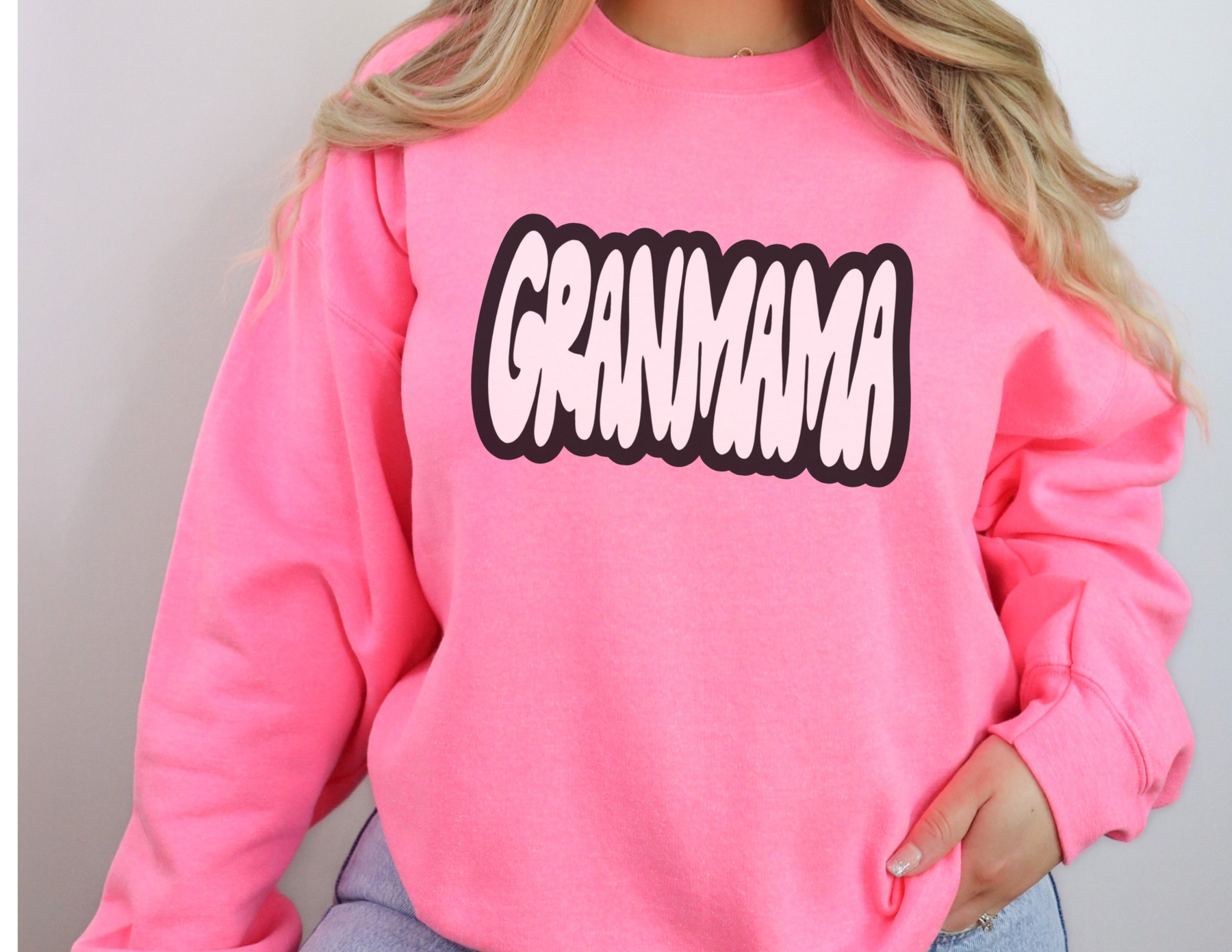 A heavy blend crewneck sweatshirt, Granmama Crew, in pink, featuring ribbed knit collar for shape retention. Unisex, 50% cotton, 50% polyester, loose fit, medium-heavy fabric. Sizes S-5XL.