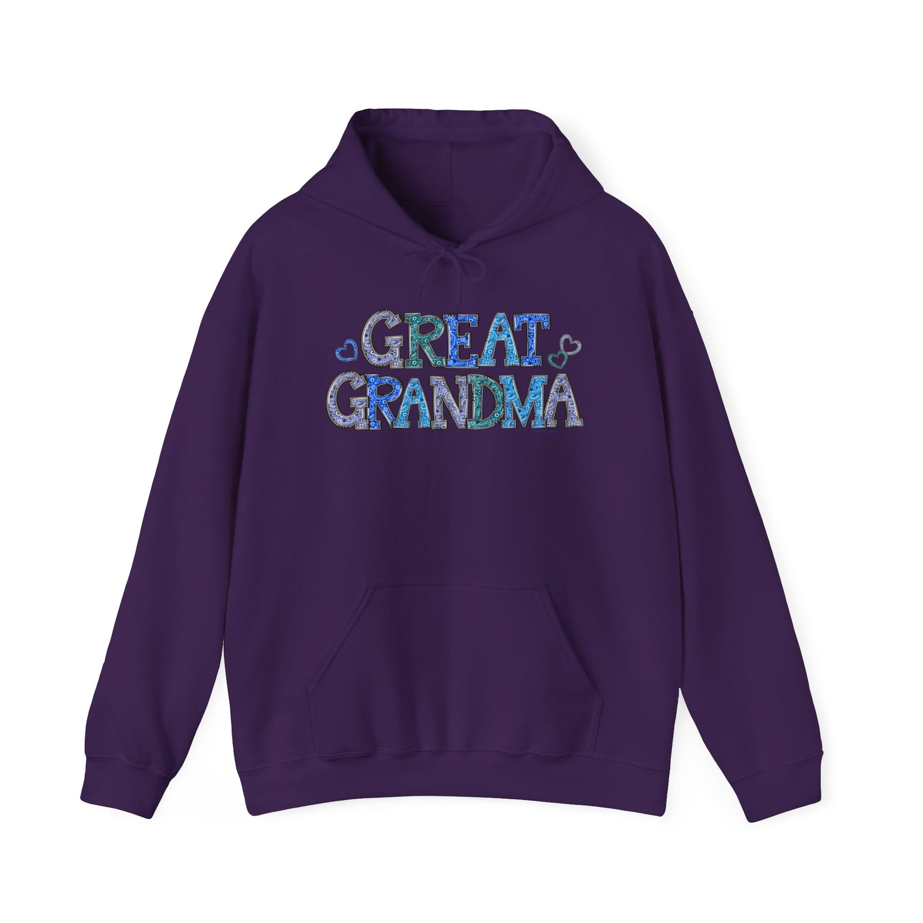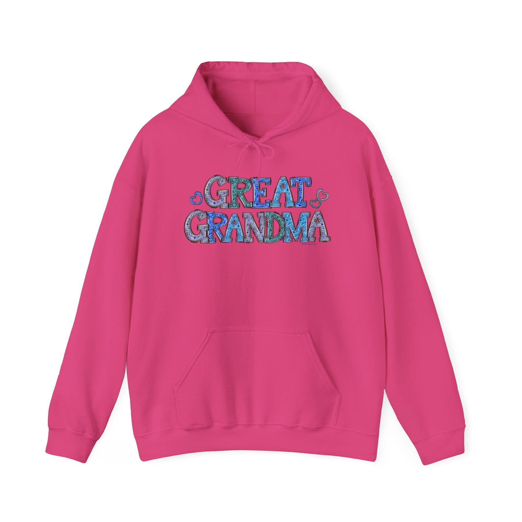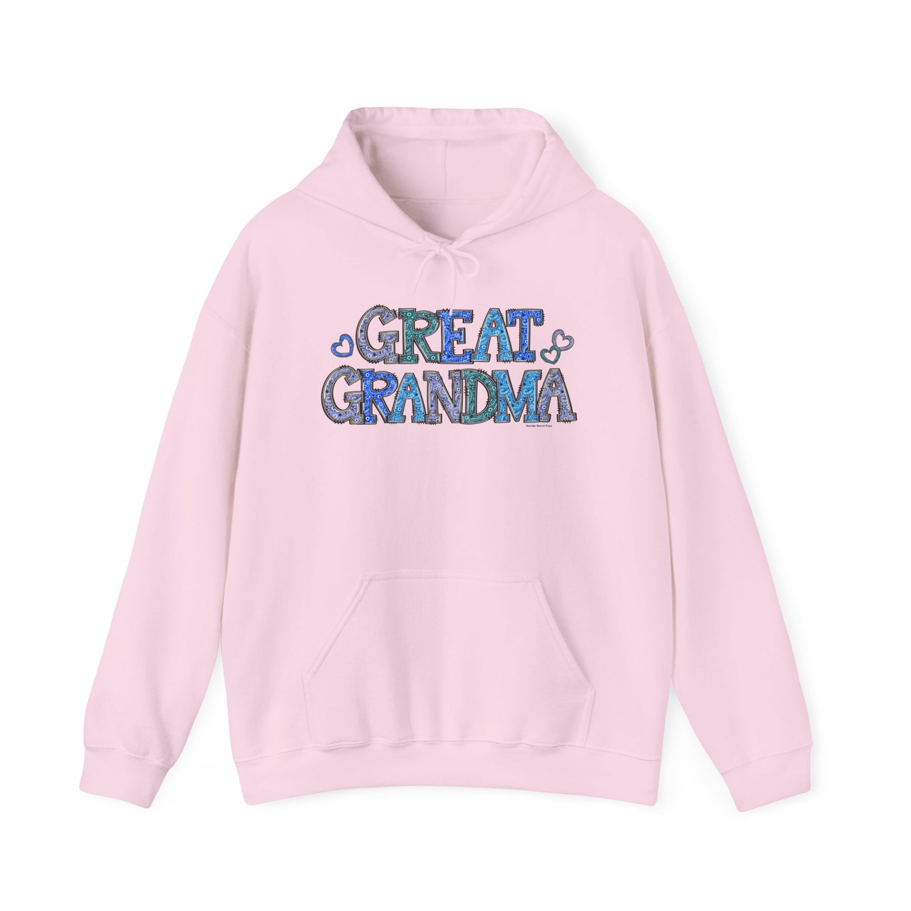 A cozy Great Grandma Hoodie in pink with blue text. Unisex heavy blend sweatshirt, cotton-polyester mix for warmth. Kangaroo pocket, matching drawstring hood. Ideal for chilly days.