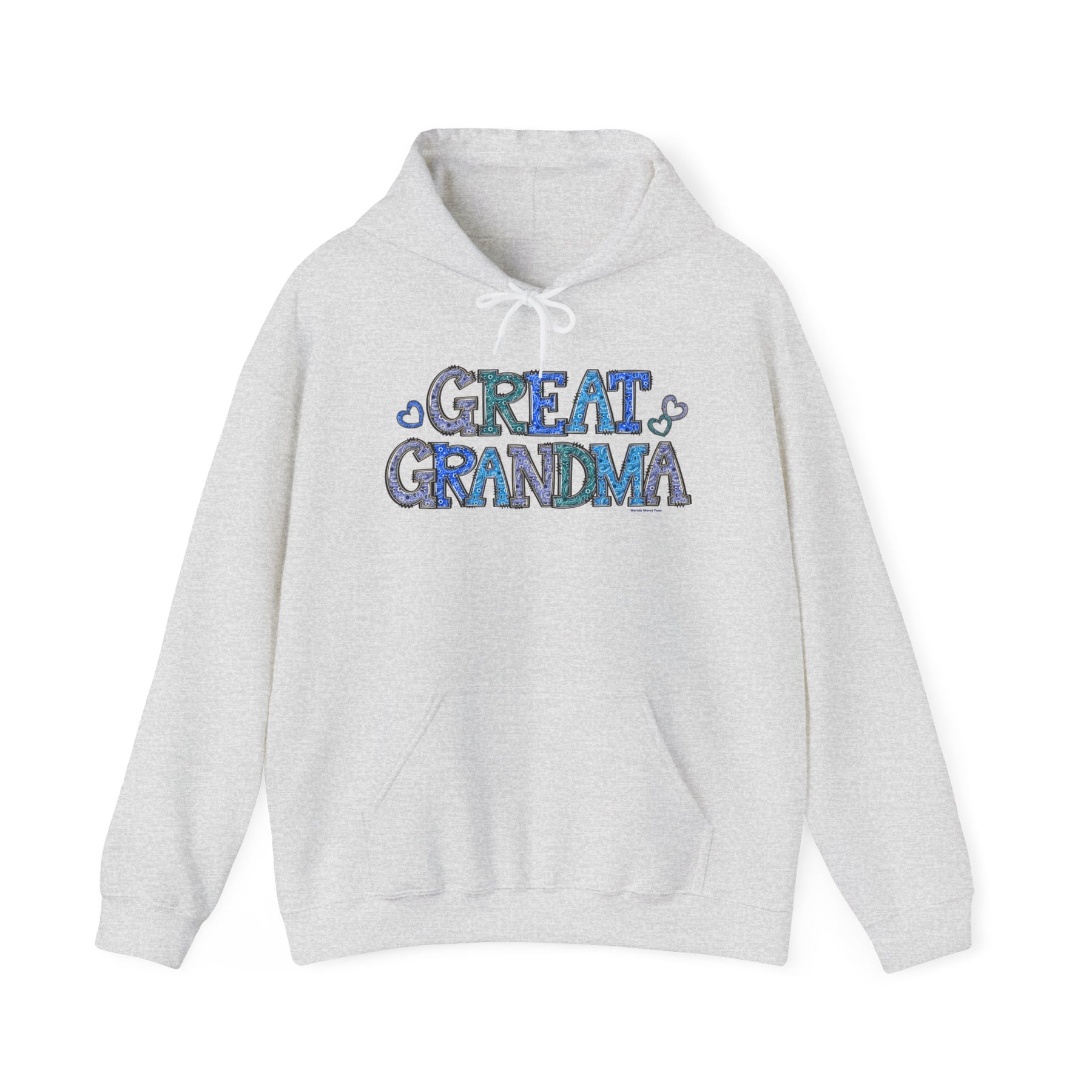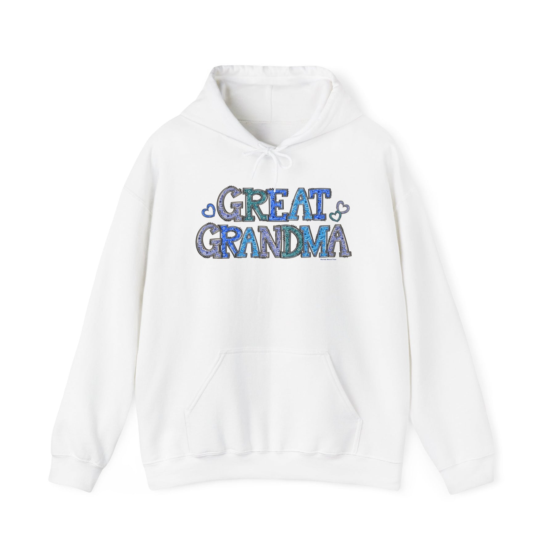 Great Grandma Hoodie: A white sweatshirt with blue text, featuring a classic fit and a kangaroo pocket for practicality. Made of 50% cotton and 50% polyester for warmth and comfort.