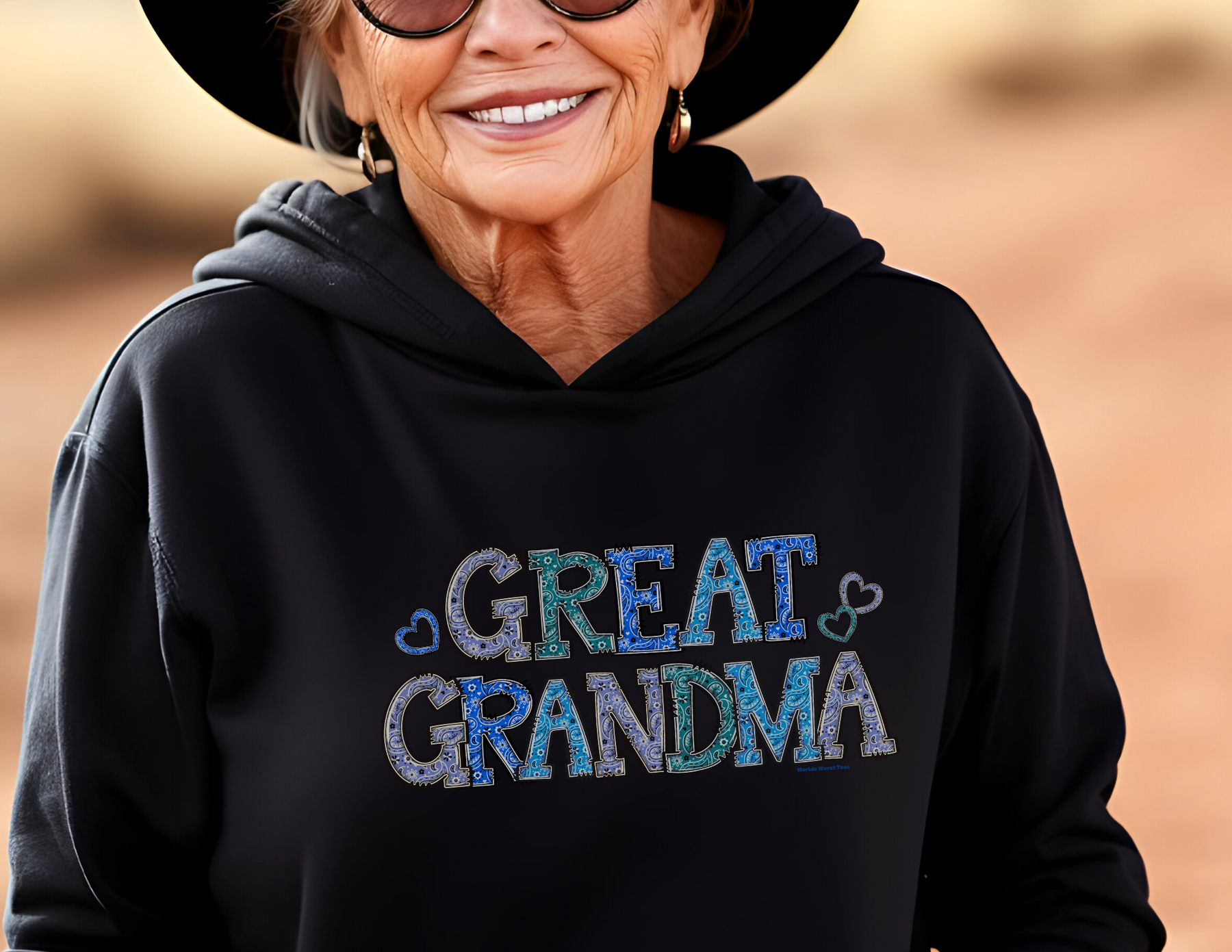 Great Grandma Hoodie: Unisex black sweatshirt with a grey hoodie and blue text. Thick cotton-polyester blend for warmth and comfort. Kangaroo pocket and matching drawstring. Classic fit, tear-away label.