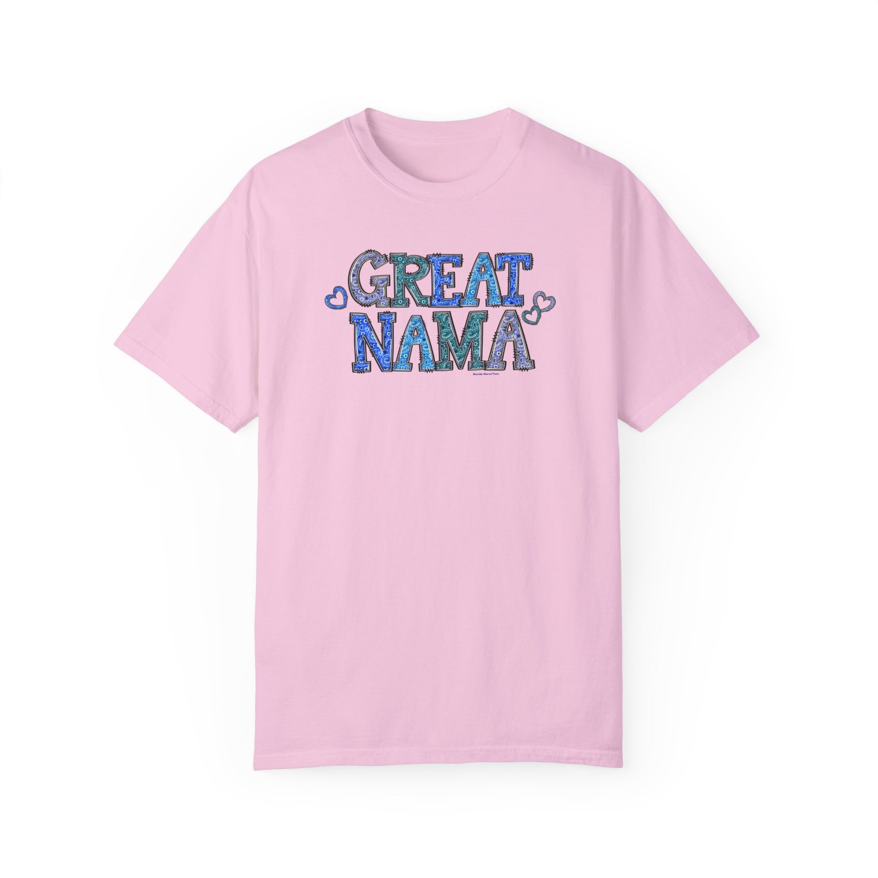 A relaxed fit Great Nama Tee in pink with blue text. 100% ring-spun cotton, garment-dyed for coziness. Double-needle stitching for durability, no side-seams for shape retention. Ideal for daily wear.